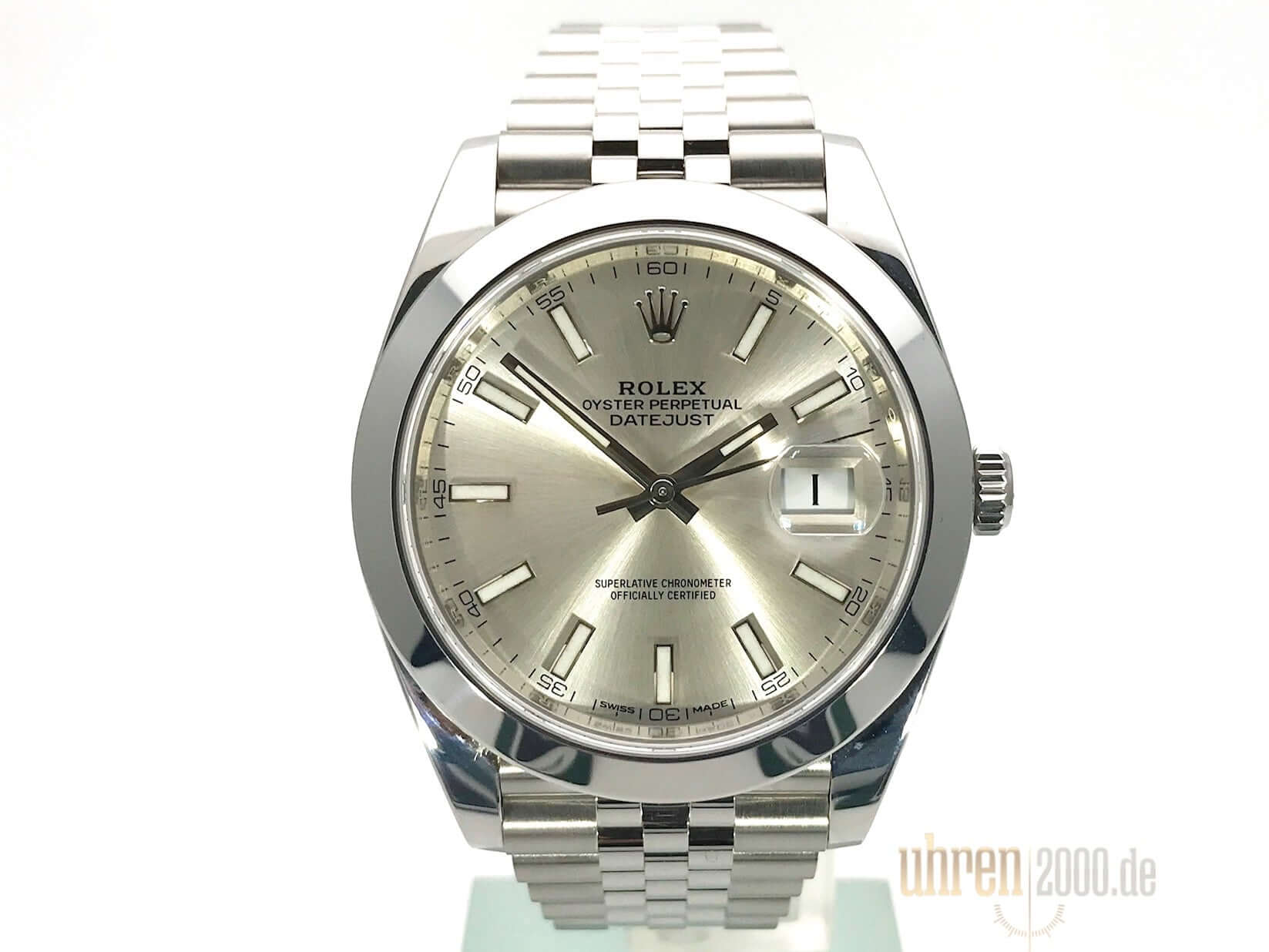 Gehäuse aus Edelstahl poliert und satiniert, Gehäusedurchmesser 41 mm, polierte Edelstahl Lünette, Jubile Edelstahlband poliert und satiniert mit Faltschließe, silberfarbenes Zifferblatt mit 18 kt Weißgold LeuchtIndizes, Leuchtzeiger, Automatikwerk, Rolex Manufakturkaliber 3235, 70 Stunden Gangreserve, Datumsanzeige, Chronometer, kratzfestes Saphirglas, verschraubte Krone, Edelstahlboden verschraubt, Wasserdicht bis zu 10 bar.
