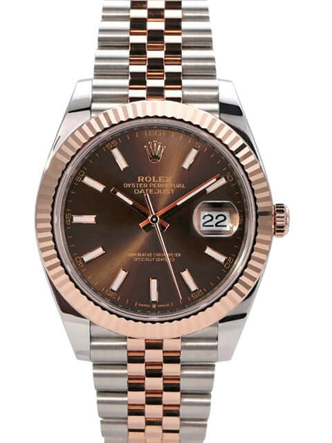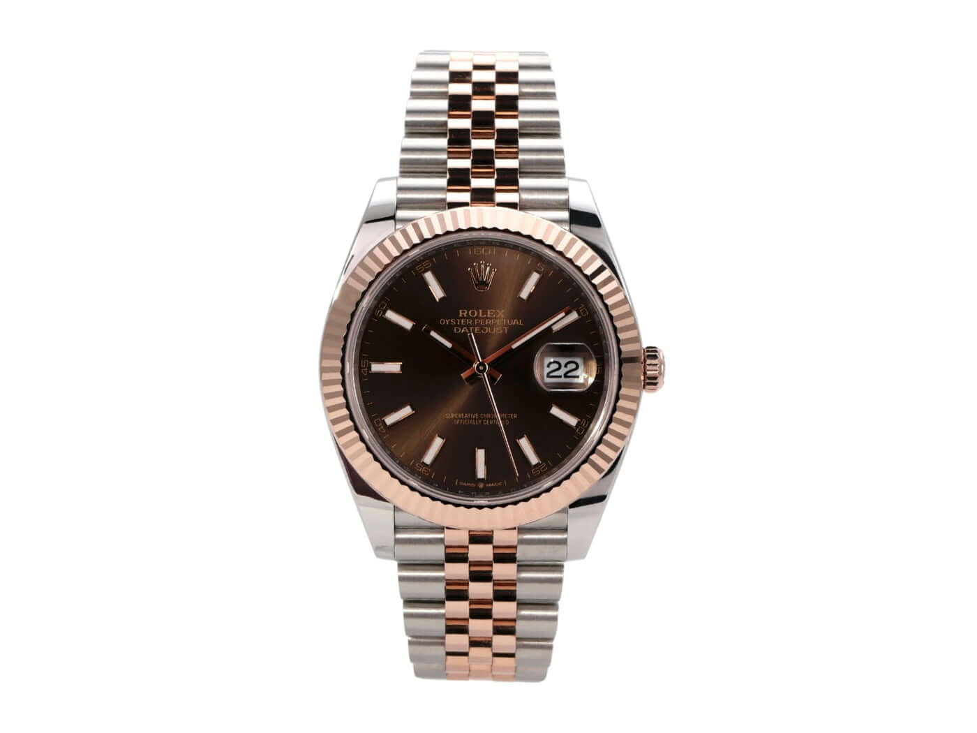 Gehäuse aus Edelstahl / Everose-Gold poliert und satiniert, Gehäusedurchmesser 41 mm, geriffelte 18 kt Everose-Gold Lünette, Jubile Armband aus Edelstahl / 18 kt Everose-Gold poliert und satiniert mit Faltschließe, Zifferblatt Choco mit 18 kt Everose-Gold Leuchtindizes, Automatikwerk, Rolex Manufakturkaliber 3235, Chronometer, 70 Stunden Gangreserve, Datumsanzeige, kratzfestes Saphirglas, verschraubte 18 kt Everose-Gold Krone, Edelstahlboden verschraubt, Wasserdicht bis zu 10 bar.