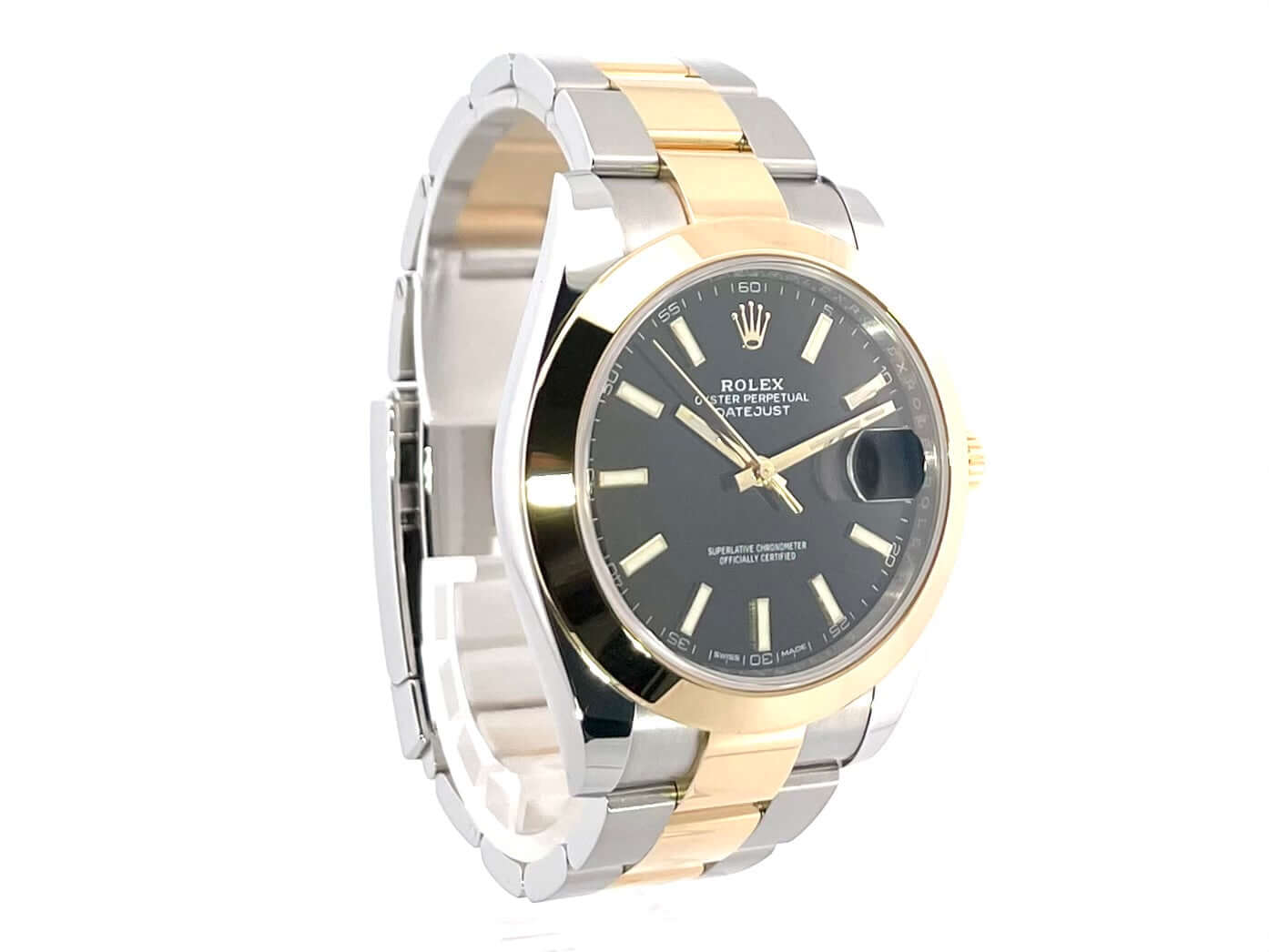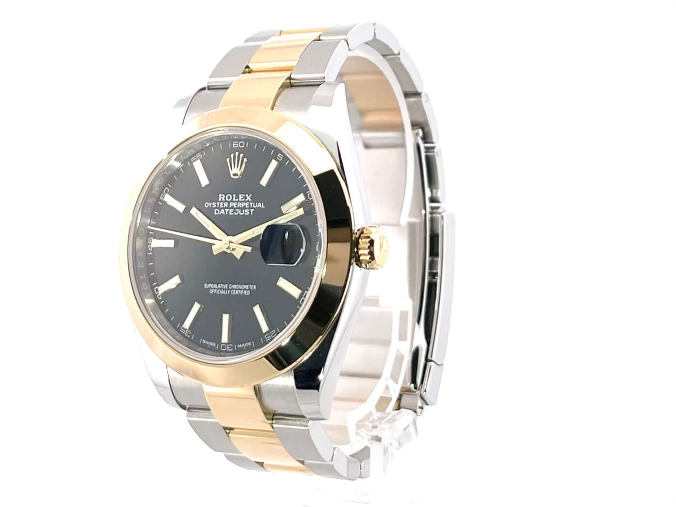 Gehäuse aus Edelstahl / Gelbgold poliert und satiniert, Gehäusedurchmesser 41 mm, polierte 18 kt Gelbgold Lünette, Oyster Armband aus Edelstahl / 18 kt Gelbgold poliert und satiniert mit Faltschließe, schwarzes Zifferblatt mit 18 kt Gelbgold Leuchtindizes, 18 kt Gelbgold Leuchtzeiger, Automatikwerk, Rolex Manufakturkaliber 3235, 70 Stunden Gangreserve, Datumsanzeige, Chronometer, kratzfestes Saphirglas, verschraubte 18 kt Gelbgold Krone, Edelstahlboden verschraubt, Wasserdicht bis zu 10 bar.