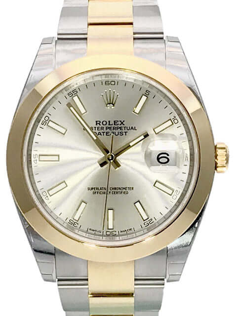 Gehäuse aus Edelstahl / Gelbgold poliert und satiniert, Gehäusedurchmesser 41 mm, polierte 18 kt Gelbgold Lünette, Oyster Armband aus Edelstahl / 18 kt Gelbgold poliert und satiniert mit Faltschließe, silberfarbenes Zifferblatt mit 18 kt Gelbgold LeuchtIndexen, 18 kt Gelbgold Leuchtzeiger, Automatikwerk, Rolex Manufakturkaliber 3235, Chronometer, 70 Stunden Gangreserve, Datumsanzeige, kratzfestes Saphirglas, verschraubte 18 kt Gelbgold Krone, Edelstahlboden verschraubt, Wasserdicht bis zu 10 bar.