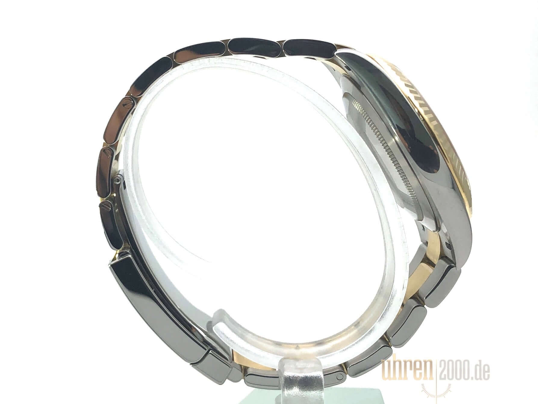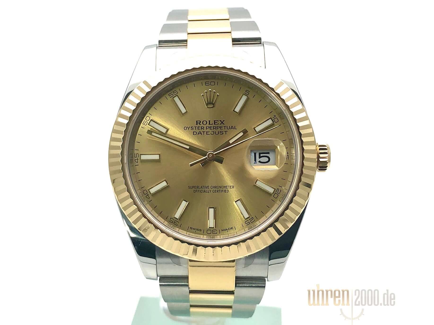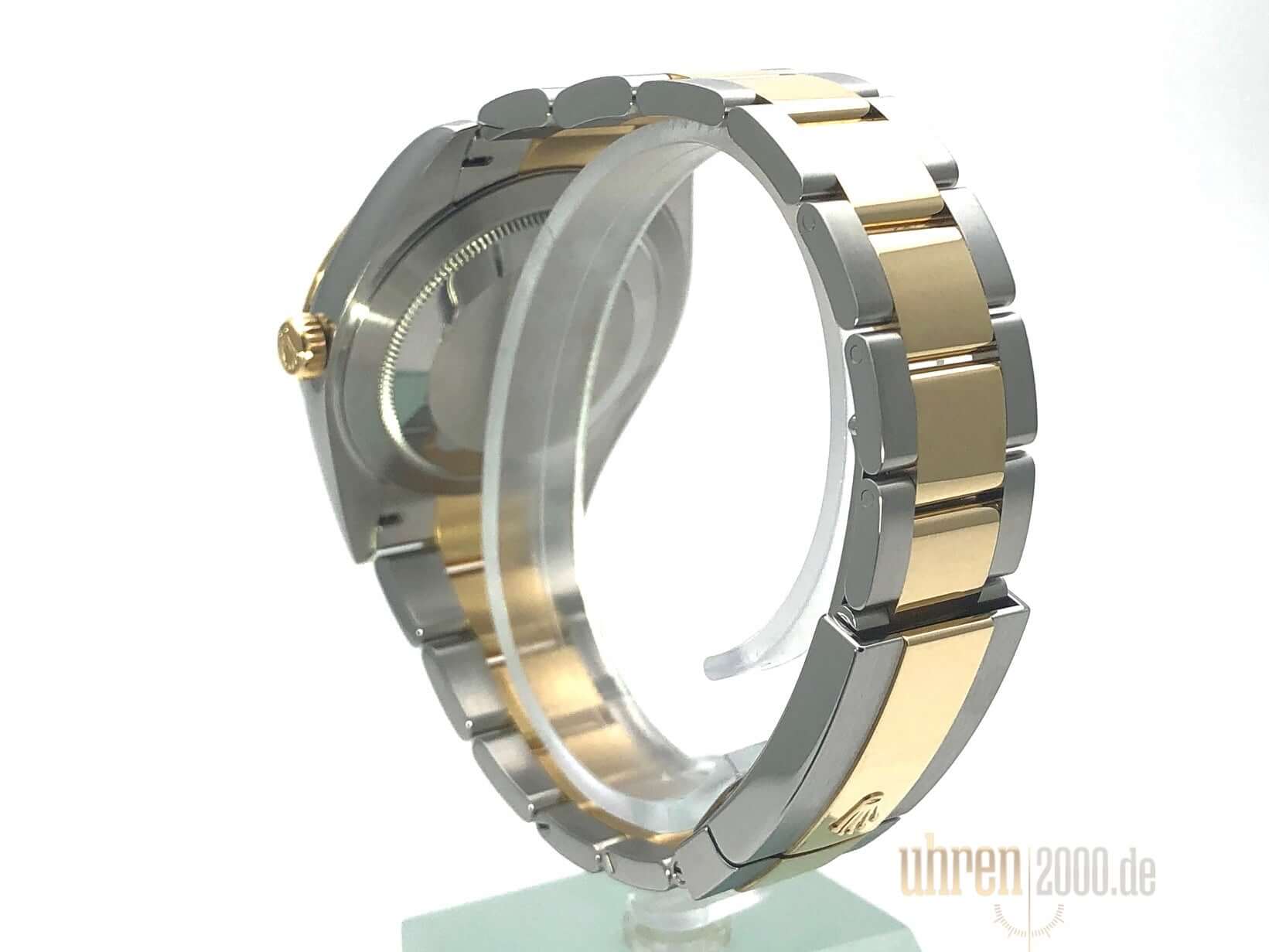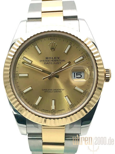 Gehäuse aus Edelstahl / Gelbgold poliert und satiniert, Gehäusedurchmesser 41 mm, geriffelte 18 kt Gelbgold Lünette, Oyster Armband aus Edelstahl / 18 kt Gelbgold poliert und satiniert mit Faltschließe, Champagnerfarbenes Zifferblatt mit 18 kt Gelbgold Leuchtindizes, Automatikwerk, Rolex Manufakturkaliber 3235, 70 Stunden Gangreserve, Datumsanzeige, Chronometer, kratzfestes Saphirglas, verschraubte 18 kt Gelbgold Krone, Edelstahlboden verschraubt, Wasserdicht bis zu 10 bar.