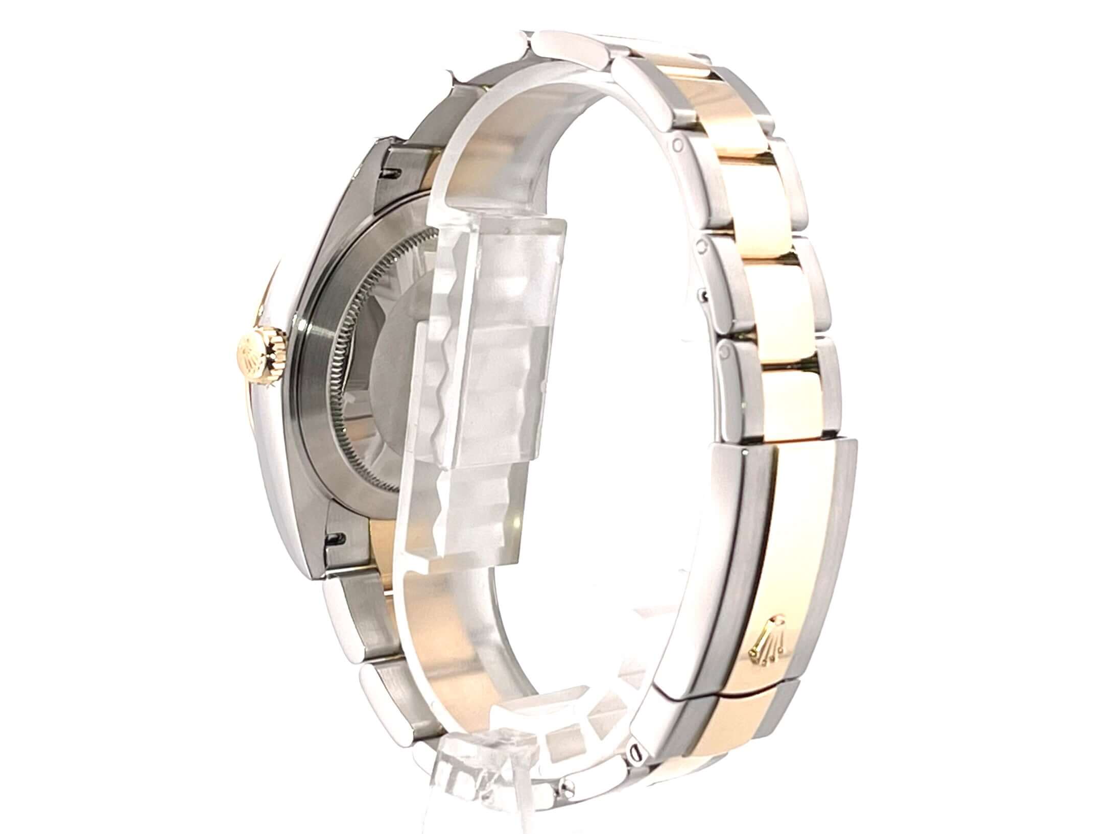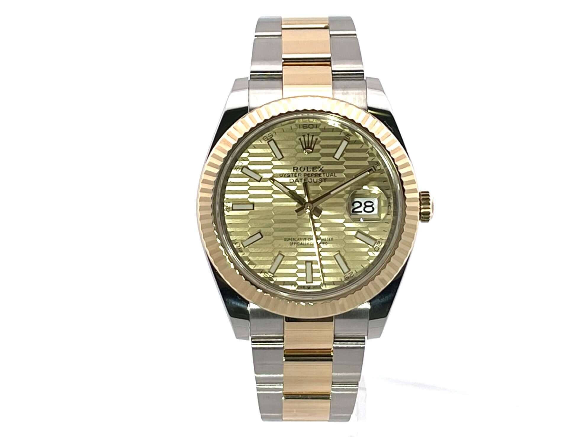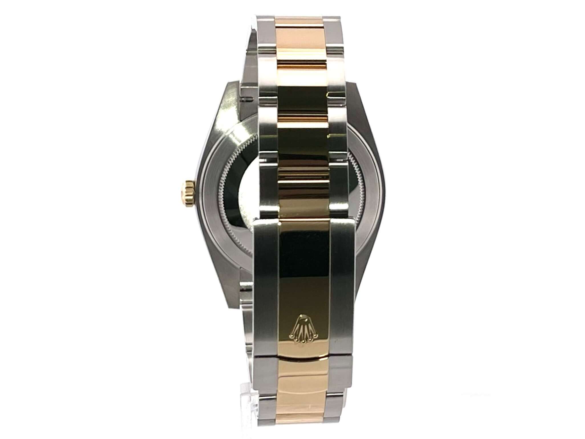 Gehäuse aus Edelstahl / Gelbgold poliert und satiniert, Gehäusedurchmesser 41 mm, geriffelte 18 kt Gelbgold Lünette, Oyster Armband aus Edelstahl / 18 kt Gelbgold poliert und satiniert mit Faltschließe, Goldfarbenes Riffelmuster Zifferblatt mit 18 kt Gelbgold Leuchtindizes, Automatikwerk, Rolex Manufakturkaliber 3235, Datumsanzeige, Chronometer, 70 Stunden Gangreserve, kratzfestes Saphirglas, verschraubte 18 kt Gelbgold Krone, Edelstahlboden verschraubt, Wasserdicht bis zu 10 bar.