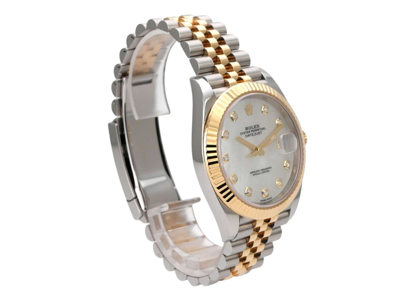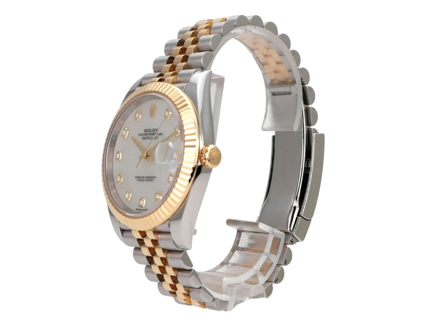 Gehäuse aus Edelstahl / Gelbgold poliert und satiniert, Gehäusedurchmesser 41 mm, geriffelte 18 kt-Gelbgold Lünette, Jubile Armband aus Edelstahl / 18 kt Gelbgold poliert und satiniert mit Faltschließe, Perlmutt Zifferblatt mit 10 aufgesetzten Diamanten, Automatikwerk, Rolex-Manufakturkaliber 3235, 70 Stunden Gangreserve, Chronometer, Datum, kratzfestes Saphirglas, verschraubte 18 kt-Gelbgoldkrone, Edelstahlboden verschraubt, wasserdicht bis zu 10 bar.