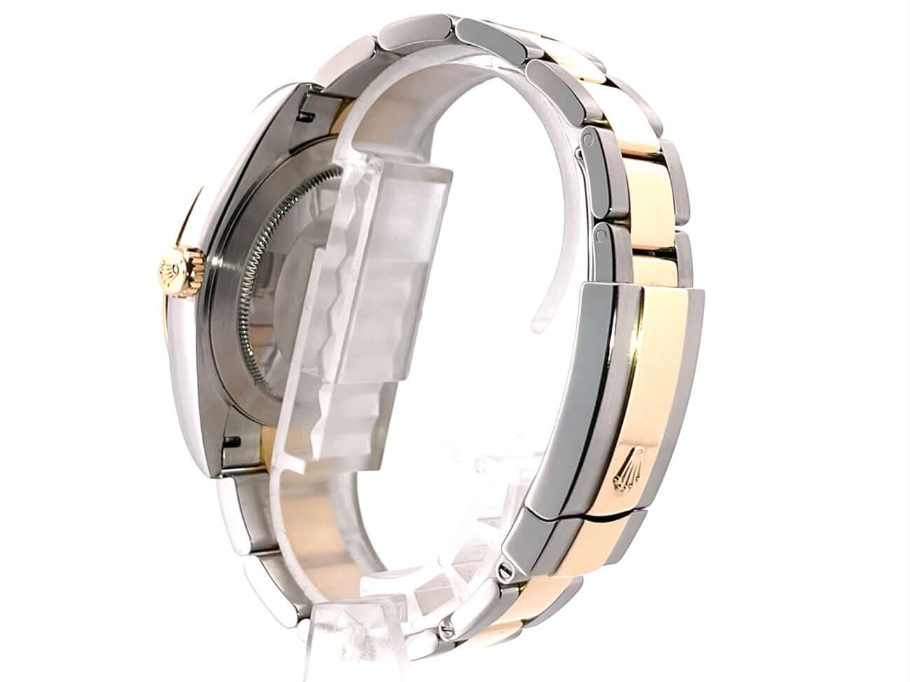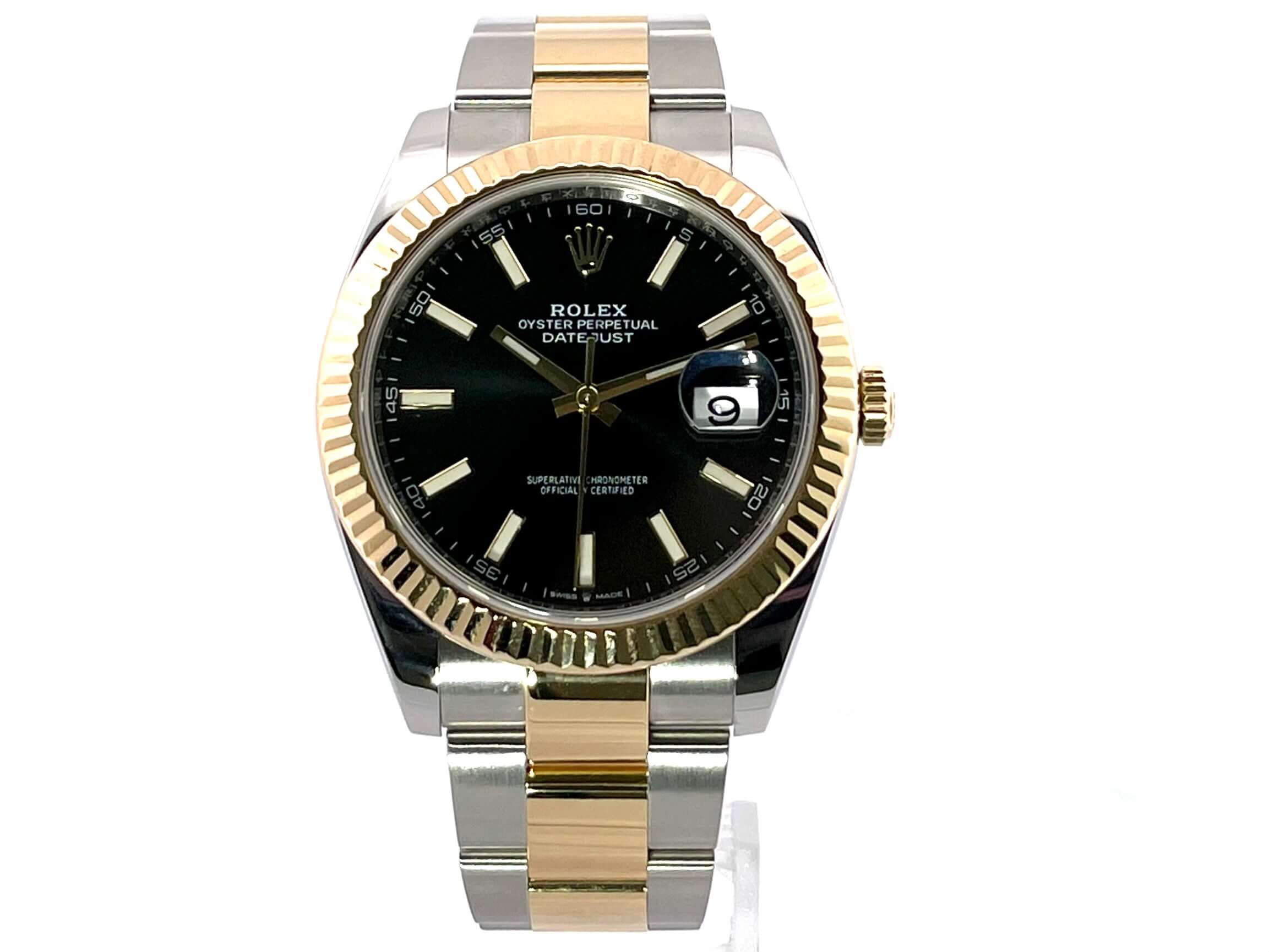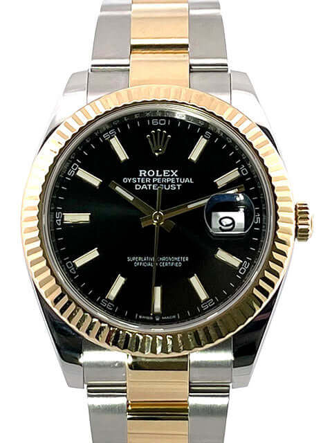 Gehäuse aus Edelstahl / Gelbgold poliert und satiniert, Gehäusedurchmesser 41 mm, geriffelte 18 kt Gelbgold Lünette, Oyster Armband aus Edelstahl / 18 kt Gelbgold poliert und satiniert mit Faltschließe, schwarzes Zifferblatt mit 18 kt Gelbgold Leuchtindizes, 18 kt Gelbgold Leuchtzeiger, Automatikwerk, Rolex Manufakturkaliber 3235, 70 Stunden Gangreserve, Datumsanzeige, Chronometer, kratzfestes Saphirglas, verschraubte 18 kt Gelbgold Krone, Edelstahlboden verschraubt, Wasserdicht bis zu 10 bar.