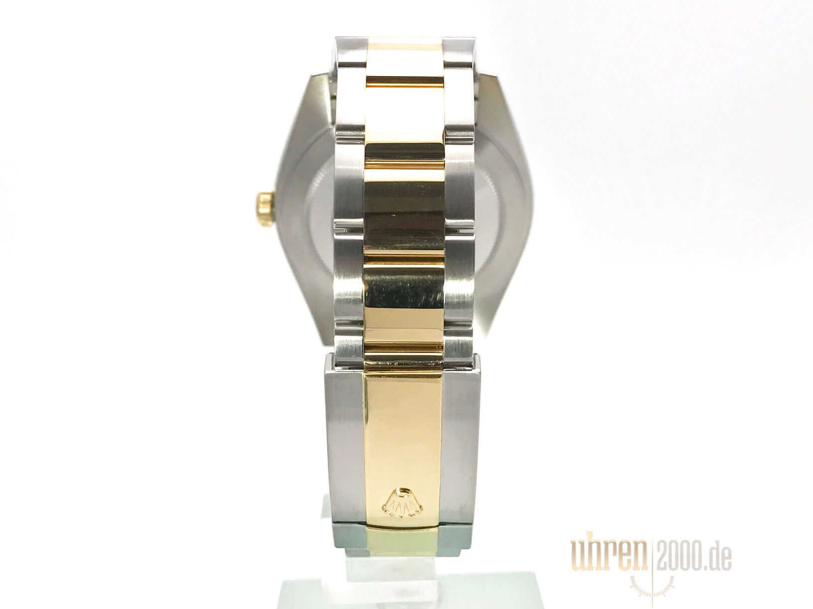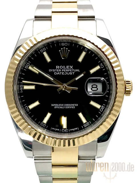 Gehäuse aus Edelstahl / Gelbgold poliert und satiniert, Gehäusedurchmesser 41 mm, geriffelte 18 kt Gelbgold Lünette, Oyster Armband aus Edelstahl / 18 kt Gelbgold poliert und satiniert mit Faltschließe, schwarzes Zifferblatt mit 18 kt Gelbgold LeuchtIndexen, 18 kt Gelbgold Leuchtzeiger, Automatikwerk, Rolex Manufakturkaliber 3235, Chronometer, 70 Stunden Gangreserve, kratzfestes Saphirglas, Datumsanzeige, verschraubte 18 kt Gelbgold Krone, Edelstahlboden verschraubt, Wasserdicht bis zu 10 bar.