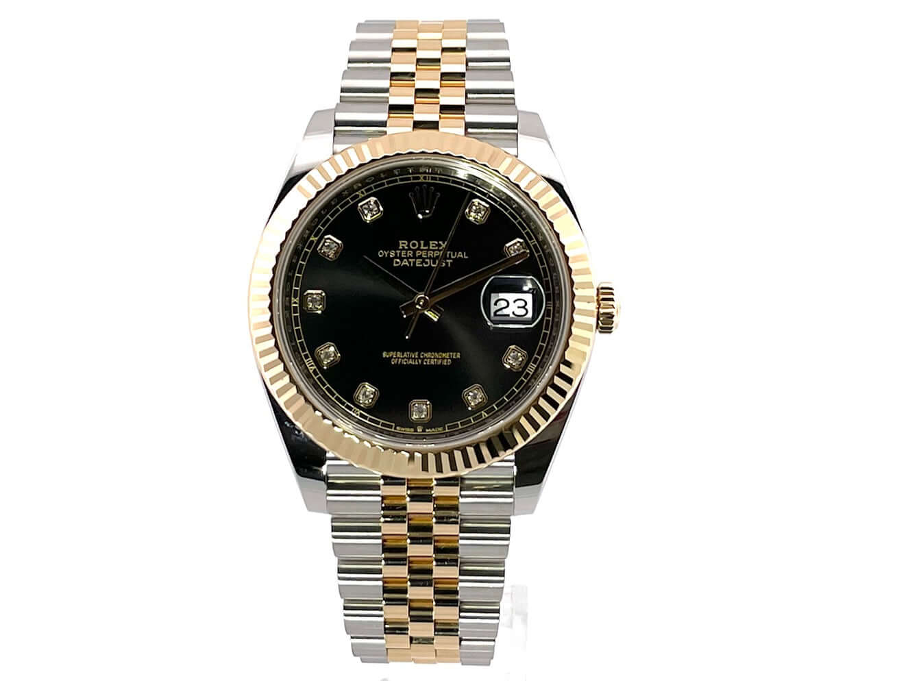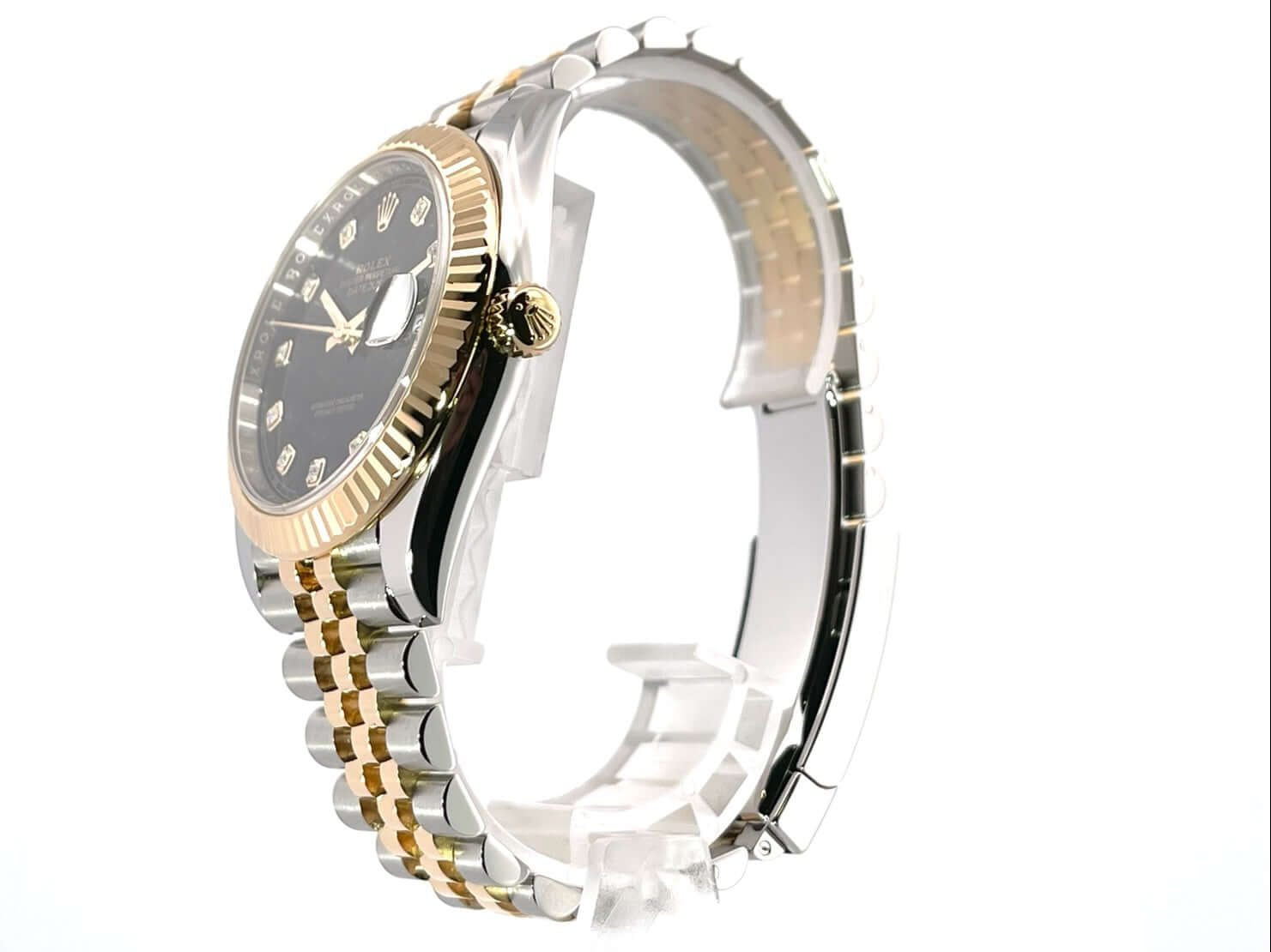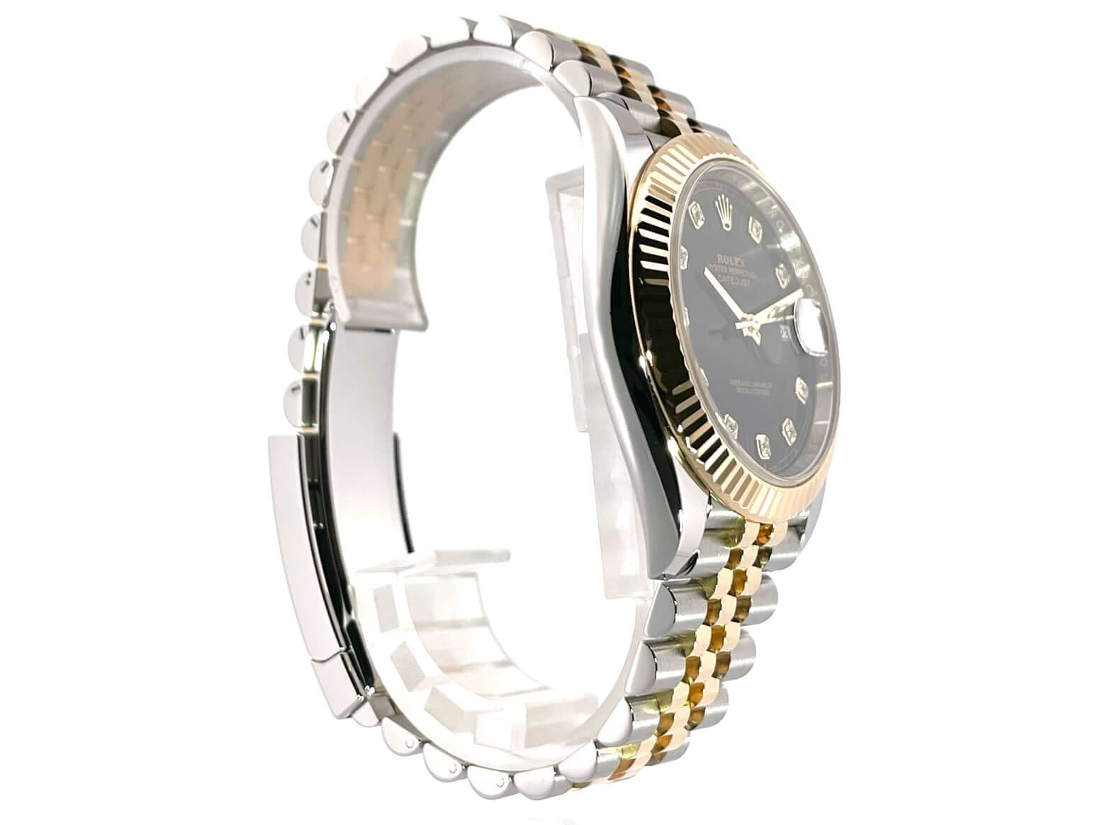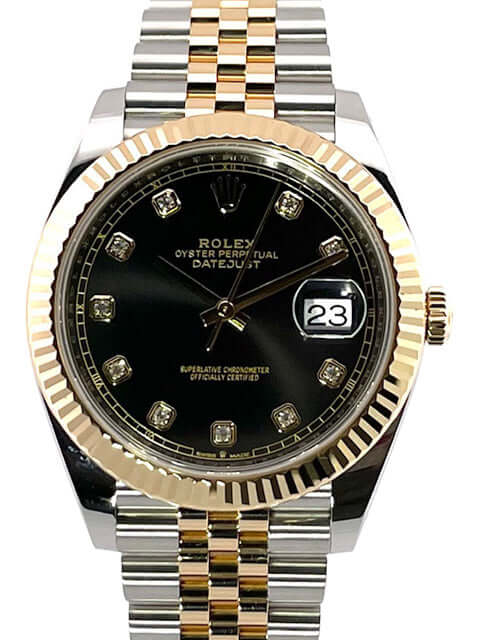 Gehäuse aus Edelstahl / Gelbgold poliert und satiniert, Gehäusedurchmesser 41 mm, geriffelte 18 kt Gelbgold Lünette, Jubile Armband aus Edelstahl / 18 kt Gelbgold poliert und satiniert mit Faltschließe, schwarzes Zifferblatt mit 10 aufgesetzten Diamanten, Automatikwerk, Rolex Manufakturkaliber 3235, Chronometer, 70 Stunden Gangreserve, kratzfestes Saphirglas, Datumsanzeige, verschraubte 18 kt Gelbgold Krone, Edelstahlboden verschraubt, Wasserdicht bis zu 10 bar.