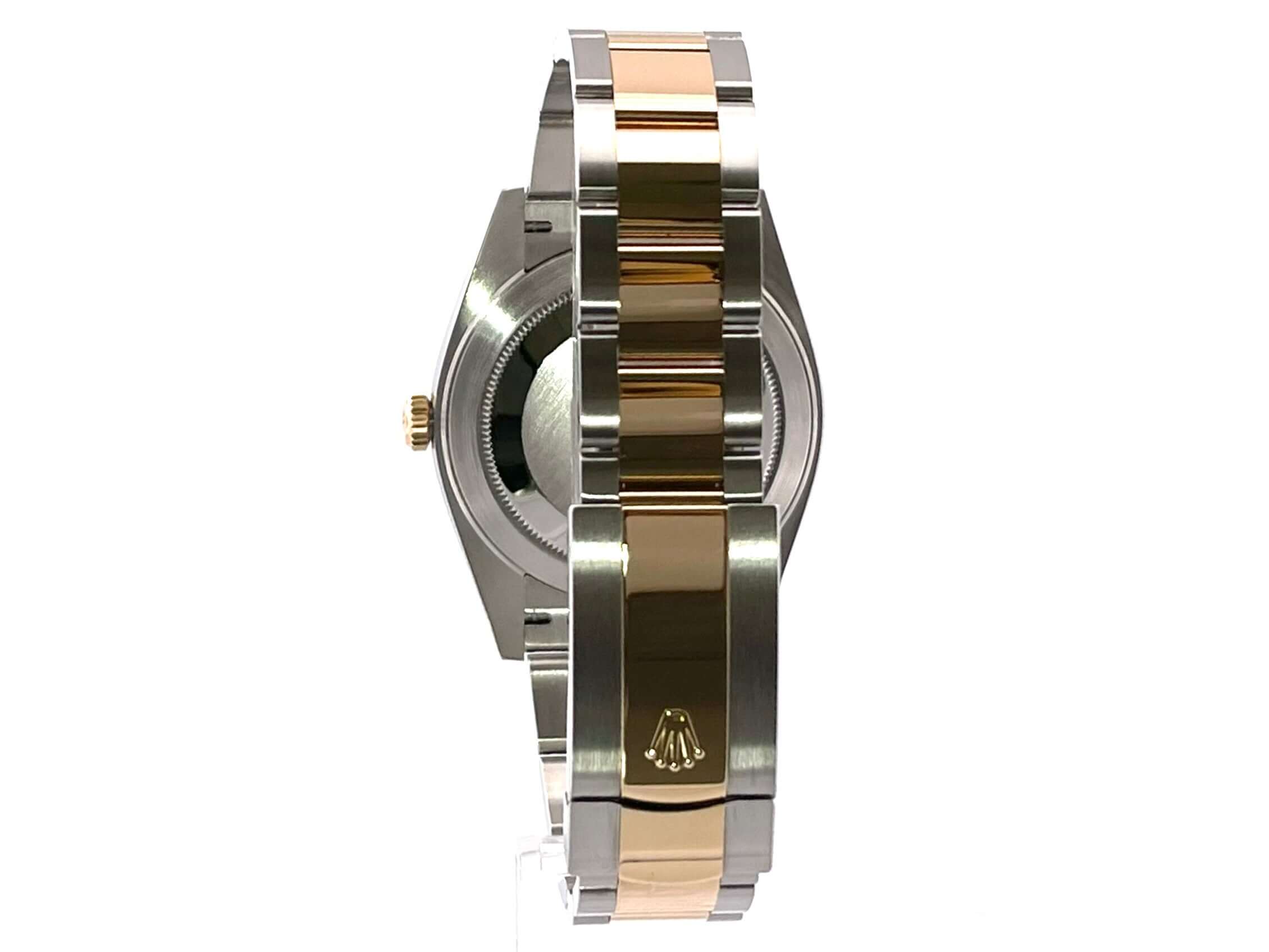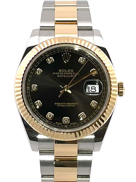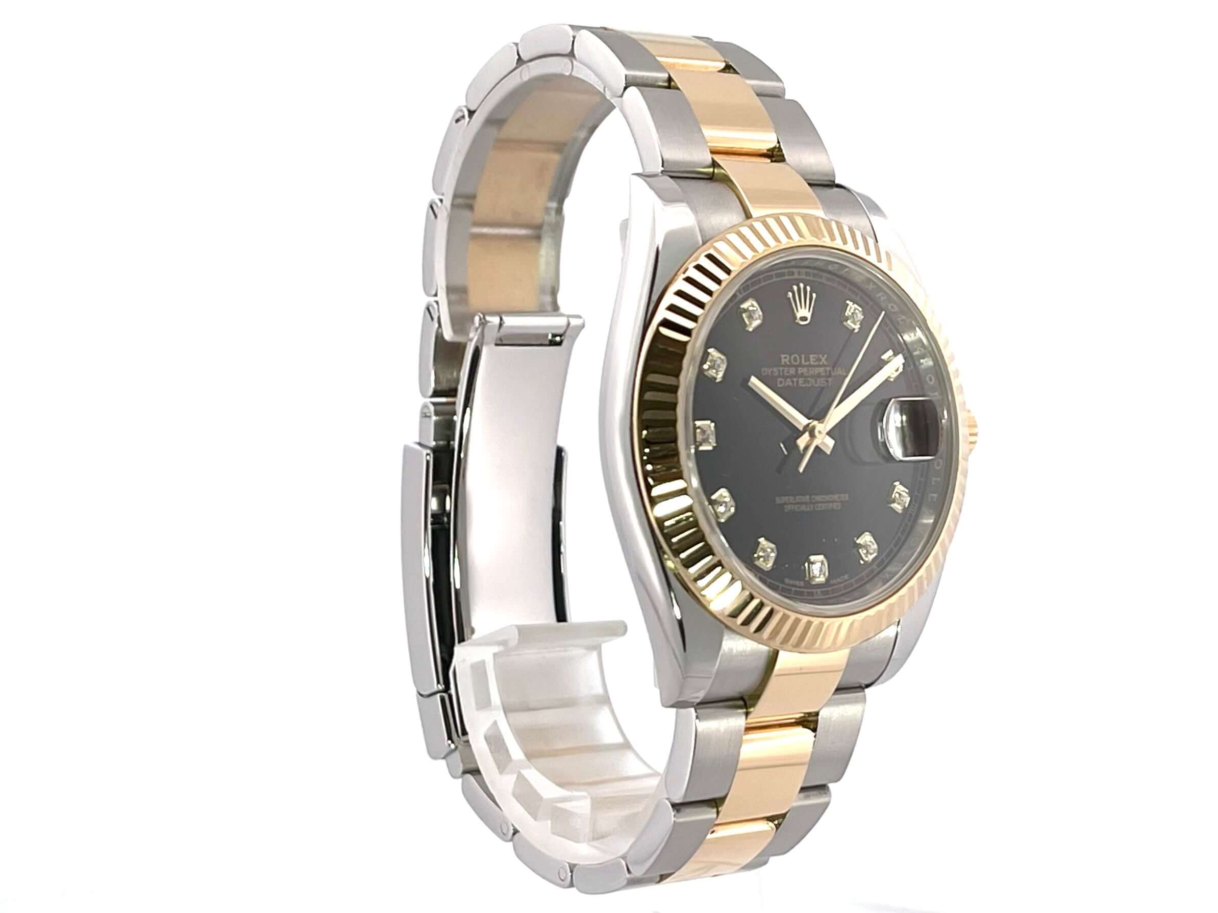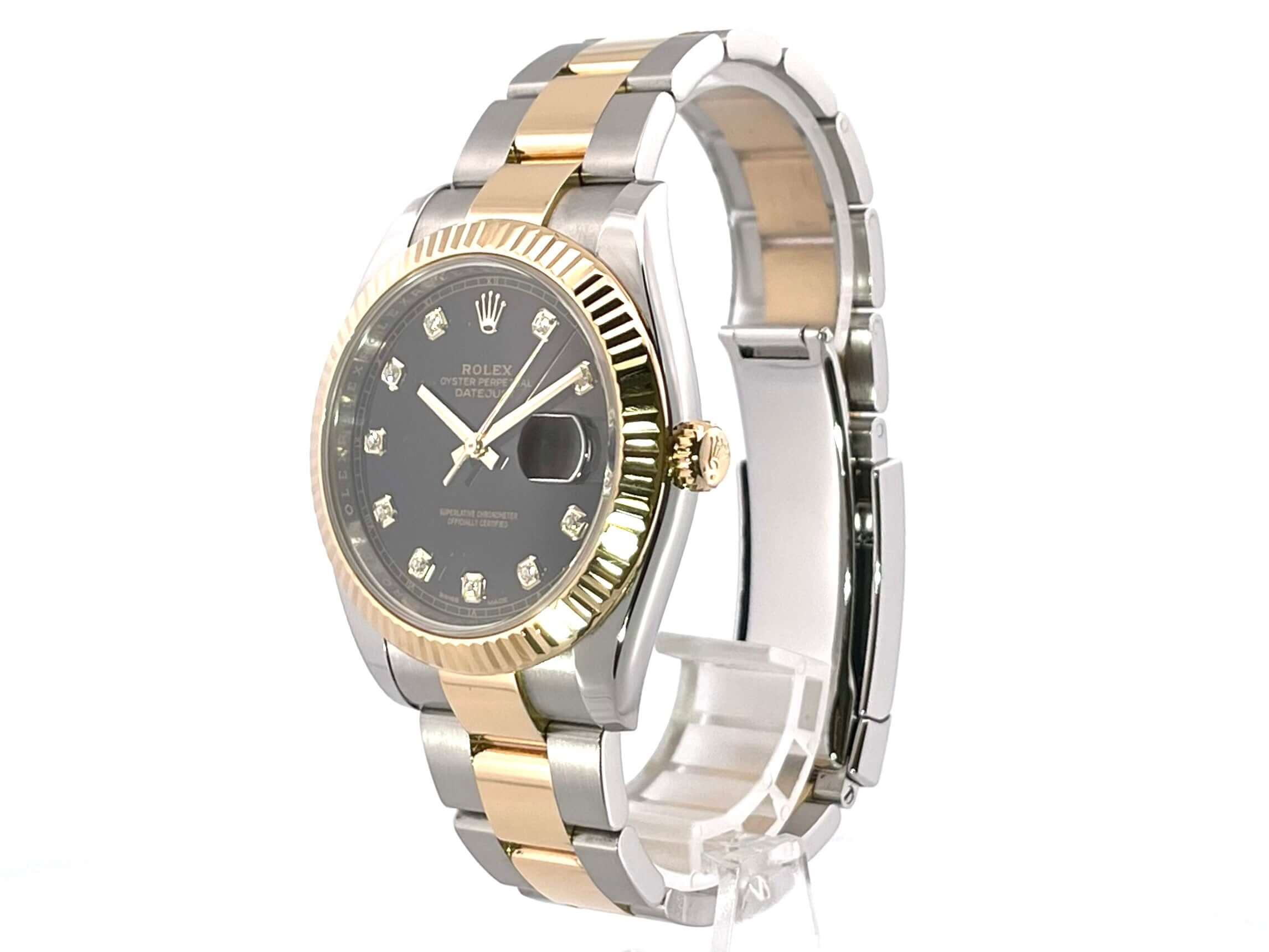 Gehäuse aus Edelstahl / Gelbgold poliert und satiniert, Gehäusedurchmesser 41 mm, geriffelte 18 kt Gelbgold Lünette, Oyster Armband aus Edelstahl / 18 kt Gelbgold poliert und satiniert mit Faltschließe, schwarzes Zifferblatt mit 10 aufgesetzten Diamanten, Automatikwerk, Rolex Manufakturkaliber 3235, 70 Stunden Gangreserve, Datumsanzeige, Chronometer, kratzfestes Saphirglas, verschraubte 18 kt Gelbgold Krone, Edelstahlboden verschraubt, Wasserdicht bis zu 10 bar.