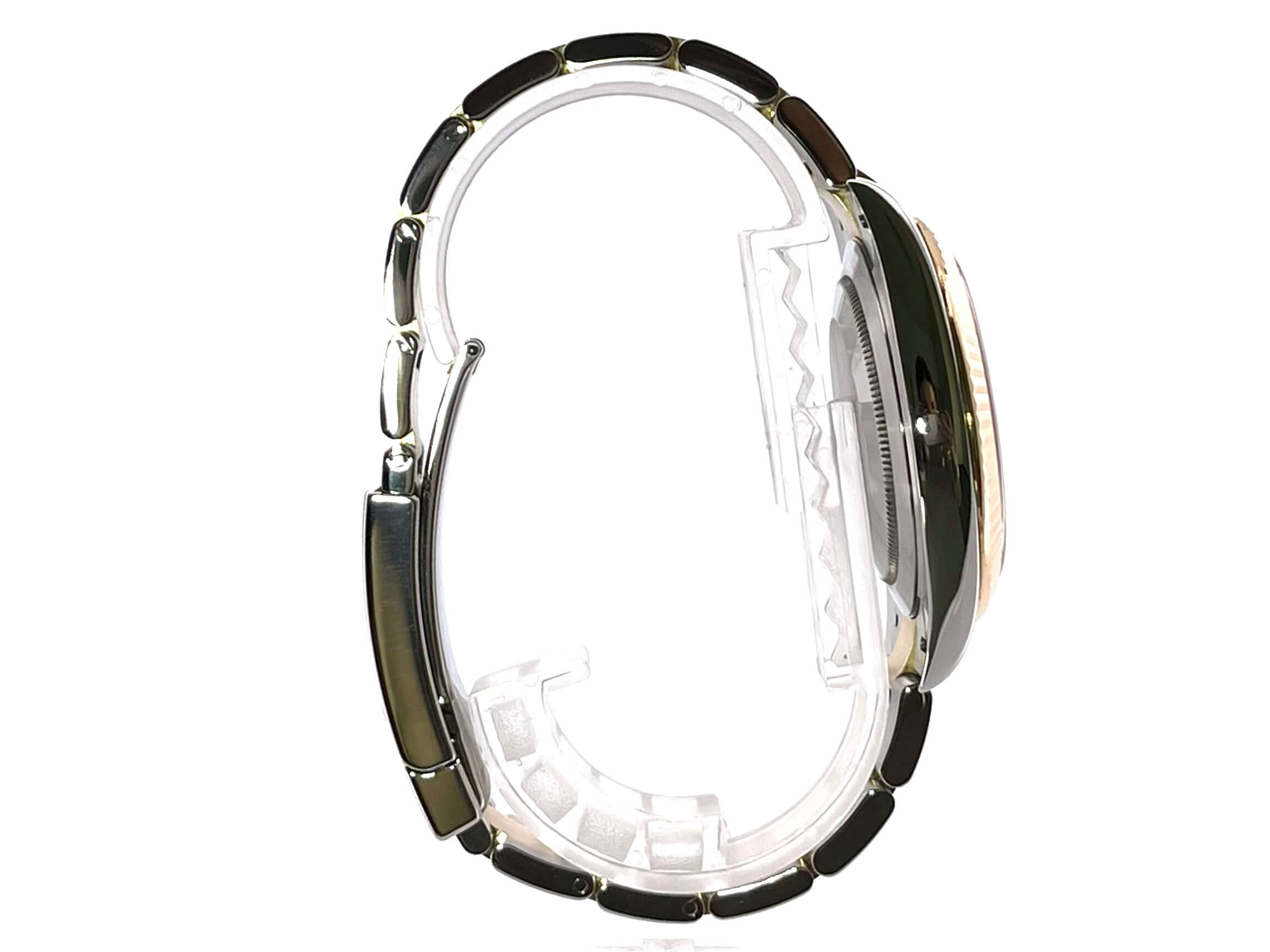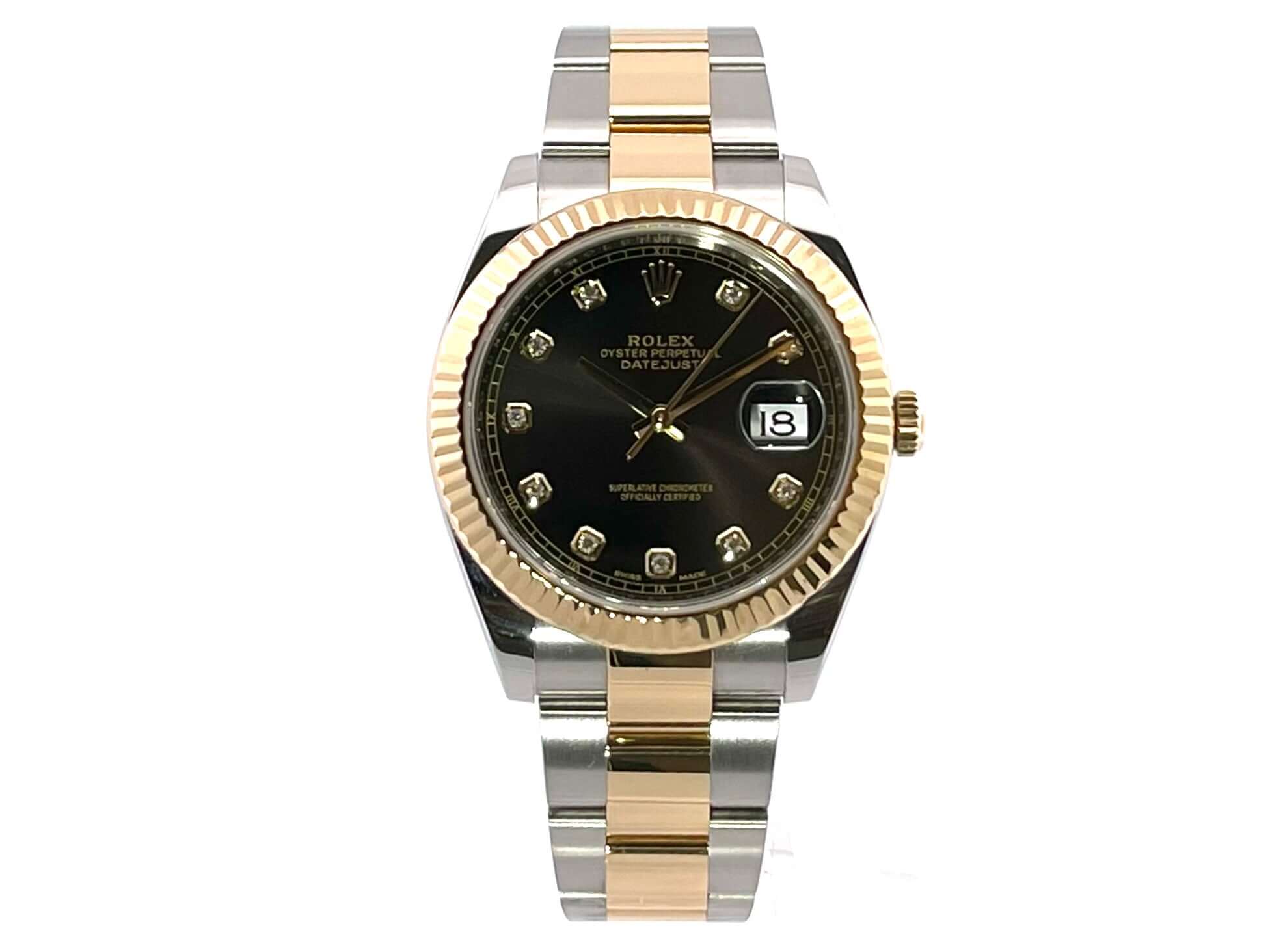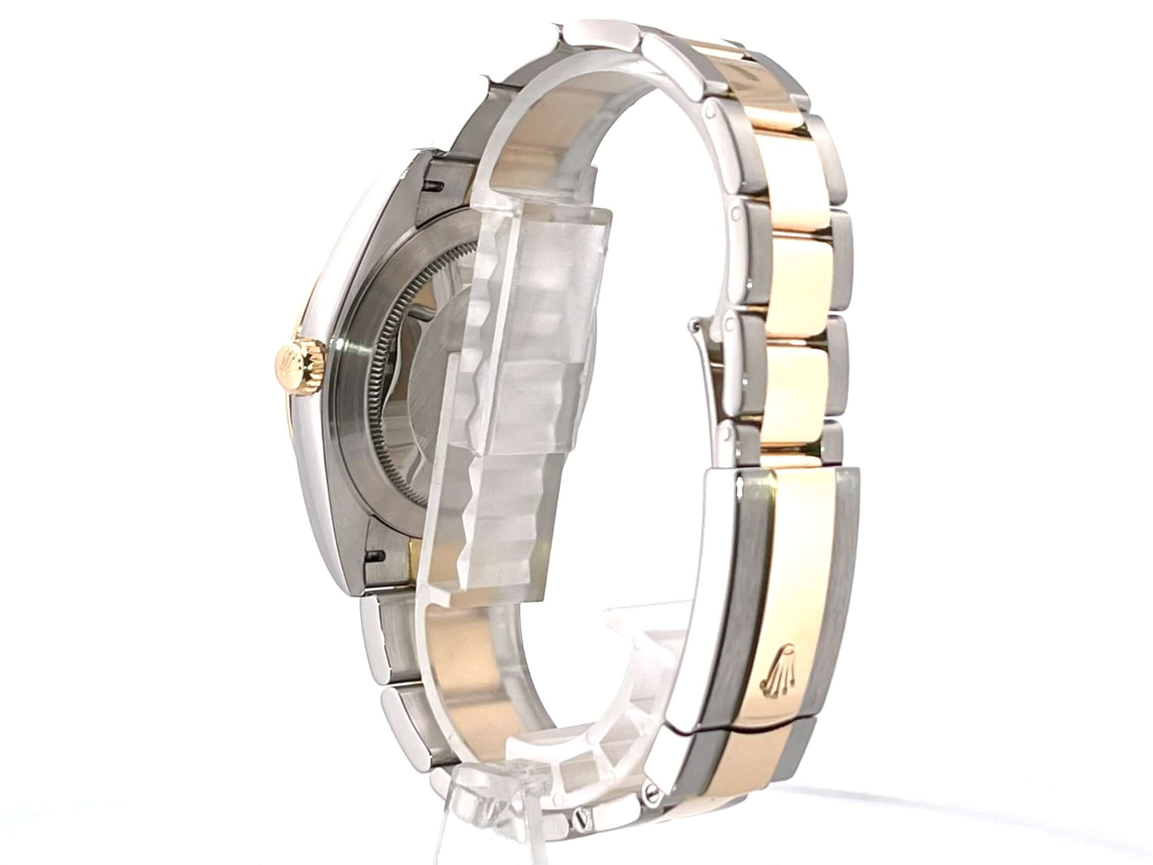 Gehäuse aus Edelstahl / Gelbgold poliert und satiniert, Gehäusedurchmesser 41 mm, geriffelte 18 kt Gelbgold Lünette, Oyster Armband aus Edelstahl / 18 kt Gelbgold poliert und satiniert mit Faltschließe, schwarzes Zifferblatt mit 10 aufgesetzten Diamanten, Automatikwerk, Rolex Manufakturkaliber 3235, 70 Stunden Gangreserve, Datumsanzeige, Chronometer, kratzfestes Saphirglas, verschraubte 18 kt Gelbgold Krone, Edelstahlboden verschraubt, Wasserdicht bis zu 10 bar.