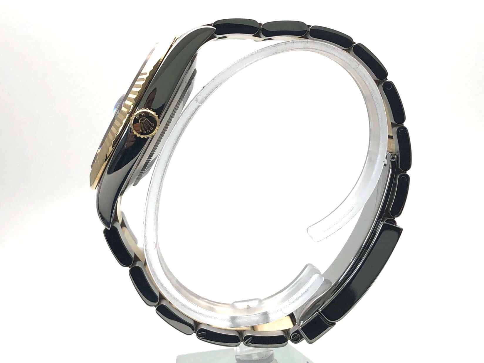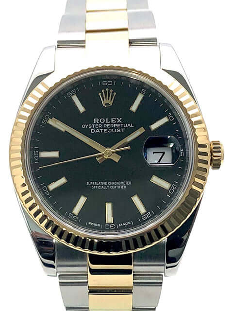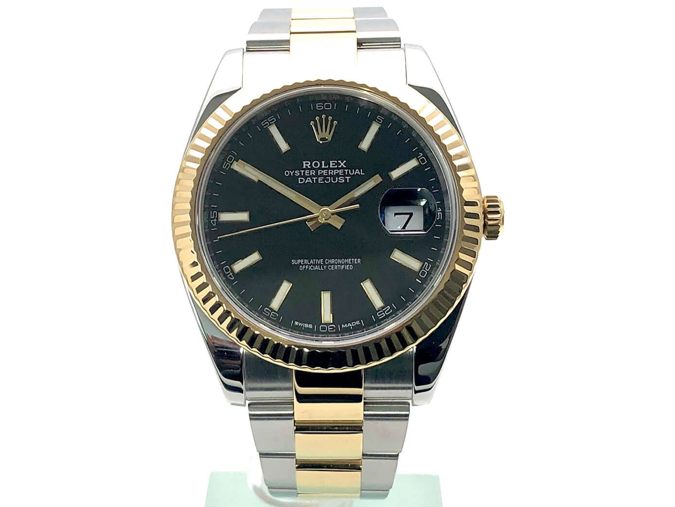 Gehäuse aus Edelstahl / Gelbgold poliert und satiniert, Gehäusedurchmesser 41 mm, geriffelte 18 kt Gelbgold Lünette, Oyster Armband aus Edelstahl / 18 kt Gelbgold poliert und satiniert mit Faltschließe, schwarzes Zifferblatt mit 18 kt Gelbgold LeuchtIndexen, 18 kt Gelbgold Leuchtzeiger, Automatikwerk, Rolex Manufakturkaliber 3235, Chronometer, 70 Stunden Gangreserve, kratzfestes Saphirglas, Datumsanzeige, verschraubte 18 kt Gelbgold Krone, Edelstahlboden verschraubt, Wasserdicht bis zu 10 bar.