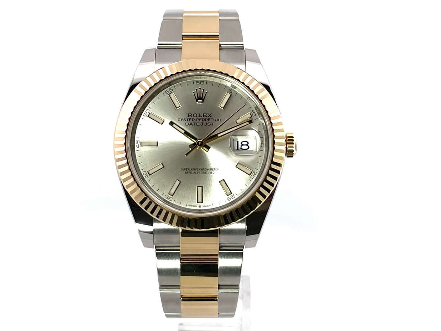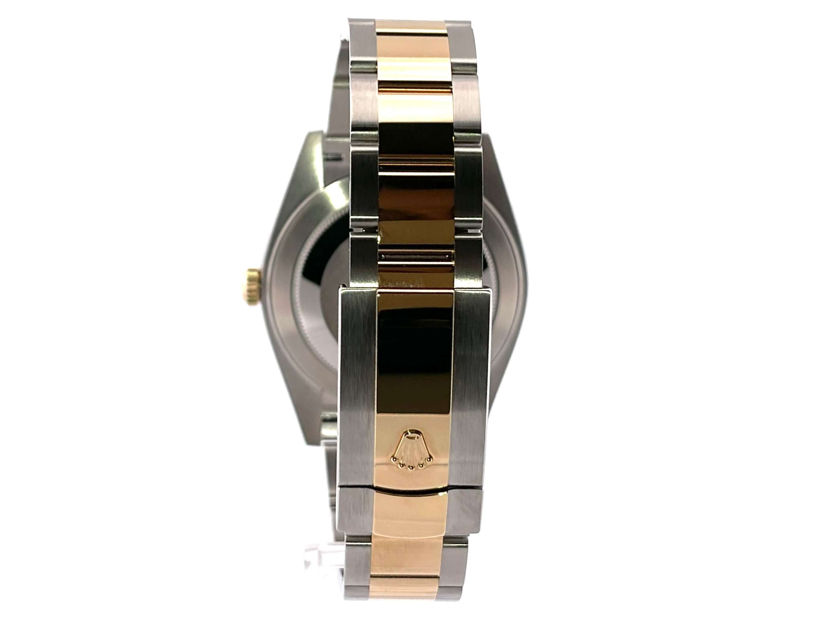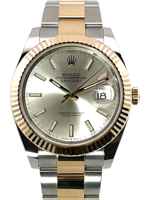 Gehäuse aus Edelstahl / Gelbgold poliert und satiniert, Gehäusedurchmesser 41 mm, geriffelte 18 kt Gelbgold Lünette, Oyster Armband aus Edelstahl / 18 kt Gelbgold poliert und satiniert mit Faltschließe, silberfarbenes Zifferblatt mit 18 kt Gelbgold Leuchtindizes, Automatikwerk, Rolex Manufakturkaliber 3235, Chronometer, 70 Stunden Gangreserve, Datumsanzeige, kratzfestes Saphirglas, verschraubte 18 kt Gelbgold Krone, Edelstahlboden verschraubt, Wasserdicht bis zu 10 bar.