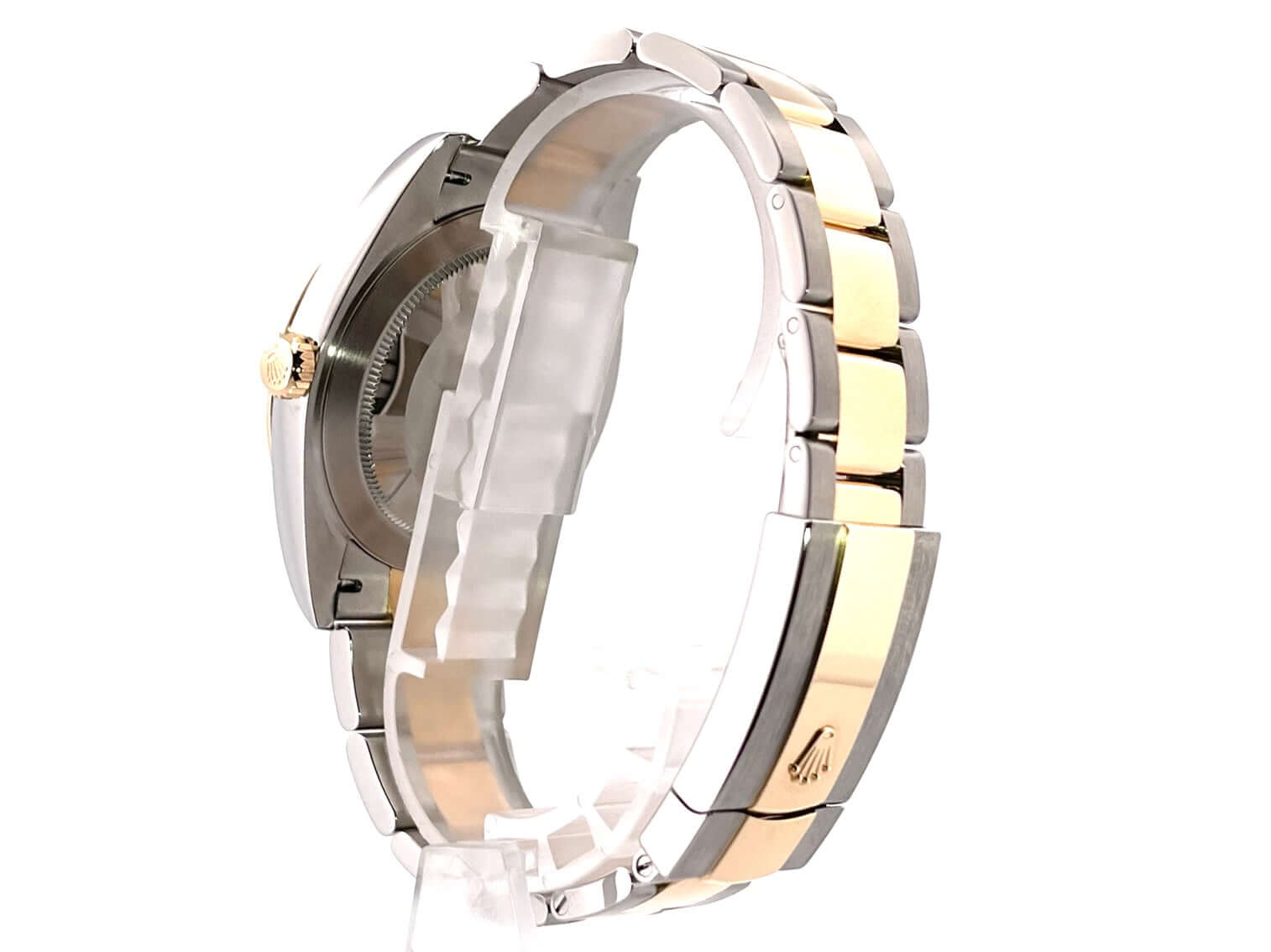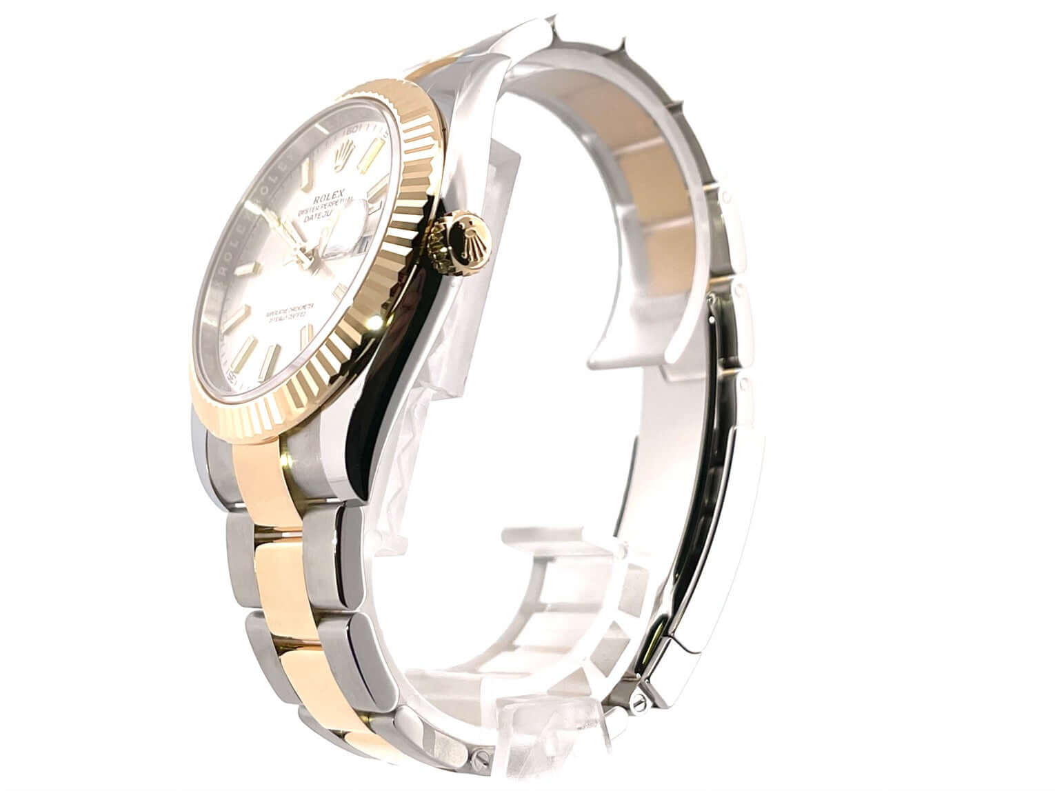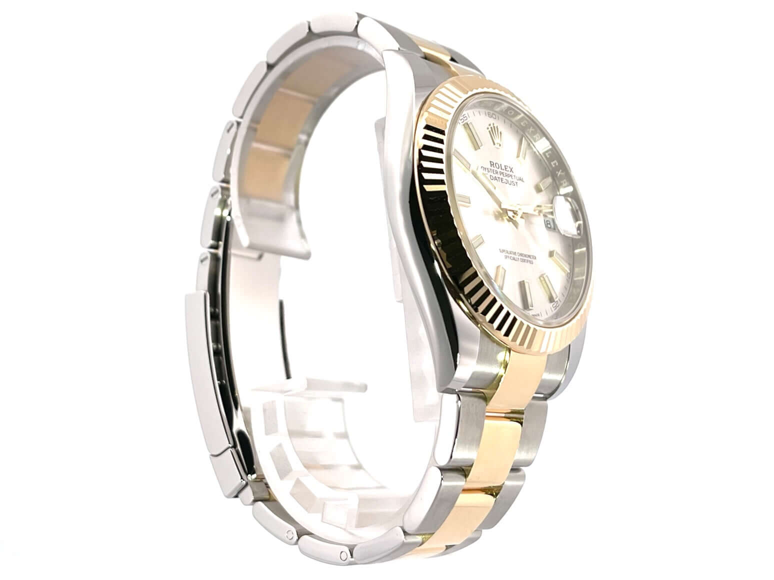 Gehäuse aus Edelstahl / Gelbgold poliert und satiniert, Gehäusedurchmesser 41 mm, geriffelte 18 kt Gelbgold Lünette, Oyster Armband aus Edelstahl / 18 kt Gelbgold poliert und satiniert mit Faltschließe, silberfarbenes Zifferblatt mit 18 kt Gelbgold Leuchtindizes, Automatikwerk, Rolex Manufakturkaliber 3235, Chronometer, 70 Stunden Gangreserve, Datumsanzeige, kratzfestes Saphirglas, verschraubte 18 kt Gelbgold Krone, Edelstahlboden verschraubt, Wasserdicht bis zu 10 bar.