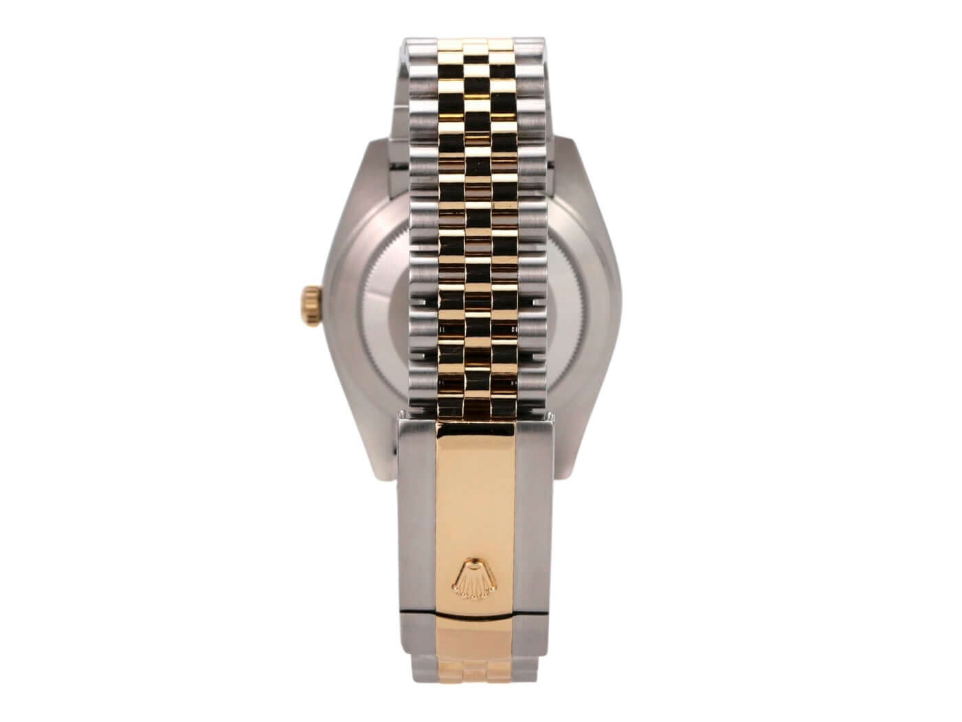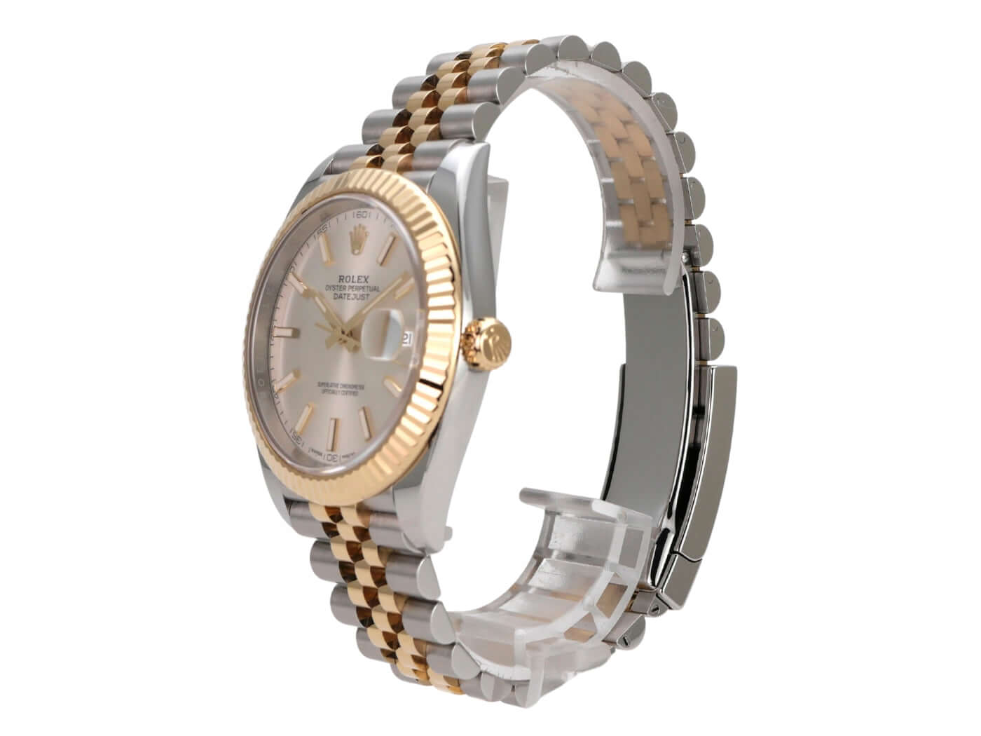 Gehäuse aus Edelstahl / Gelbgold poliert und satiniert, Gehäusedurchmesser 41 mm, geriffelte 18 kt Gelbgold Lünette, Jubile Armband aus Edelstahl / 18 kt Gelbgold poliert und satiniert mit Faltschließe, Zifferblatt Silberfarben mit 18 kt Gelbgold Leuchtindizes, Automatikwerk, Rolex Manufakturkaliber 3235, 70 Stunden Gangreserve, Datumsanzeige, Chronometer, kratzfestes Saphirglas, verschraubte 18 kt Gelbgold Krone, Edelstahlboden verschraubt, wasserdicht bis zu 10 bar.
