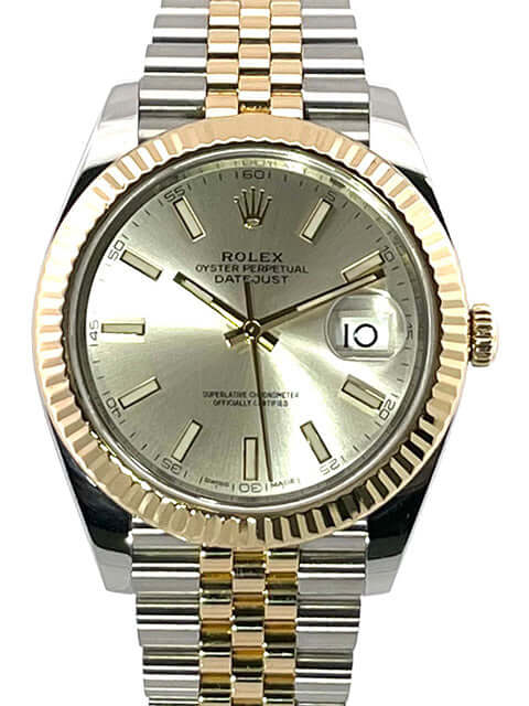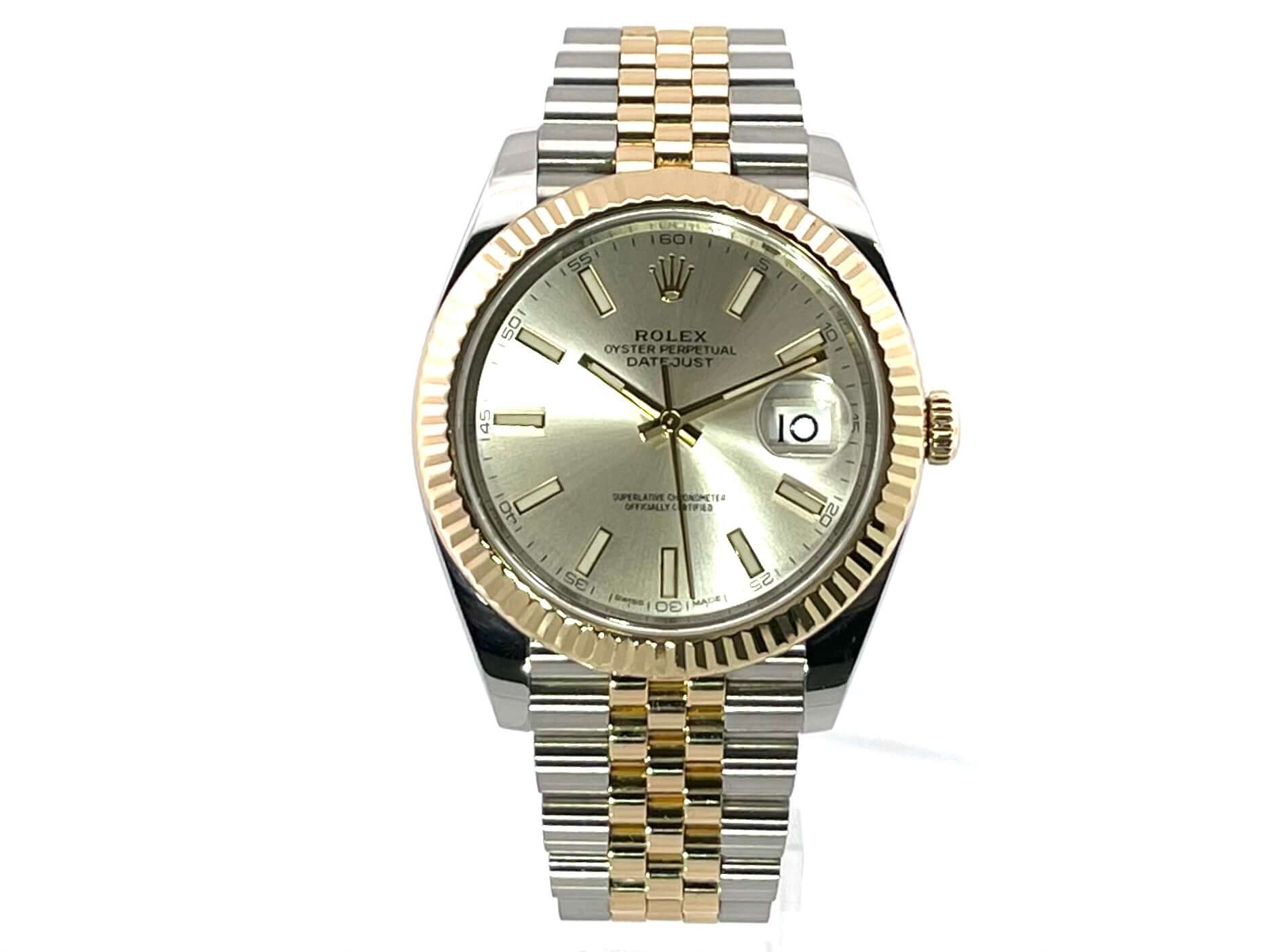 Gehäuse aus Edelstahl / Gelbgold poliert und satiniert, Gehäusedurchmesser 41 mm, geriffelte 18 kt Gelbgold Lünette, Jubile Armband aus Edelstahl / 18 kt Gelbgold poliert und satiniert mit Faltschließe, Zifferblatt Silberfarben mit 18 kt Gelbgold LeuchtIndexen, Automatikwerk, Rolex Manufakturkaliber 3235, Chronometer, 70 Stunden Gangreserve, Datumsanzeige, kratzfestes Saphirglas, verschraubte 18 kt Gelbgold Krone, Edelstahlboden verschraubt, Wasserdicht bis zu 10 bar.