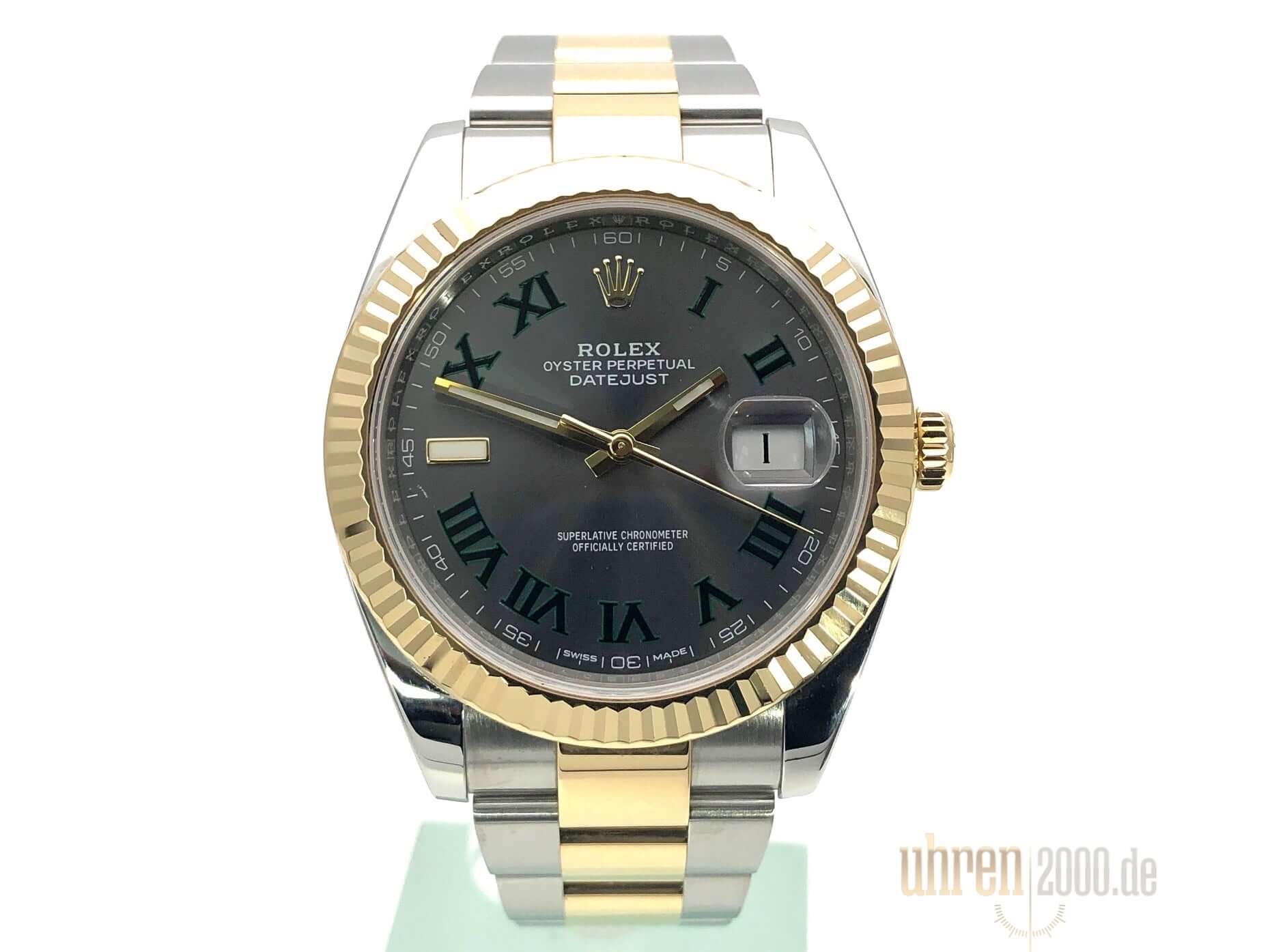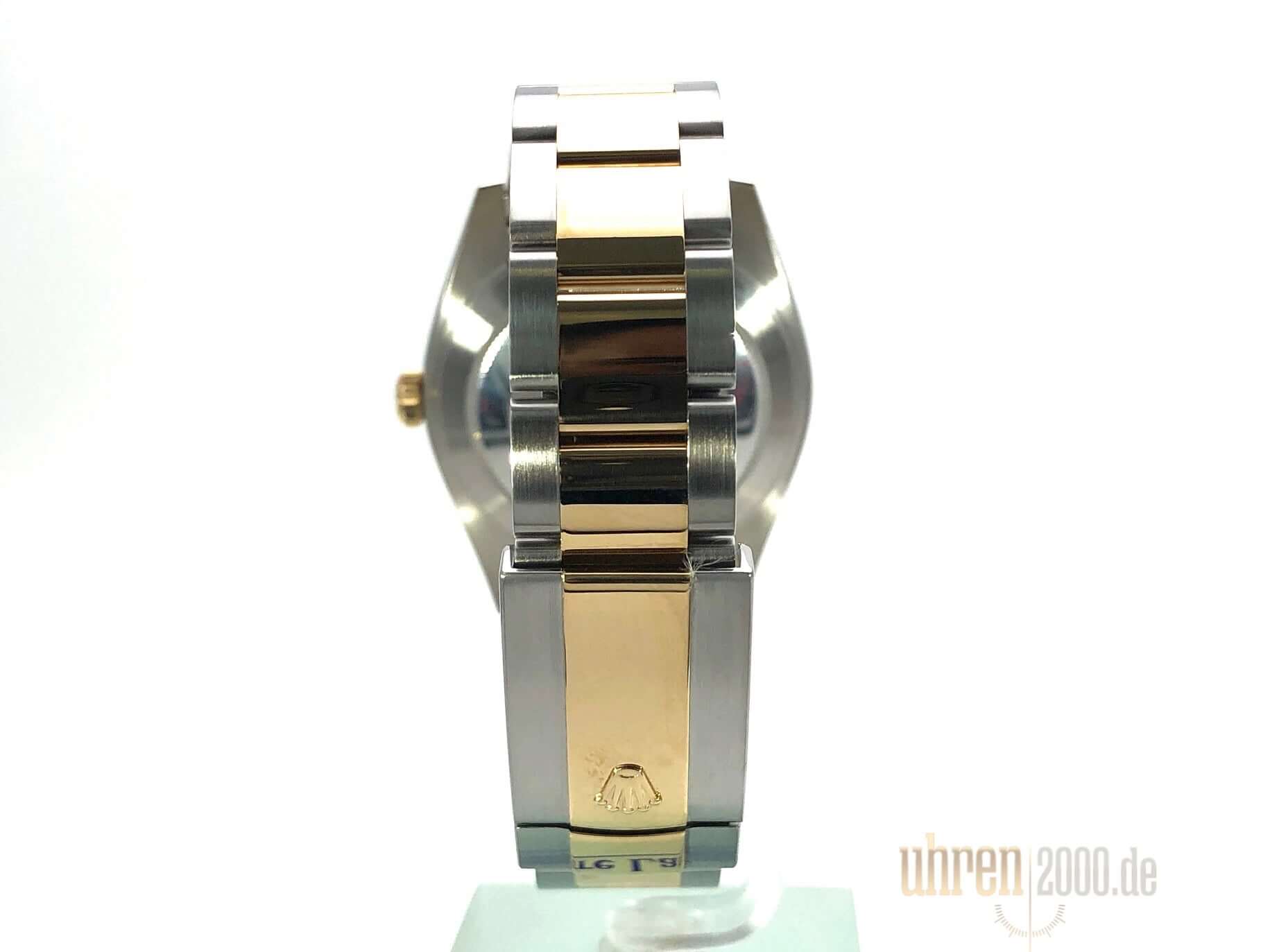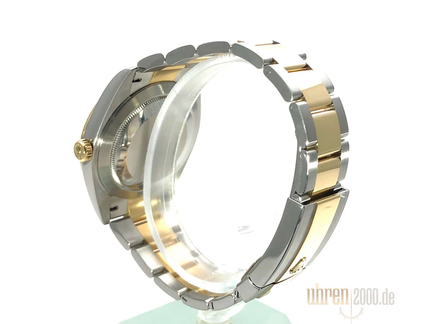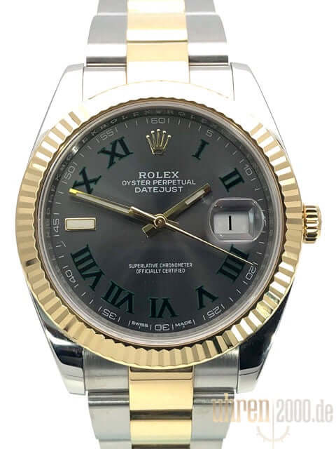 Gehäuse aus Edelstahl / Gelbgold poliert und satiniert, Gehäusedurchmesser 41 mm, geriffelte 18 kt Gelbgold Lünette, Oyster Armband aus Edelstahl / 18 kt Gelbgold poliert und satiniert mit Faltschließe, Schiefergraues Zifferblatt mit römische Ziffern, Automatikwerk, Rolex Manufakturkaliber 3235, 70 Stunden Gangreserve, Datumsanzeige, Chronometer, kratzfestes Saphirglas, verschraubte 18 kt Gelbgold Krone, Edelstahlboden verschraubt, Wasserdicht bis zu 10 bar.