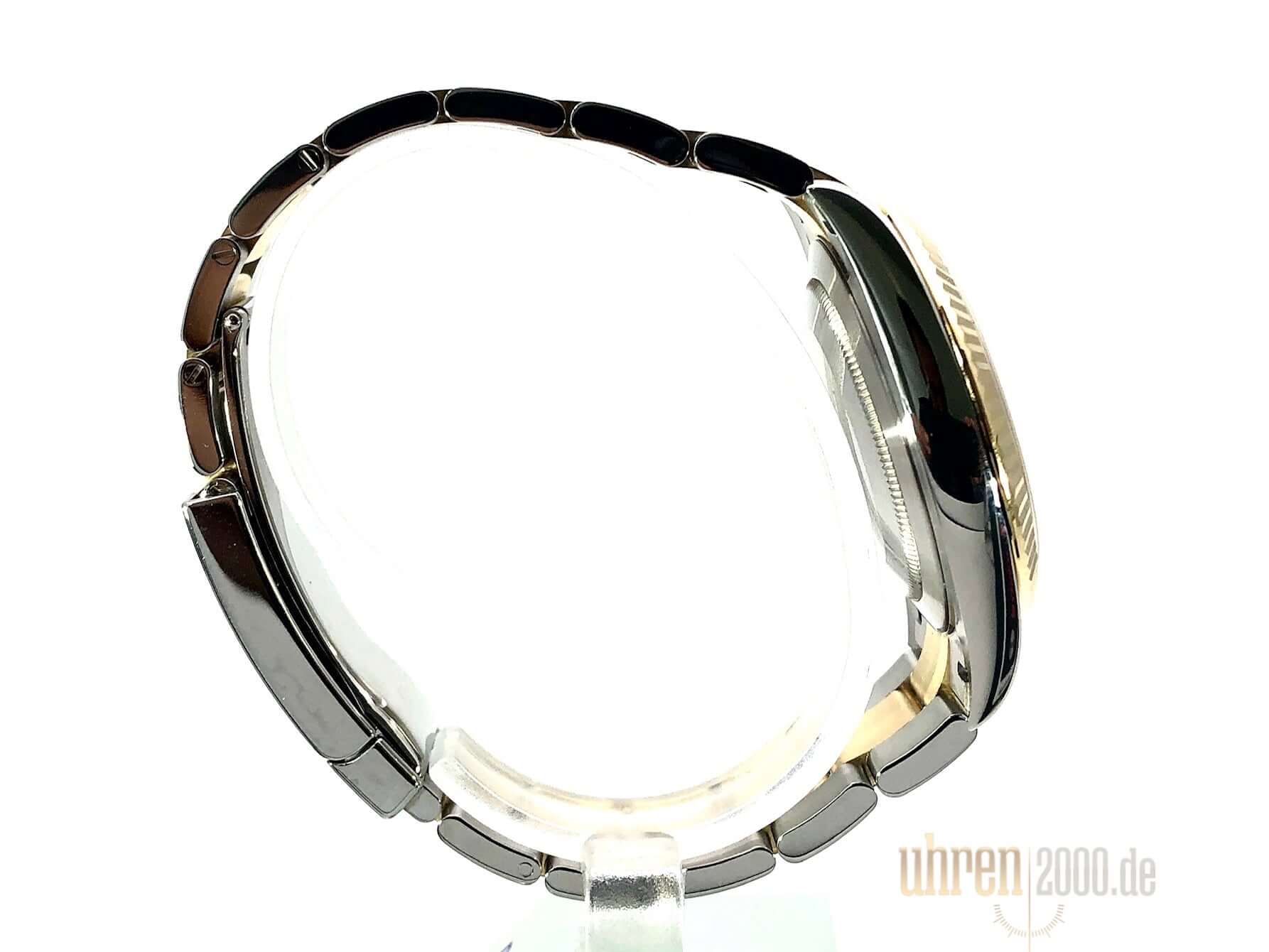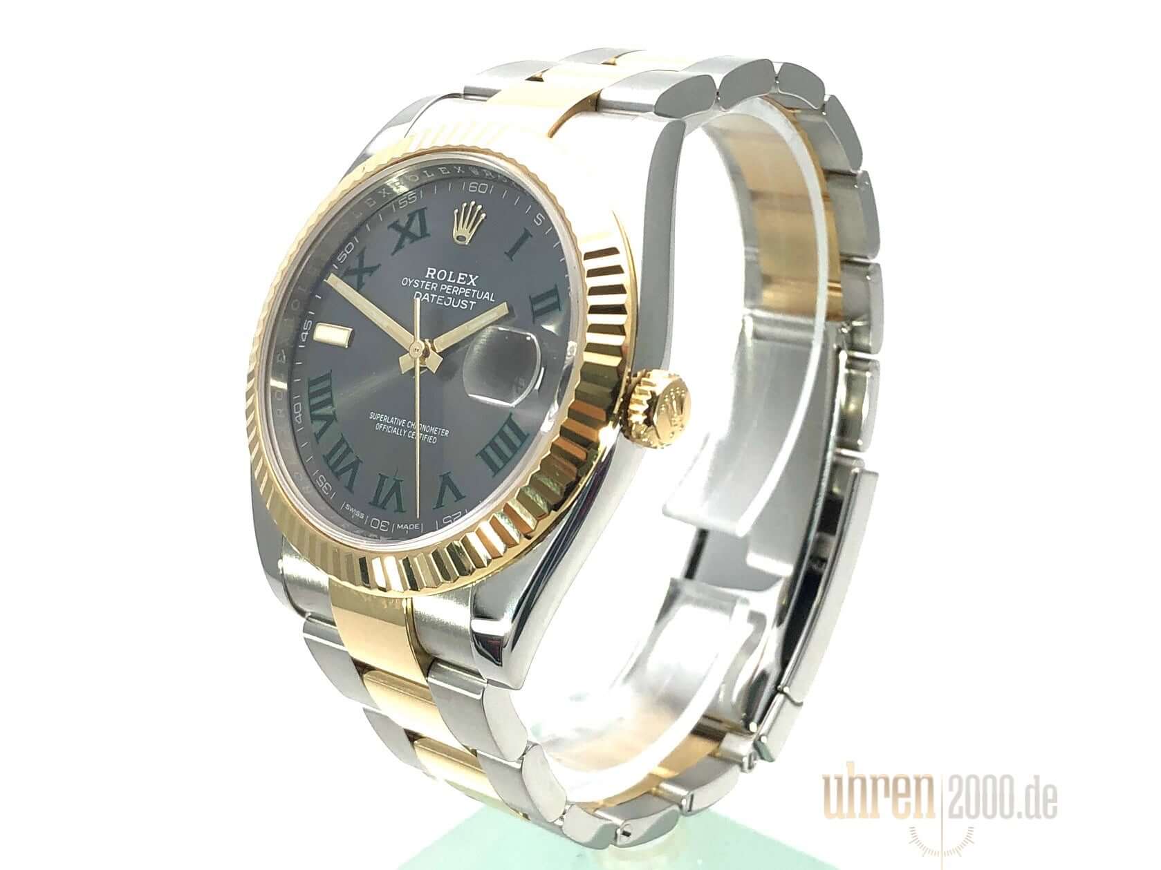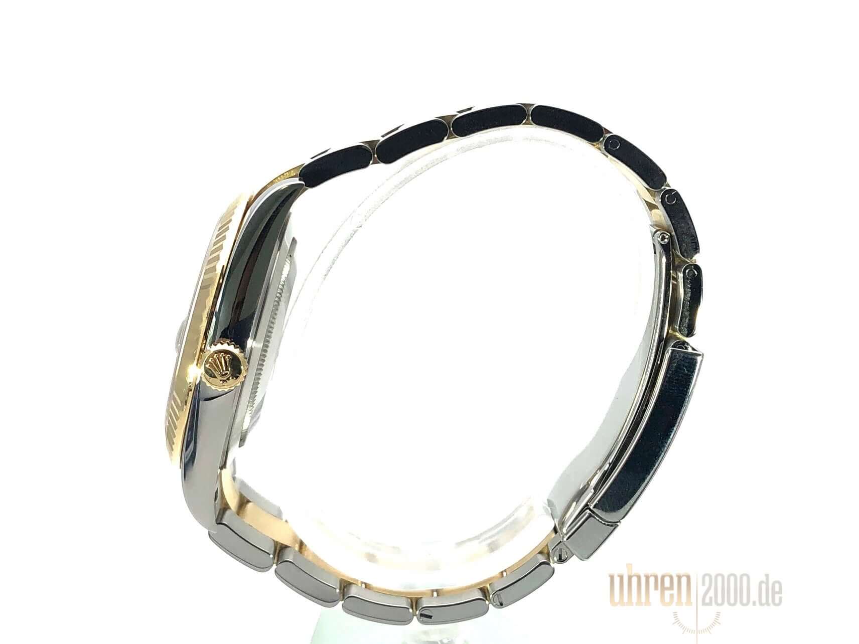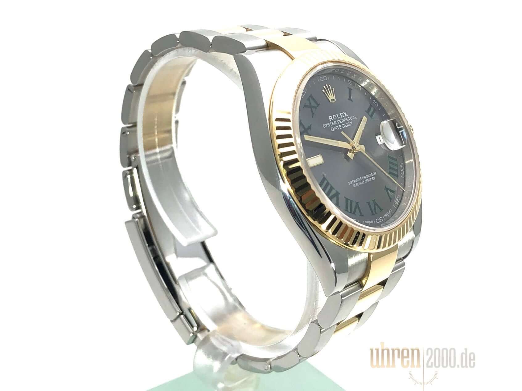 Gehäuse aus Edelstahl / Gelbgold poliert und satiniert, Gehäusedurchmesser 41 mm, geriffelte 18 kt Gelbgold Lünette, Oyster Armband aus Edelstahl / 18 kt Gelbgold poliert und satiniert mit Faltschließe, Schiefergraues Zifferblatt mit römische Ziffern, Automatikwerk, Rolex Manufakturkaliber 3235, 70 Stunden Gangreserve, Datumsanzeige, Chronometer, kratzfestes Saphirglas, verschraubte 18 kt Gelbgold Krone, Edelstahlboden verschraubt, Wasserdicht bis zu 10 bar.