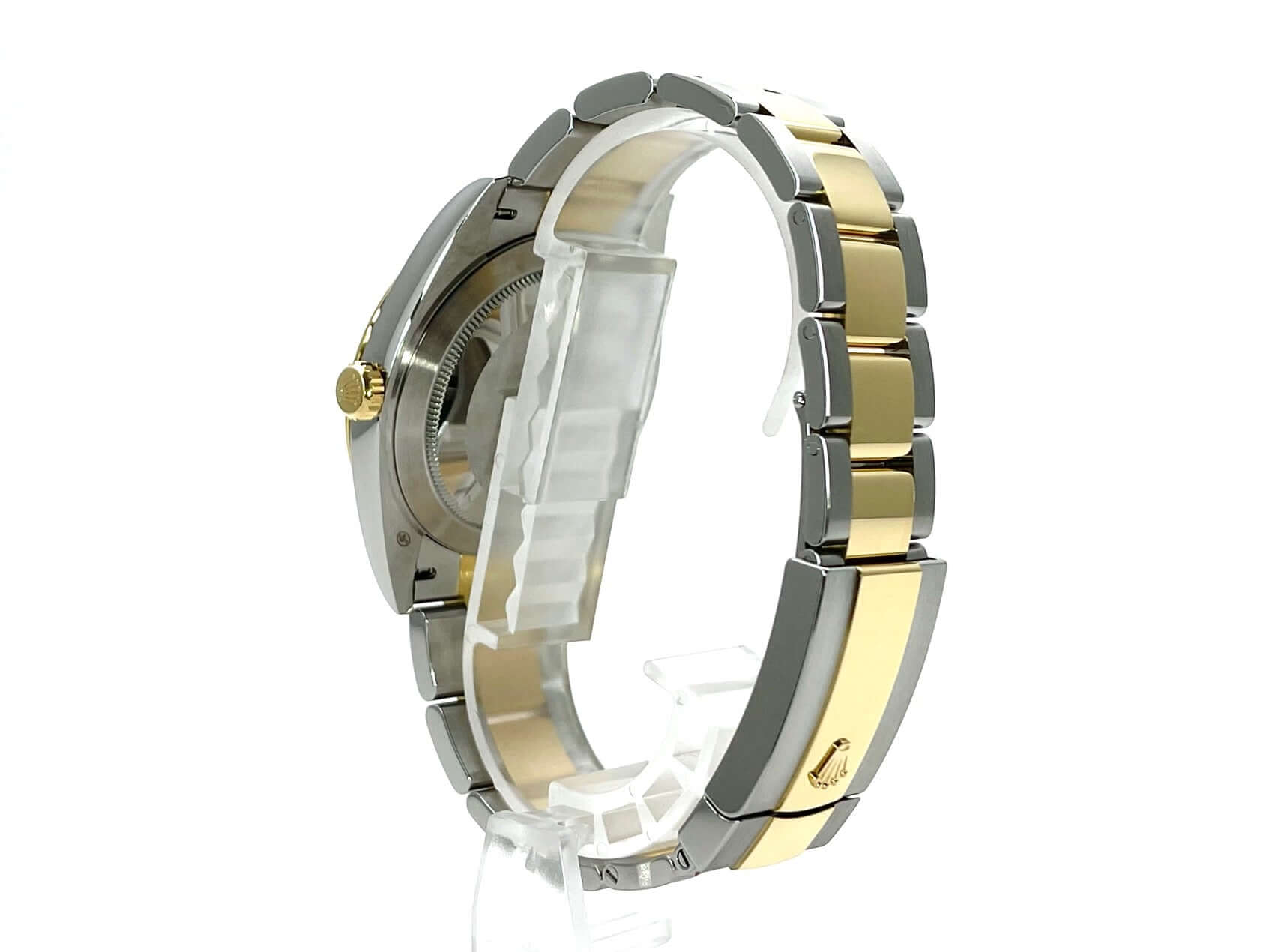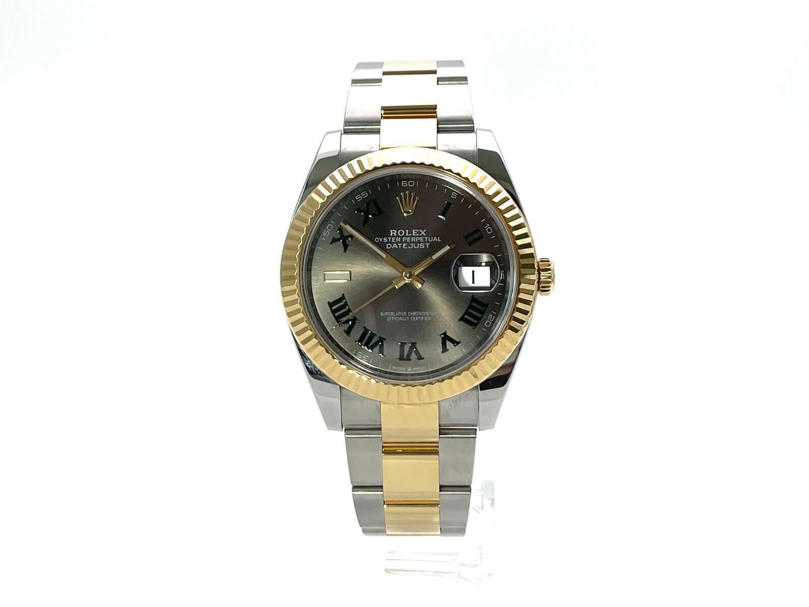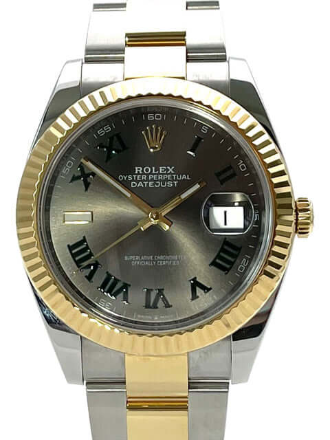 Gehäuse aus Edelstahl / Gelbgold poliert und satiniert, Gehäusedurchmesser 41 mm, geriffelte 18 kt Gelbgold Lünette, Oyster-Armband aus Edelstahl / 18 kt Gelbgold poliert und satiniert mit Faltschließe, Zifferblatt Schiefergrau mit römische Ziffern, Automatikwerk, Rolex Manufakturkaliber 3235, 70 Stunden Gangreserve, Datumsanzeige, Chronometer, kratzfestes Saphirglas, verschraubte 18 kt Gelbgold Krone, Edelstahlboden verschraubt, Wasserdicht bis zu 10 bar.