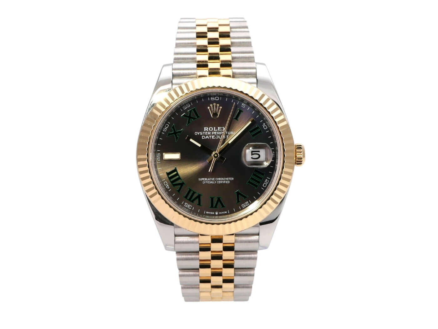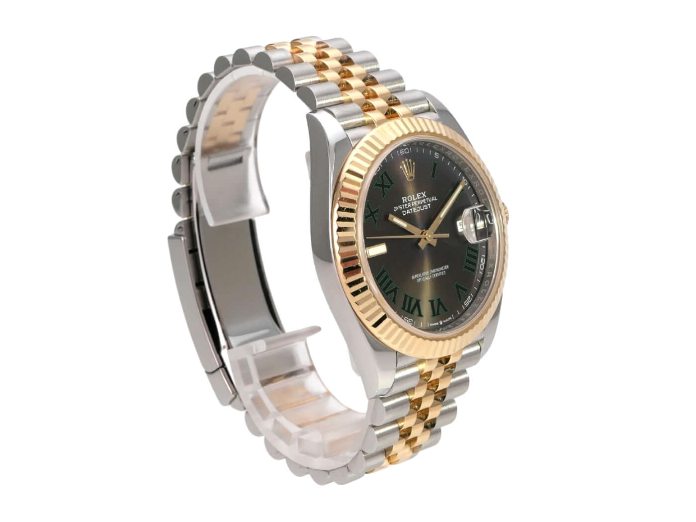 Gehäuse aus Edelstahl / Gelbgold poliert und satiniert, Gehäusedurchmesser 41 mm, geriffelte 18 kt Gelbgold Lünette, Jubile-Armband aus Edelstahl / 18 kt Gelbgold poliert und satiniert mit Faltschließe, Zifferblatt schiefergrau mit römischen Ziffern, Automatikwerk, Rolex Manufakturkaliber 3235, Chronometer, 70 Stunden Gangreserve, Datumsanzeige, kratzfestes Saphirglas, verschraubte 18 kt-Gelbgoldkrone, Edelstahlboden verschraubt, wasserdicht bis zu 10 bar.