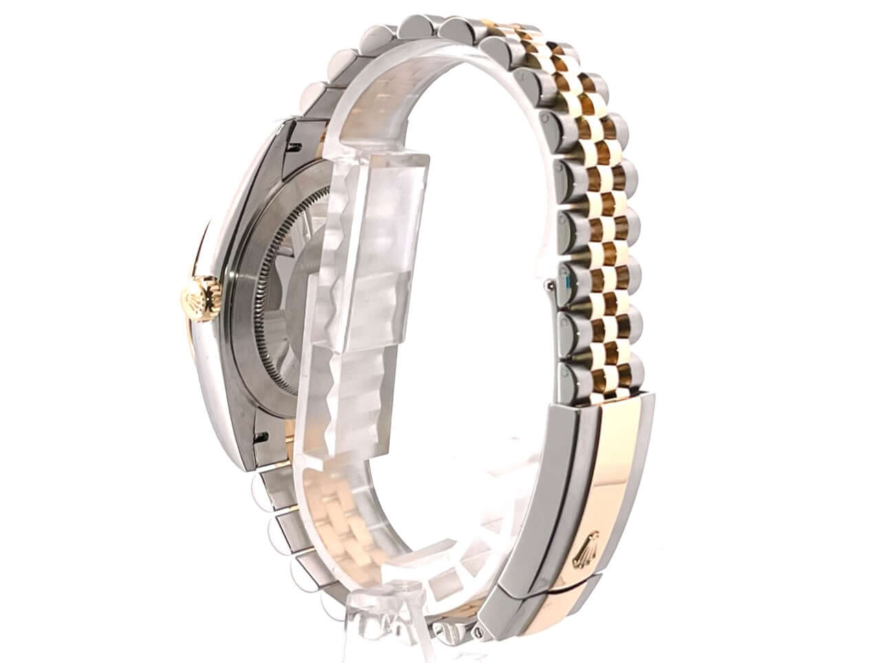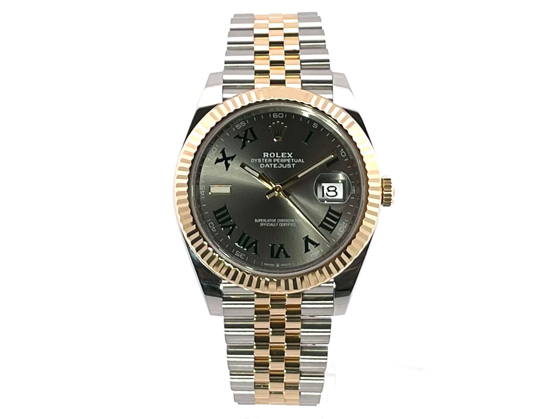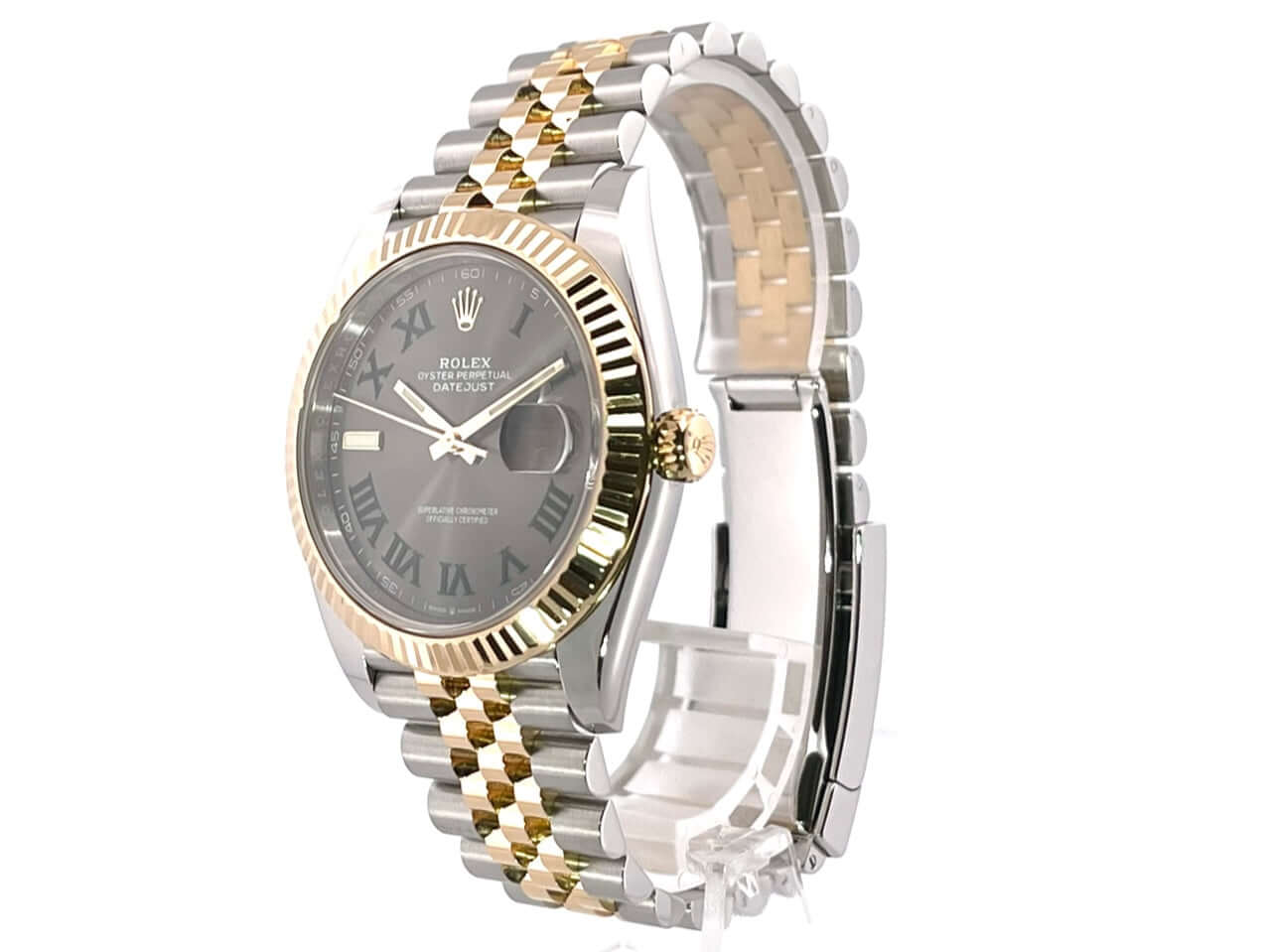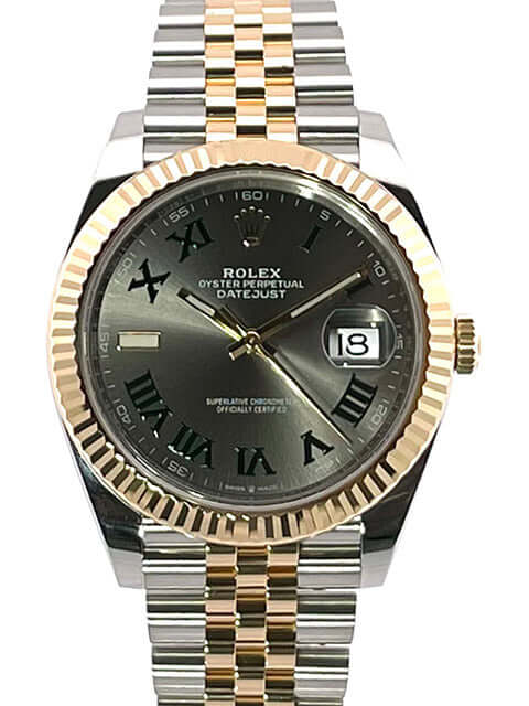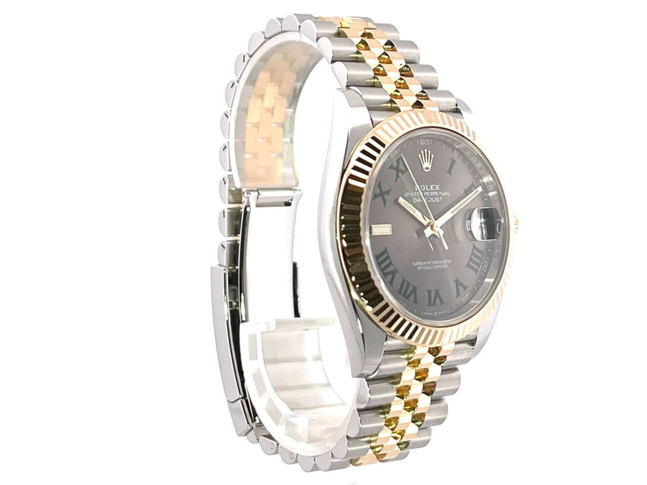 Gehäuse aus Edelstahl / Gelbgold poliert und satiniert, Gehäusedurchmesser 41 mm, geriffelte 18 kt Gelbgold Lünette, Jubile-Armband aus Edelstahl / 18 kt Gelbgold poliert und satiniert mit Faltschließe, Zifferblatt Schiefergrau mit römische Ziffern, Automatikwerk, Rolex Manufakturkaliber 3235, Chronometer, 70 Stunden Gangreserve, Datumsanzeige, kratzfestes Saphirglas, verschraubte 18 kt Gelbgold Krone, Edelstahlboden verschraubt, Wasserdicht bis zu 10 bar.