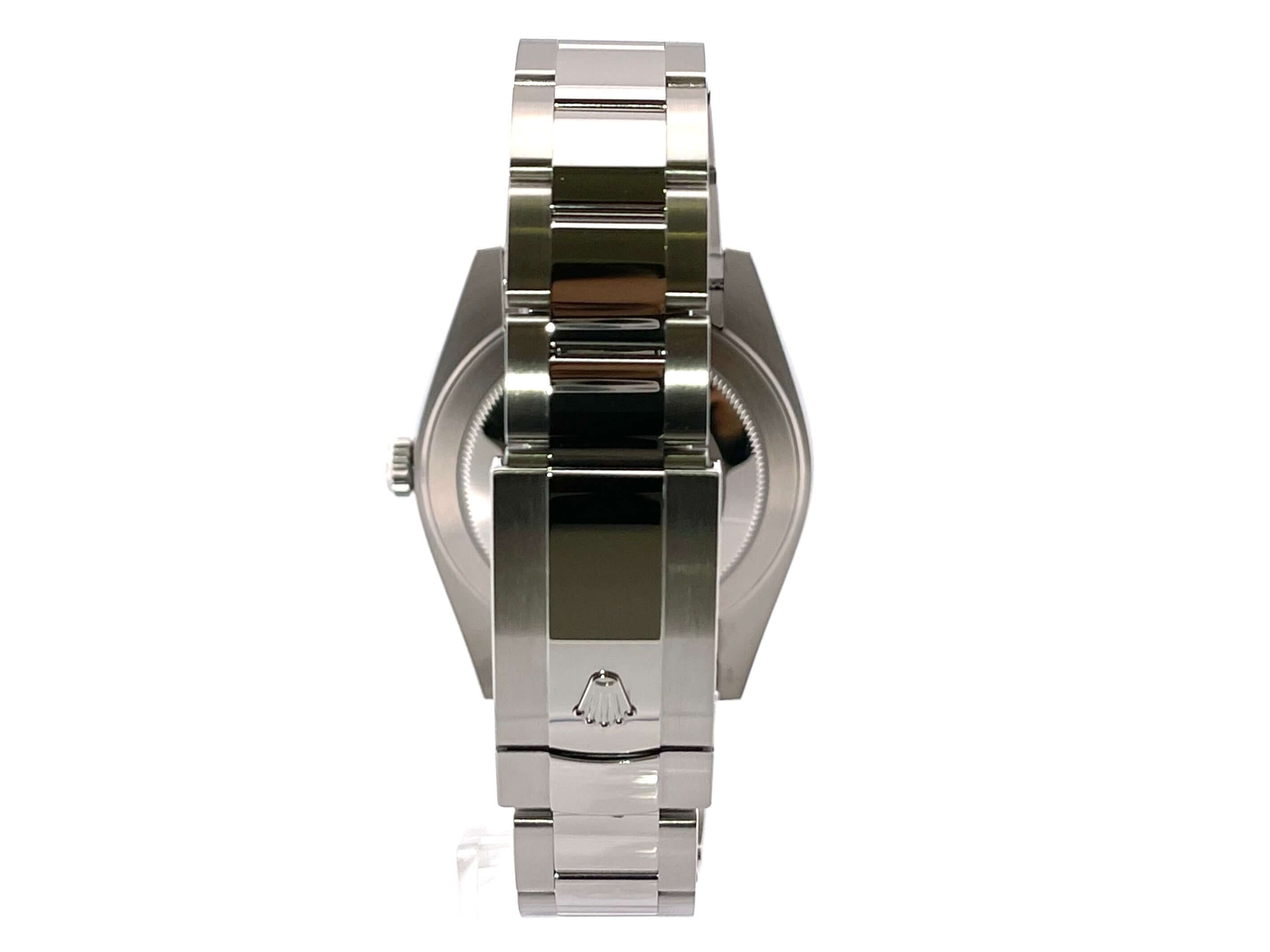 Gehäuse aus Edelstahl poliert und satiniert, Gehäusedurchmesser 41 mm, geriffelte 18 kt Weißgold Lünette, Oyster Edelstahlband poliert und satiniert mit Faltschließe, blaues Zifferblatt mit 18 kt Weißgold Leuchtindizes, Leuchtzeiger, Automatikwerk, Rolex Manufakturkaliber 3235, 70 Stunden Gangreserve, Datumsanzeige, Chronometer, kratzfestes Saphirglas, verschraubte Krone, Edelstahlboden verschraubt, Wasserdicht bis zu 10 bar.
