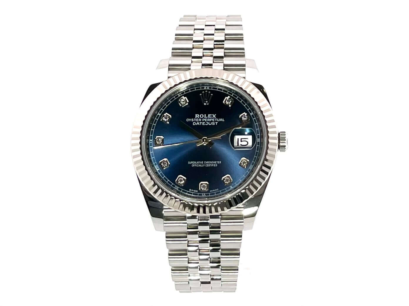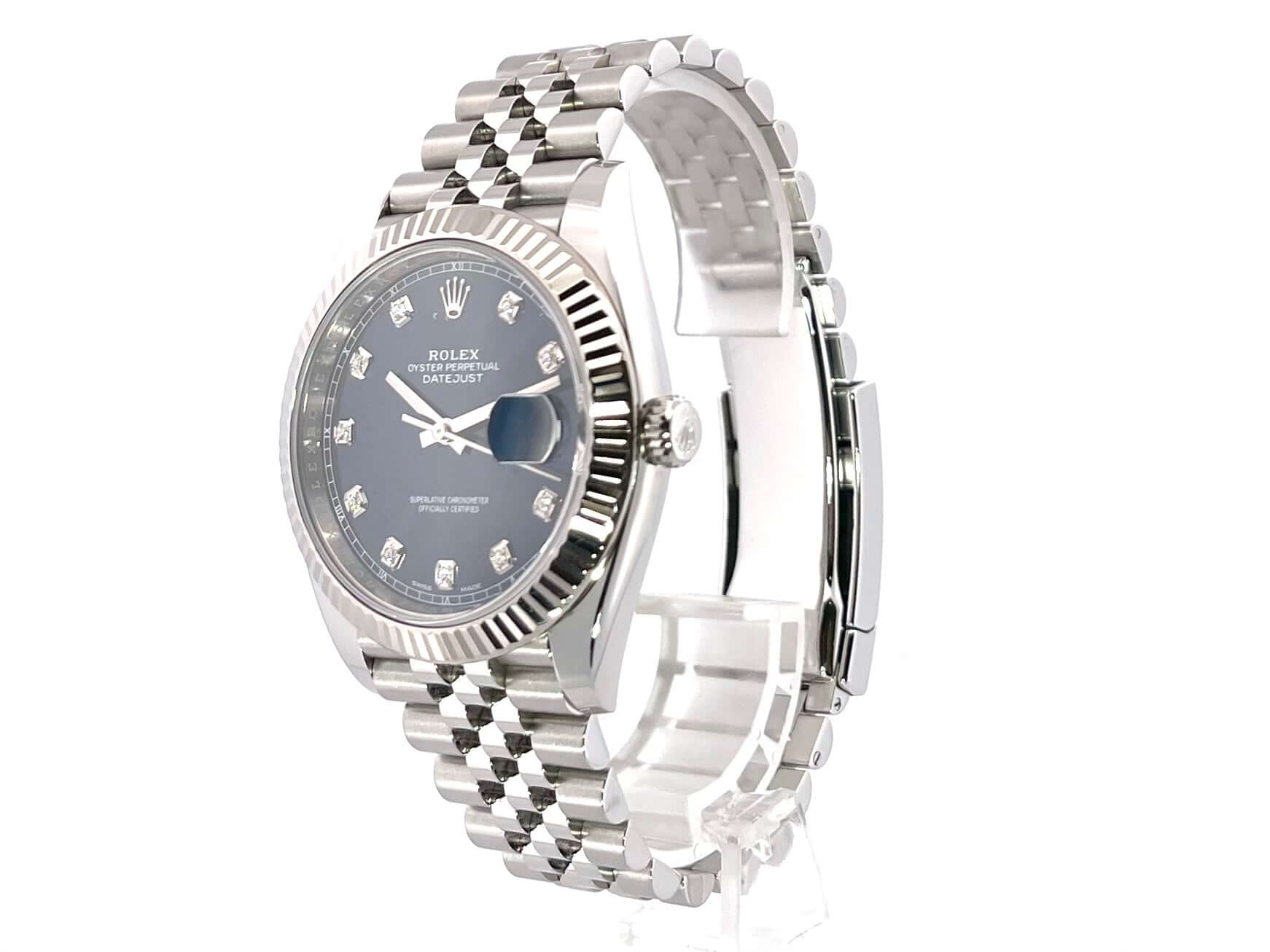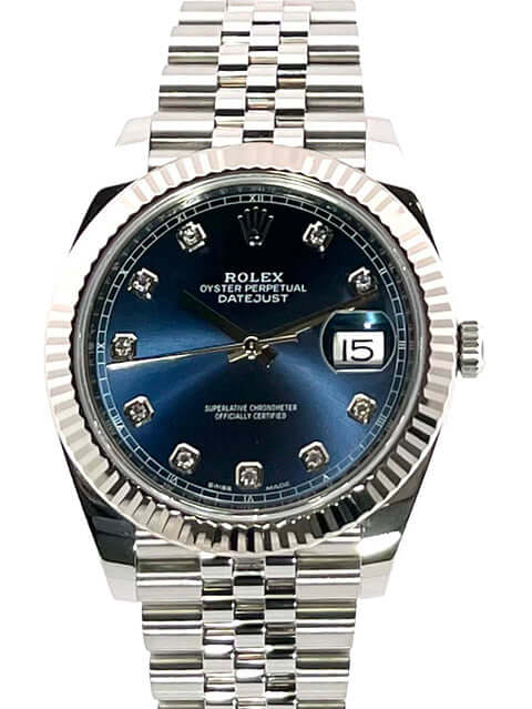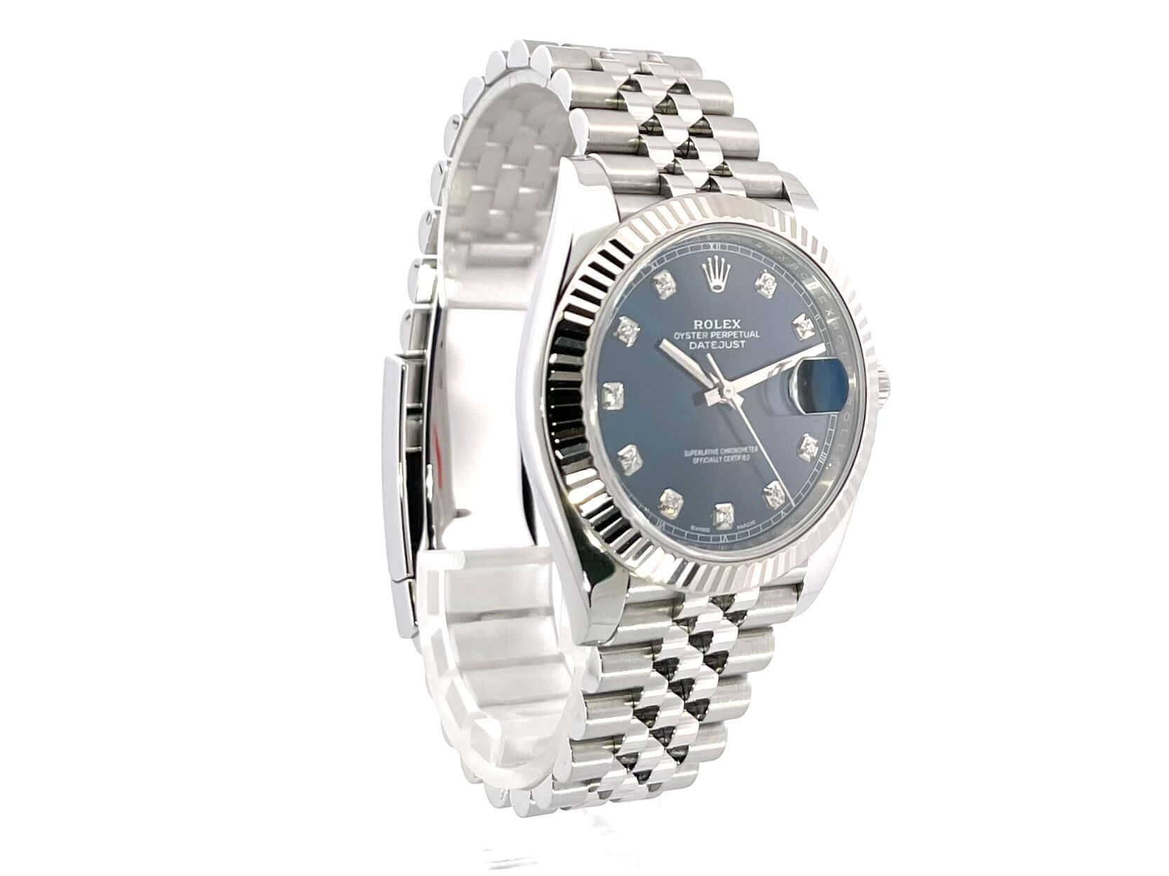 Gehäuse aus Edelstahl poliert und satiniert, Gehäusedurchmesser 41 mm, geriffelte 18 kt Weißgold Lünette, Jubile Edelstahlband poliert und satiniert mit Faltschließe, blaues Diamantzifferblatt, Automatikwerk, Rolex Manufakturkaliber 3235, 70 Stunden Gangreserve, Datumsanzeige, Chronometer, kratzfestes Saphirglas, verschraubte Krone, Edelstahlboden verschraubt, Wasserdicht bis zu 10 bar.