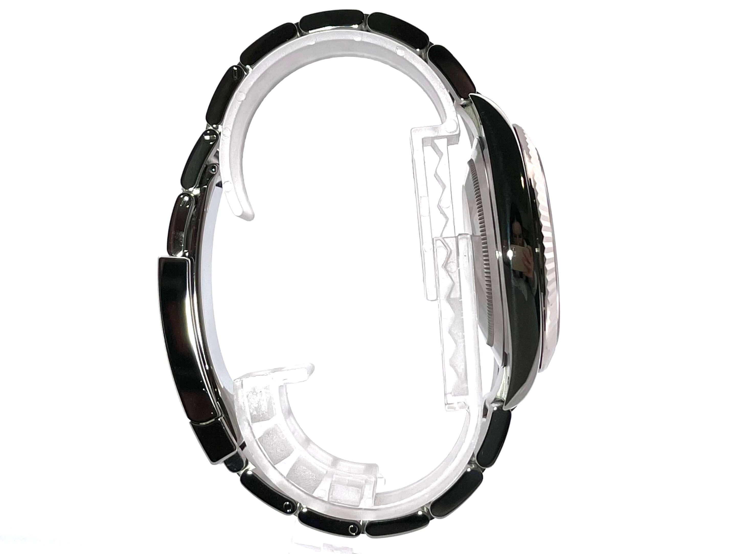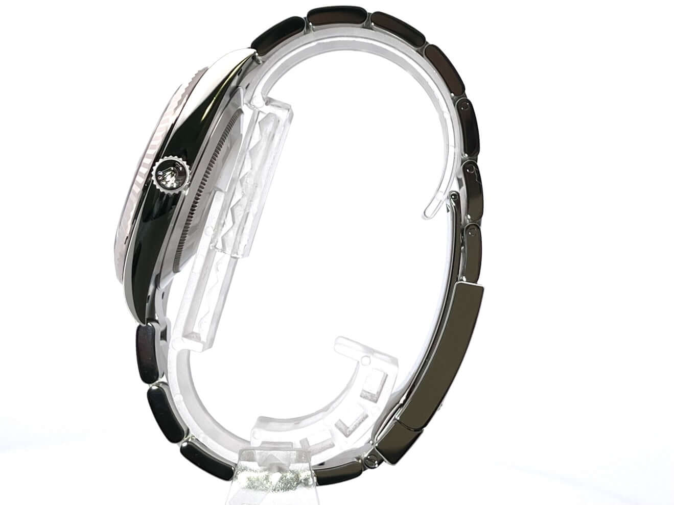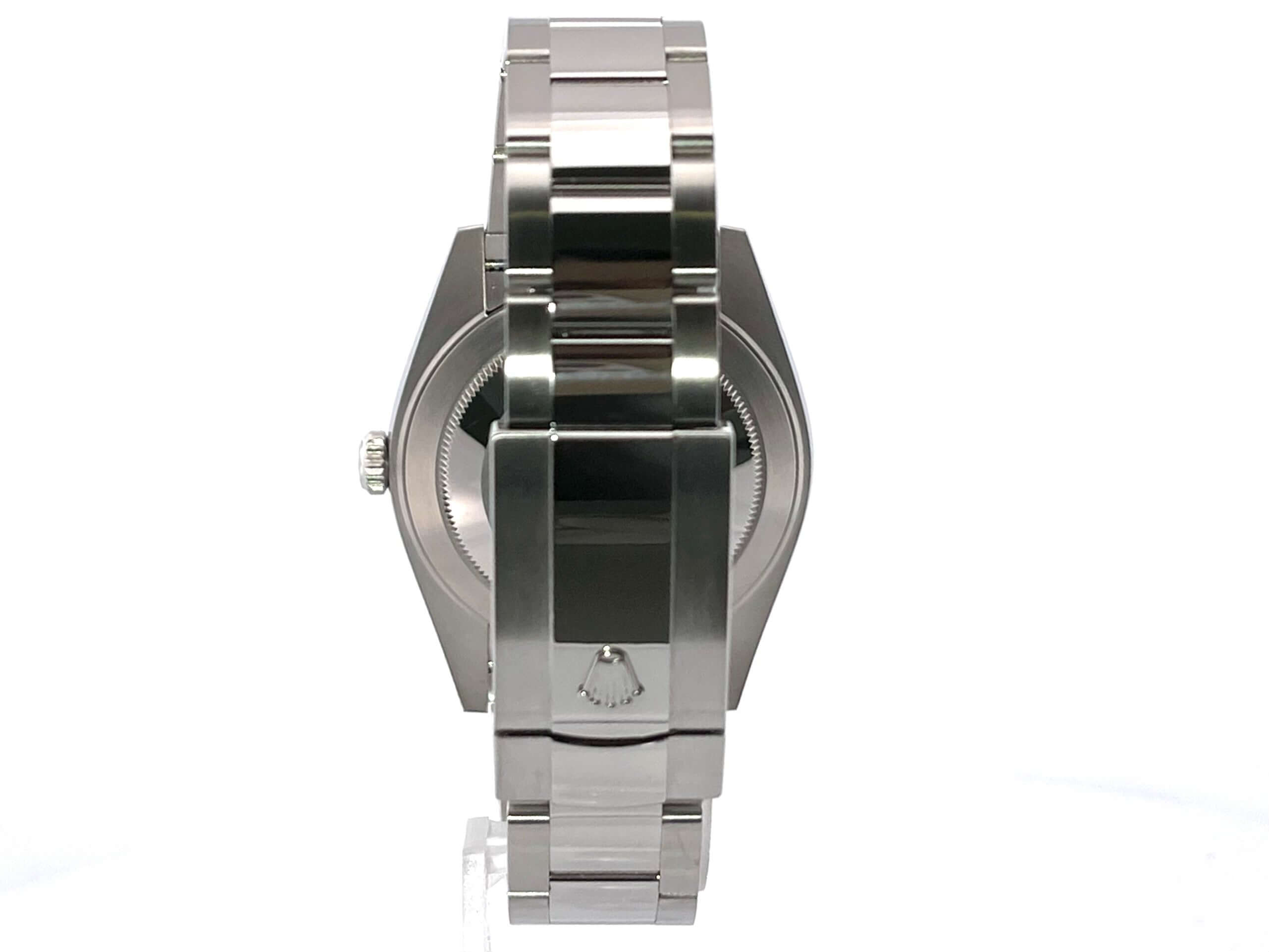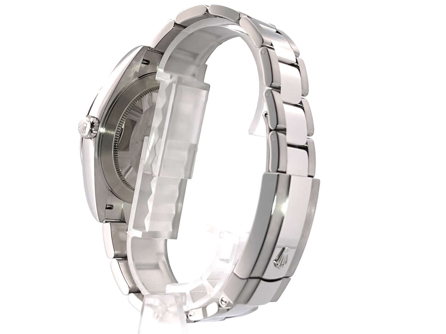 Gehäuse aus Edelstahl poliert und satiniert, Gehäusedurchmesser 41 mm, geriffelte 18 kt Weißgold Lünette, Oyster Edelstahlband poliert und satiniert mit Faltschließe, blaues Diamantzifferblatt, Automatikwerk, Rolex Manufakturkaliber 3235, 70 Stunden Gangreserve, Datumsanzeige, Chronometer, kratzfestes Saphirglas, verschraubte Krone, Edelstahlboden verschraubt, Wasserdicht bis zu 10 bar.