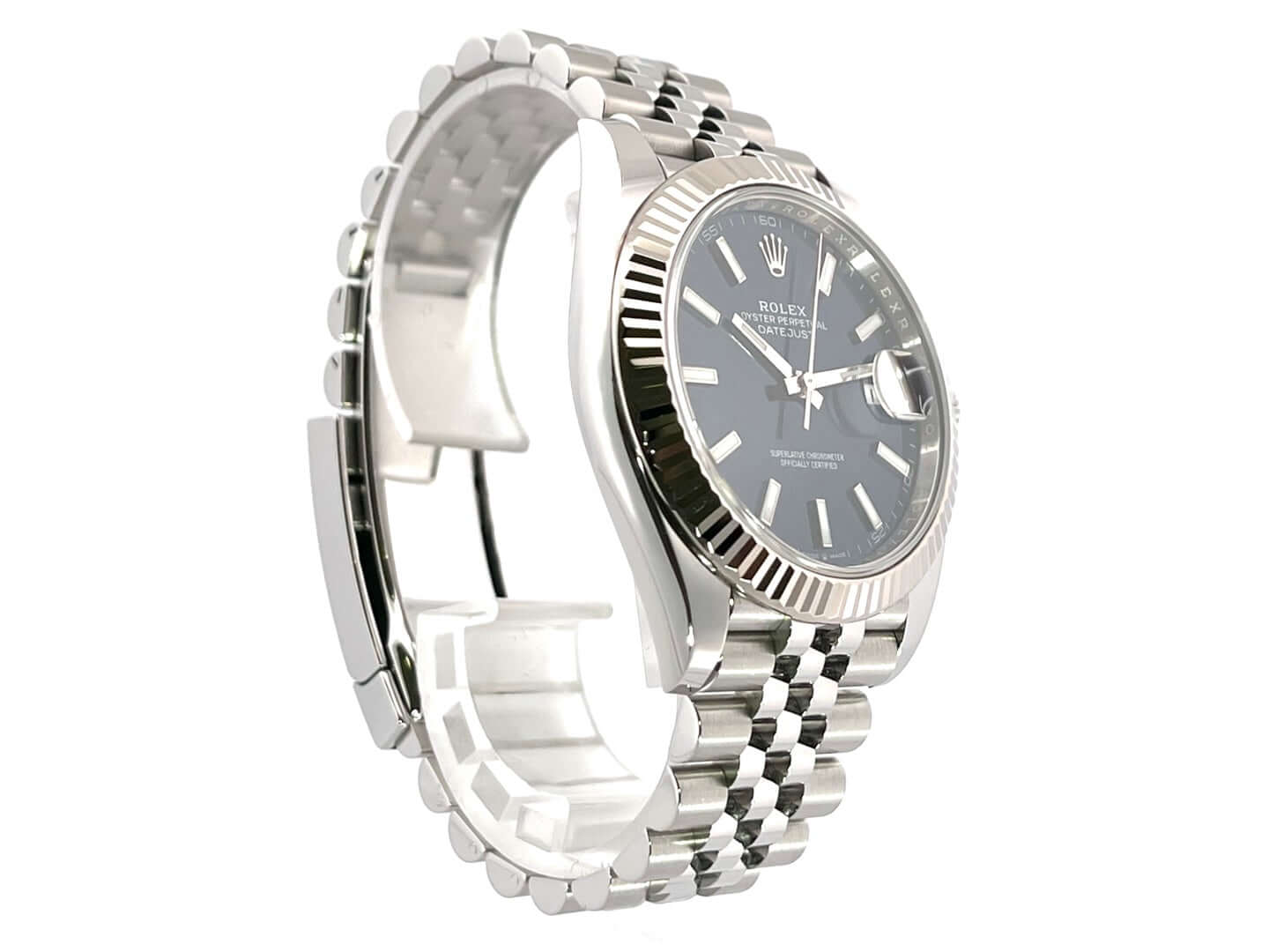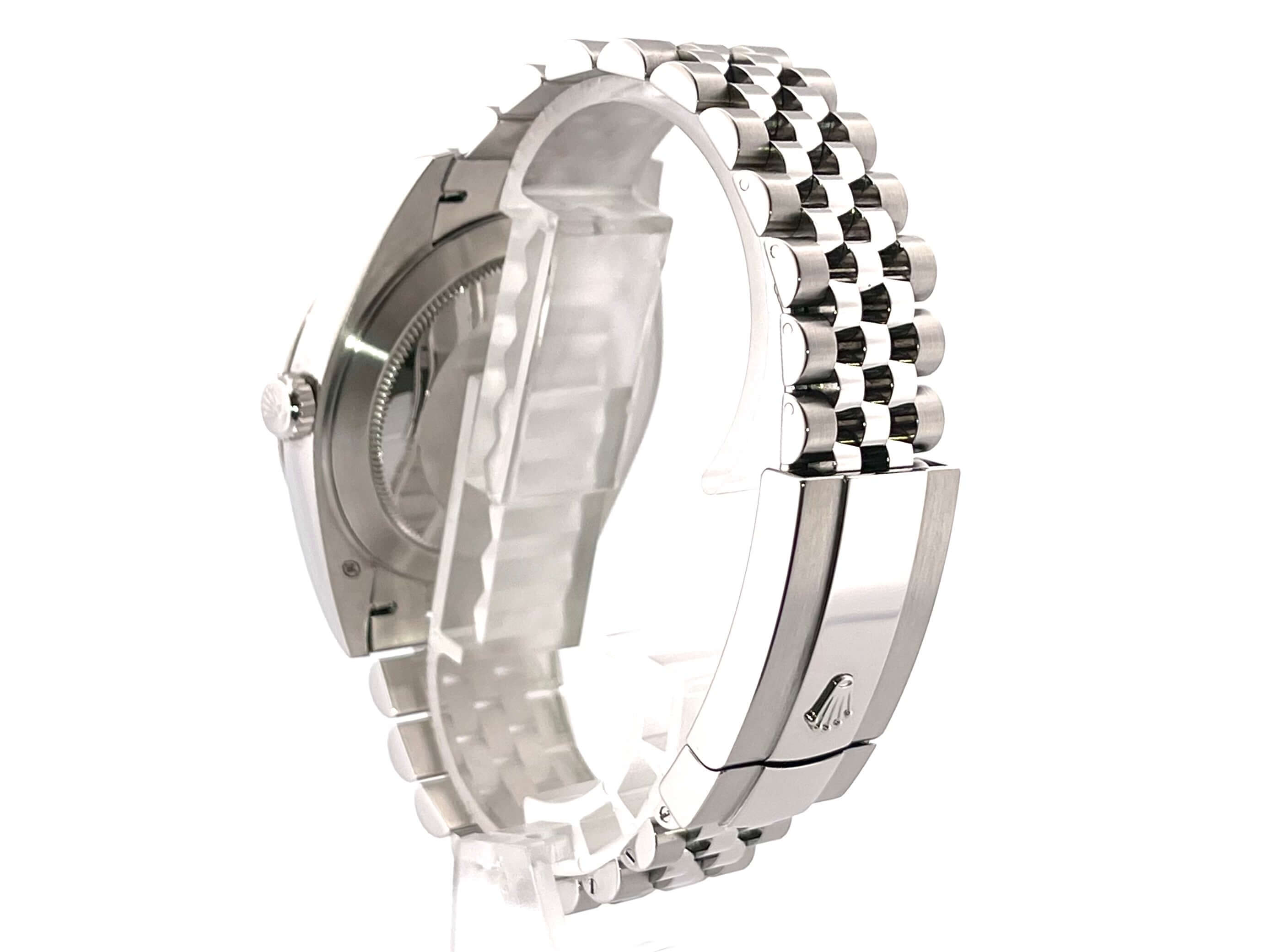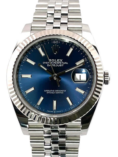 Gehäuse aus Edelstahl poliert und satiniert, Gehäusedurchmesser 41 mm, geriffelte 18 kt Weißgold Lünette, Jubile Armband aus Edelstahl poliert und satiniert mit Faltschließe, blaues Zifferblatt mit 18 kt Weißgold Leuchtindizes, Leuchtzeiger, Automatikwerk, Rolex Manufakturkaliber 3235, 70 Stunden Gangreserve, Datumsanzeige, Chronometer, kratzfestes Saphirglas, verschraubte Krone, Edelstahlboden verschraubt, Wasserdicht bis zu 10 bar.