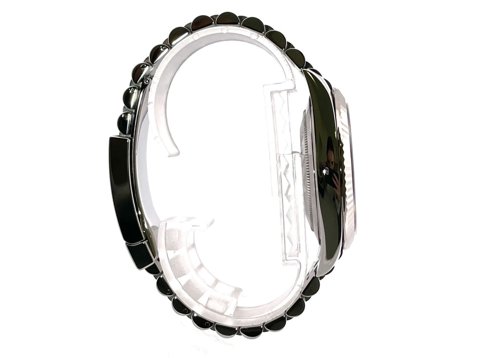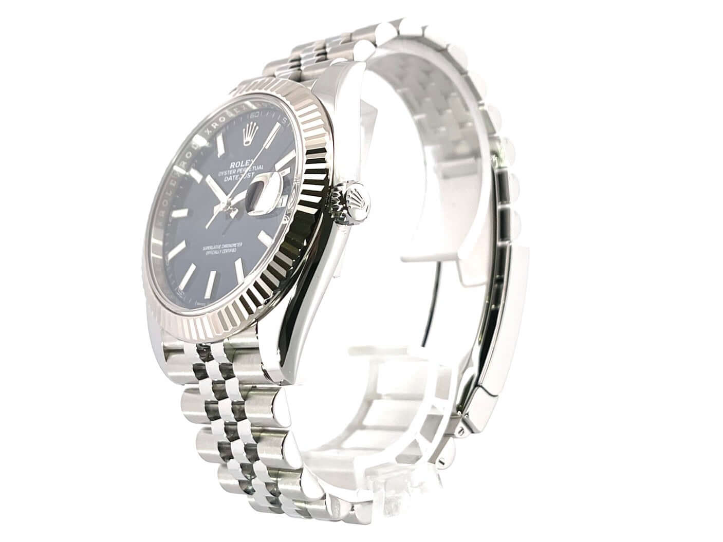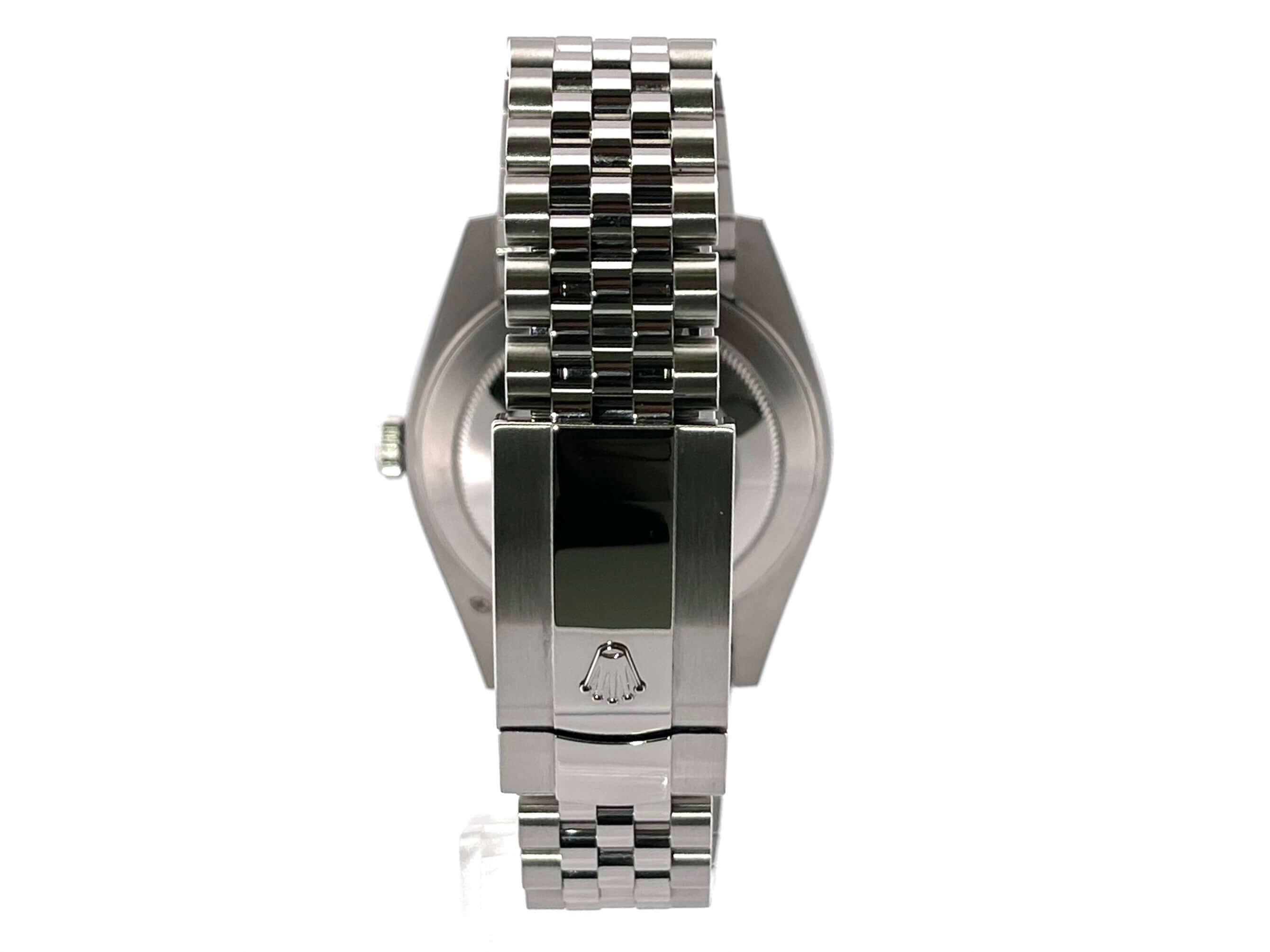 Gehäuse aus Edelstahl poliert und satiniert, Gehäusedurchmesser 41 mm, geriffelte 18 kt Weißgold Lünette, Jubile Armband aus Edelstahl poliert und satiniert mit Faltschließe, blaues Zifferblatt mit 18 kt Weißgold Leuchtindizes, Leuchtzeiger, Automatikwerk, Rolex Manufakturkaliber 3235, 70 Stunden Gangreserve, Datumsanzeige, Chronometer, kratzfestes Saphirglas, verschraubte Krone, Edelstahlboden verschraubt, Wasserdicht bis zu 10 bar.