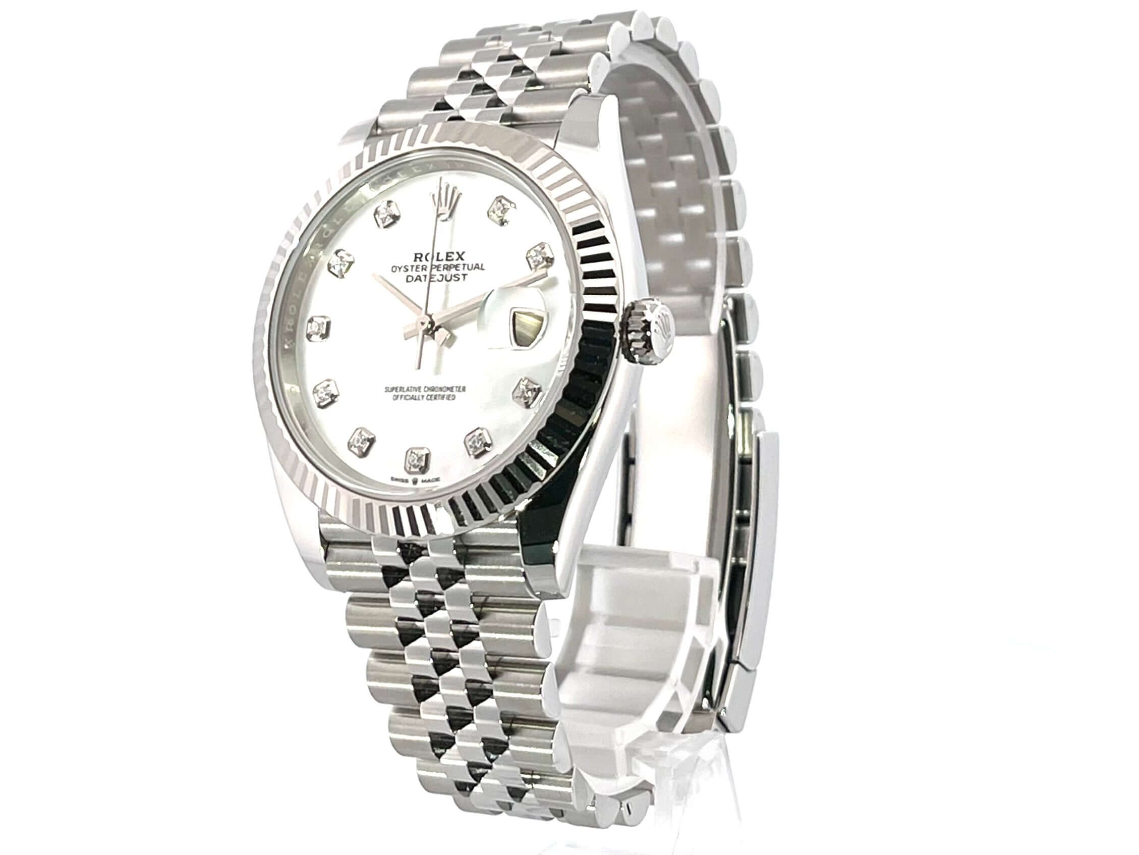 Gehäuse aus Edelstahl poliert und satiniert, Gehäusedurchmesser 41 mm, geriffelte 18 kt Weißgold Lünette, Jubile Edelstahlband poliert und satiniert mit Faltschließe, Perlmuttzifferblatt mit Diamanten, Automatikwerk, Rolex Manufakturkaliber 3235, 70 Stunden Gangreserve, Datumsanzeige, Chronometer, kratzfestes Saphirglas, verschraubte Krone, Edelstahlboden verschraubt, Wasserdicht bis zu 10 bar.