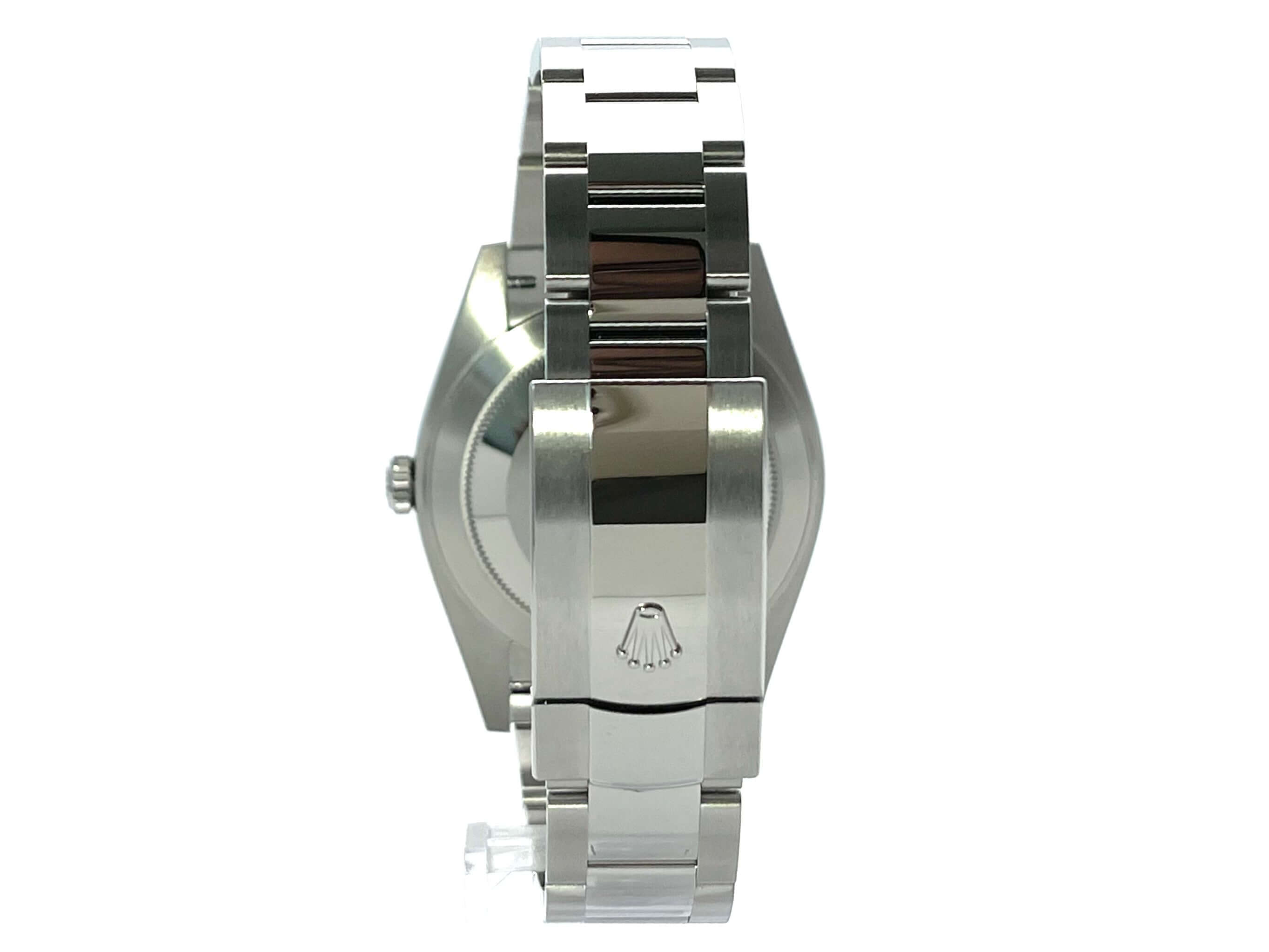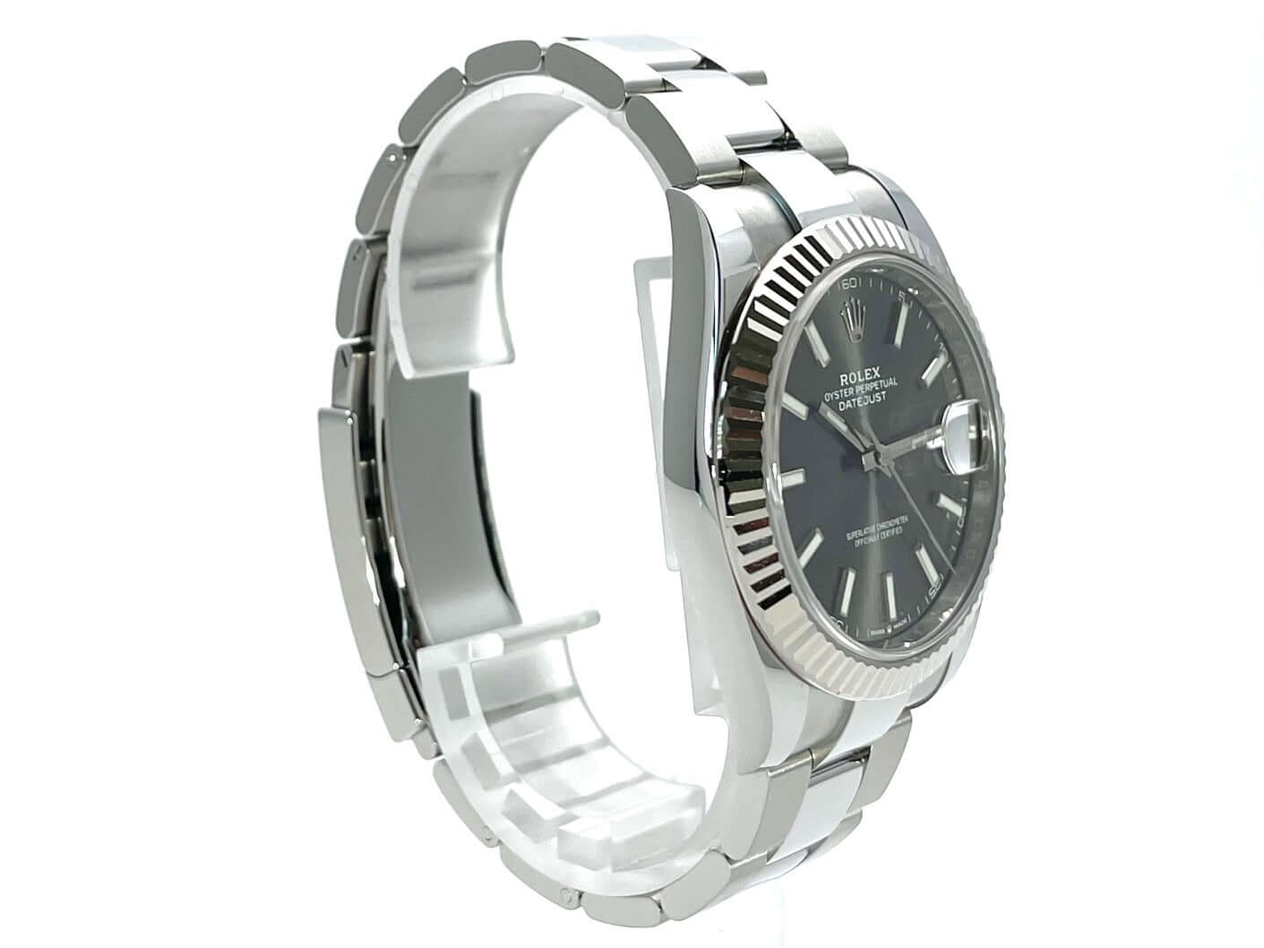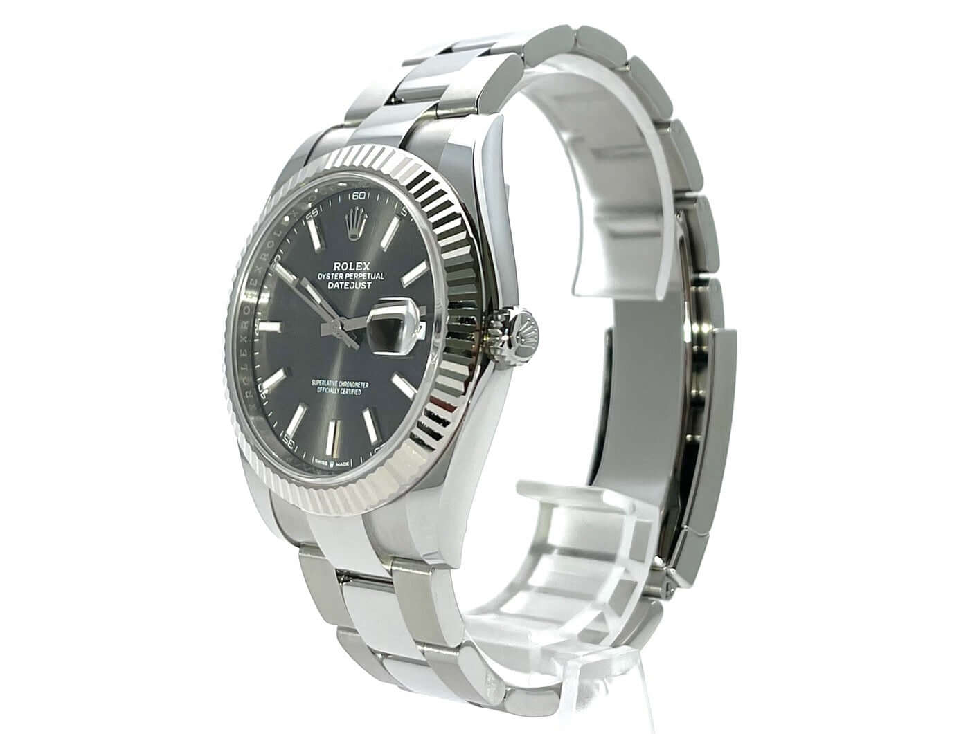 Gehäuse aus Edelstahl poliert und satiniert, Gehäusedurchmesser 41 mm, geriffelte 18 kt Weißgold Lünette, Oyster Edelstahlband poliert und satiniert mit Faltschließe, graues Zifferblatt mit 18 kt Weißgold Leuchtindizes, Leuchtzeiger, Automatikwerk, Rolex Manufakturkaliber 3235, 70 Stunden Gangreserve, Datumsanzeige, Chronometer, kratzfestes Saphirglas, verschraubte Krone, Edelstahlboden verschraubt, Wasserdicht bis zu 10 bar.