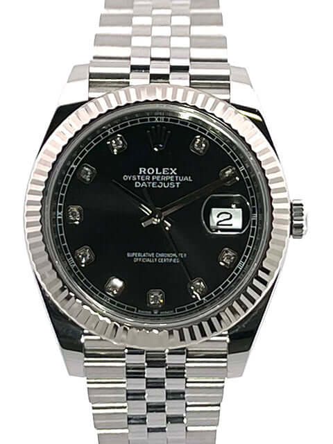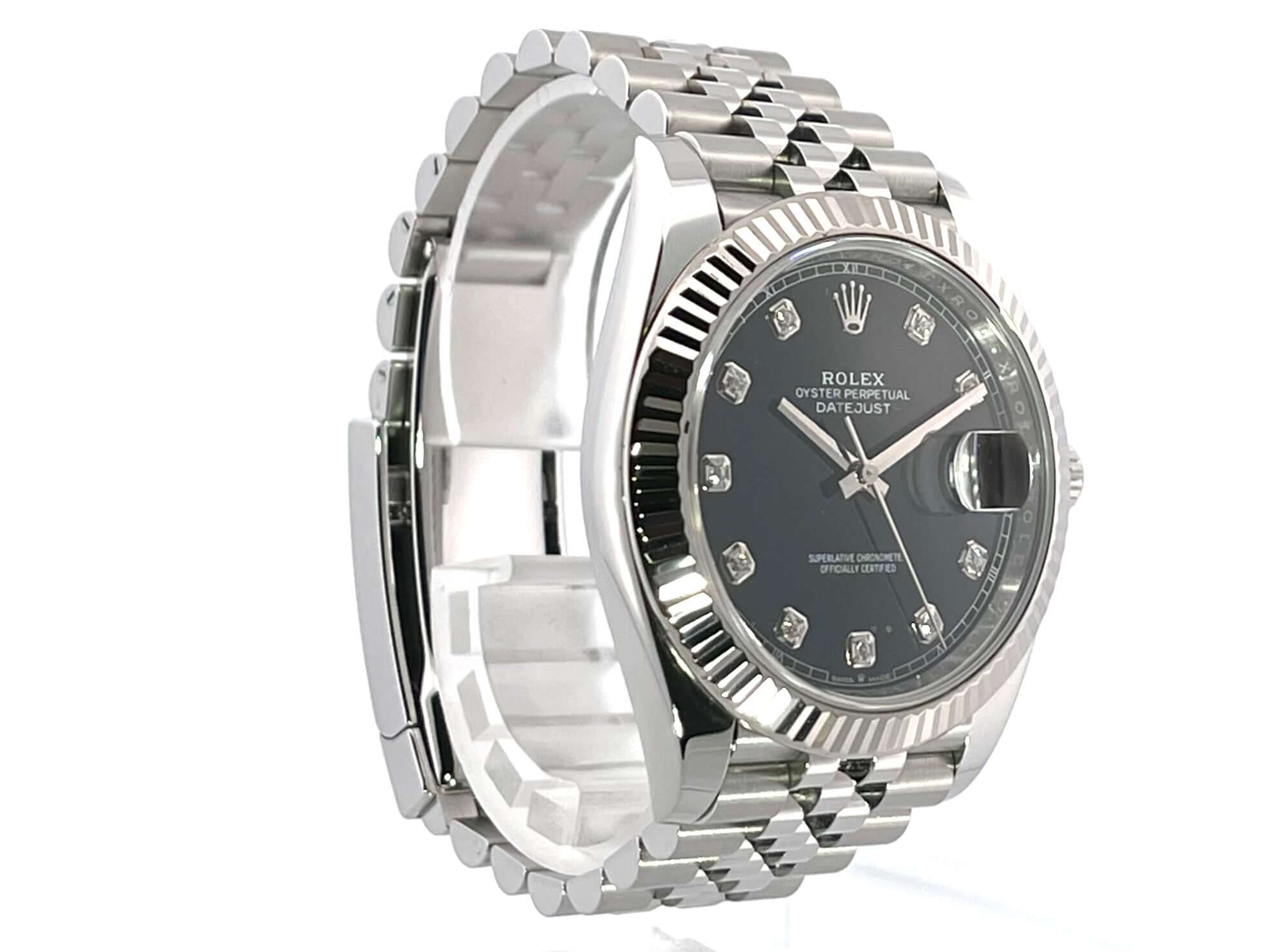 Gehäuse aus Edelstahl poliert und satiniert, Gehäusedurchmesser 41 mm, geriffelte 18 kt Weißgold Lünette, Jubile Edelstahlband poliert und satiniert mit Faltschließe, schwarzes Diamantzifferblatt, Automatikwerk, Rolex Manufakturkaliber 3235, 70 Stunden Gangreserve, Datumsanzeige, Chronometer, kratzfestes Saphirglas, verschraubte Krone, Edelstahlboden verschraubt, Wasserdicht bis zu 10 bar.