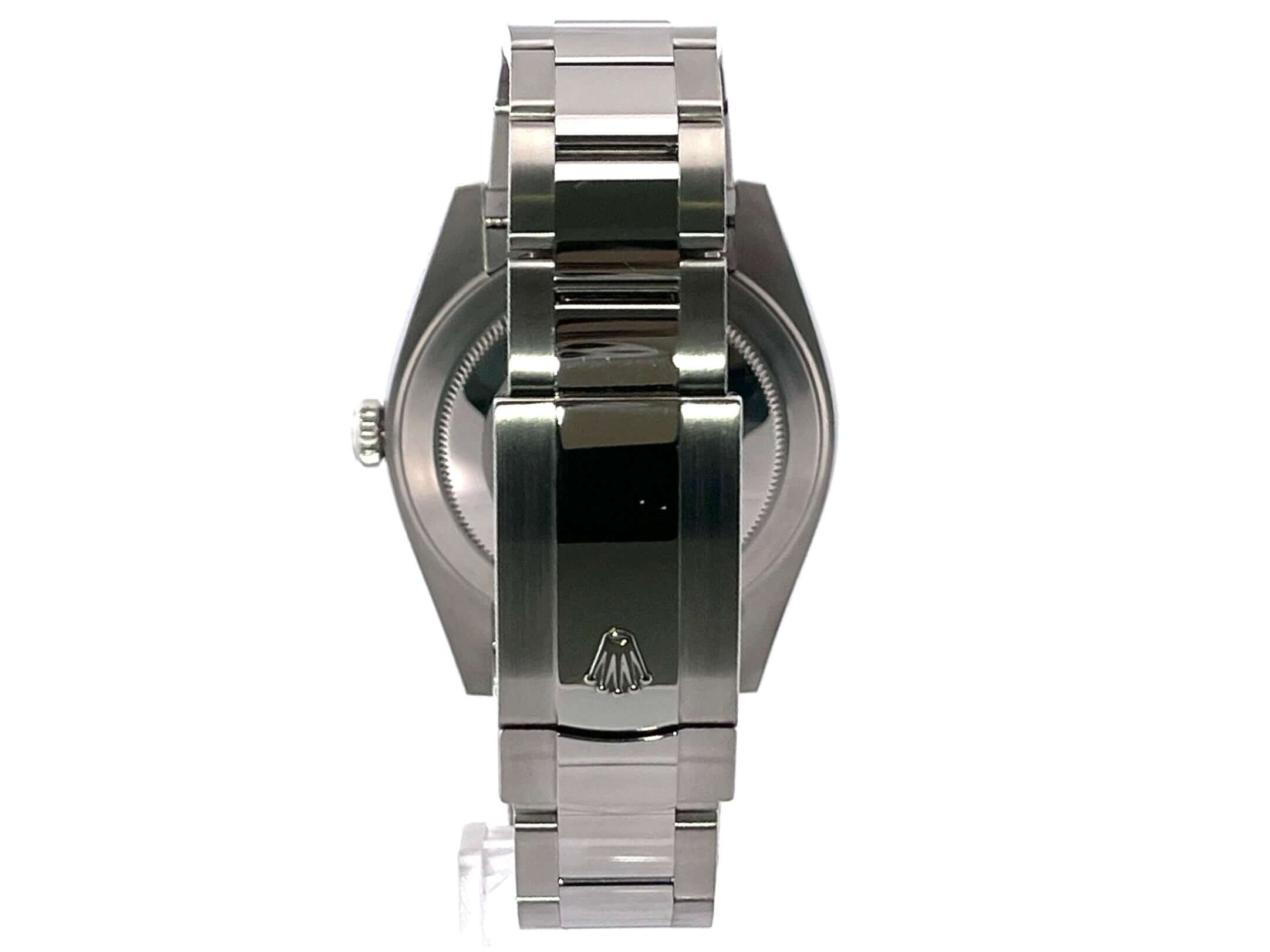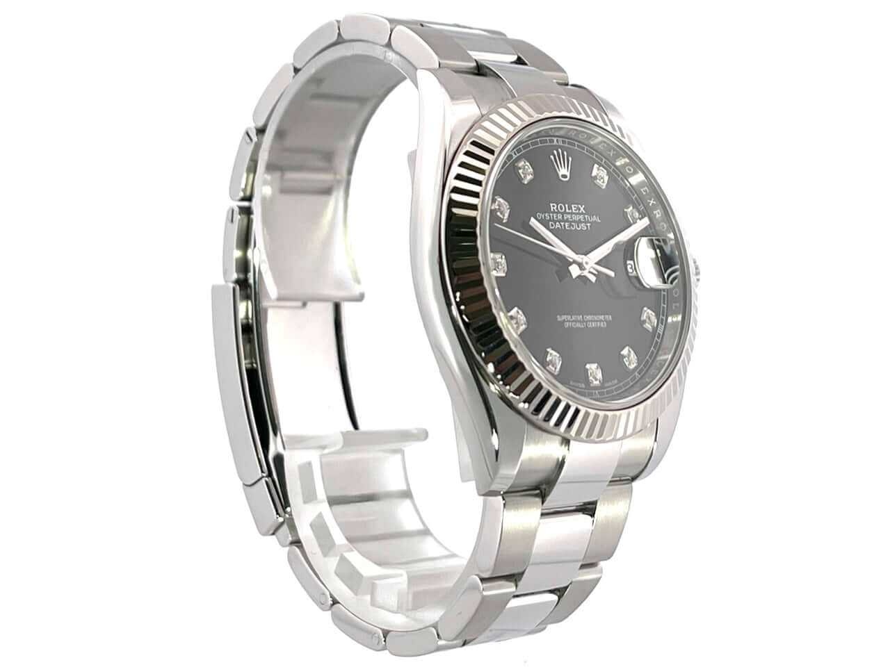 Gehäuse aus Edelstahl poliert und satiniert, Gehäusedurchmesser 41 mm, geriffelte 18 kt Weißgold Lünette, Oyster Edelstahlband poliert und satiniert mit Faltschließe, schwarzes Diamantzifferblatt, Automatikwerk, Rolex Manufakturkaliber 3235, 70 Stunden Gangreserve, Datumsanzeige, Chronometer, kratzfestes Saphirglas, verschraubte Krone, Edelstahlboden verschraubt, Wasserdicht bis zu 10 bar.