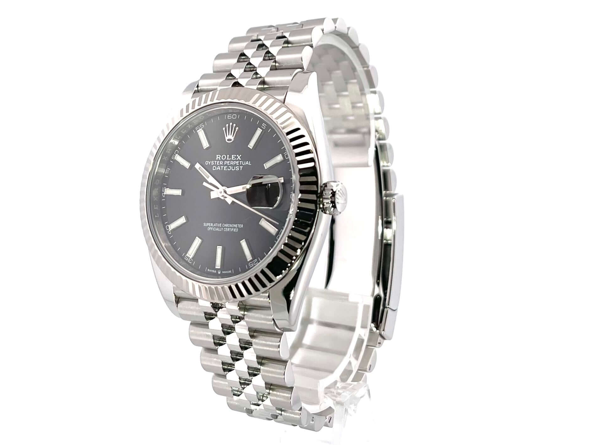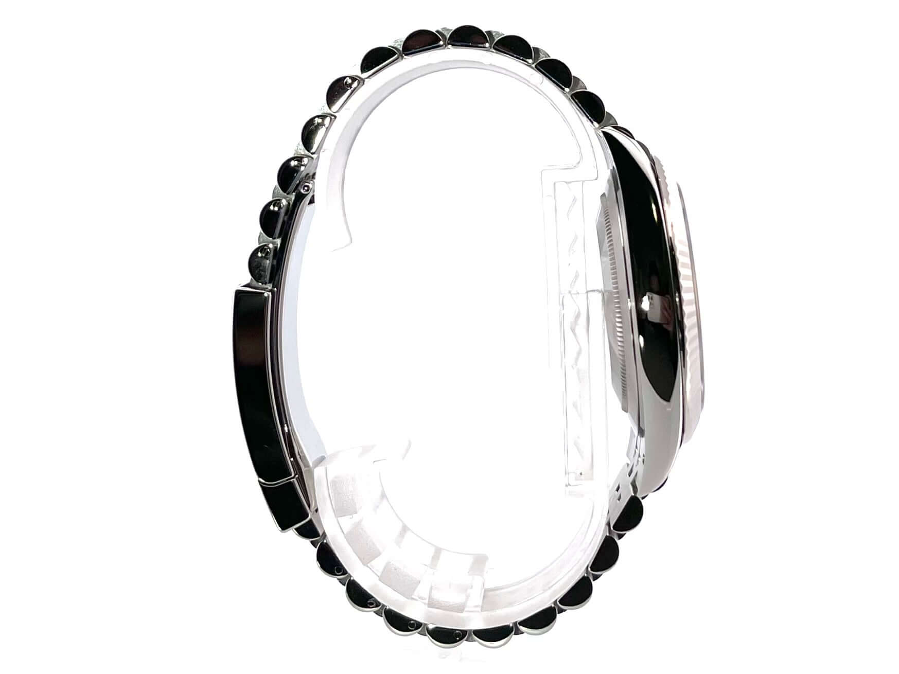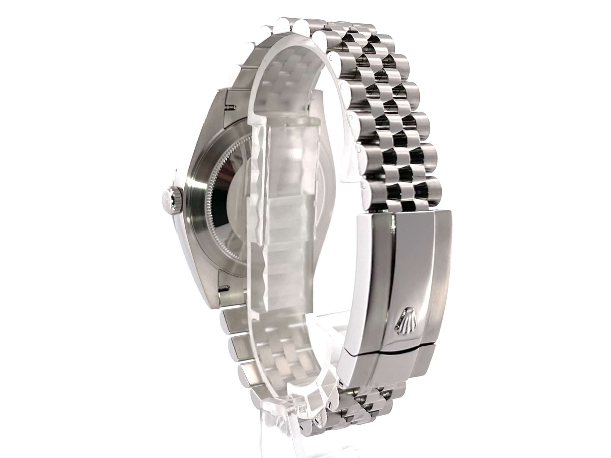 Gehäuse aus Edelstahl poliert und satiniert, Gehäusedurchmesser 41 mm, geriffelte 18 kt Weißgold Lünette, Jubile-Armband aus Edelstahl poliert und satiniert mit Faltschließe, schwarzes Zifferblatt mit 18 kt Weißgold LeuchtIndizes, Leuchtzeiger, Automatikwerk, Rolex Manufakturkaliber 3235, 70 Stunden Gangreserve, Datumsanzeige, Chronometer, kratzfestes Saphirglas, verschraubte Krone, Edelstahlboden verschraubt, Wasserdicht bis zu 10 bar.