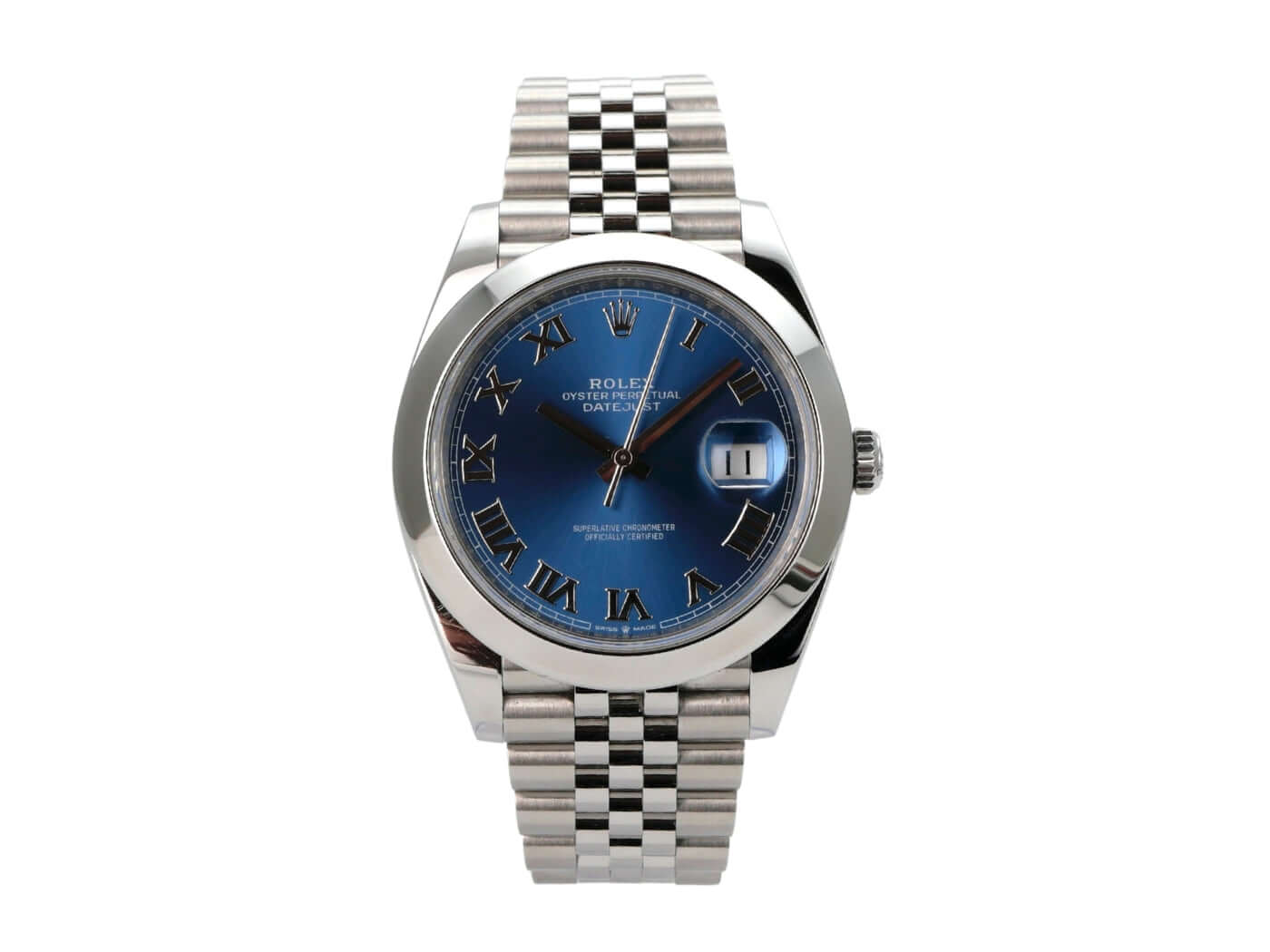 Gehäuse aus Edelstahl poliert und satiniert, Gehäusedurchmesser 41 mm, polierte Edelstahl Lünette, Jubile Edelstahlband poliert und satiniert mit Faltschließe, blaues Zifferblatt mit römischen Ziffern, Automatikwerk, Rolex Manufakturkaliber 3235, 70 Stunden Gangreserve, Datumsanzeige, Chronometer, kratzfestes Saphirglas, verschraubte Krone, Edelstahlboden verschraubt, wasserdicht bis zu 10 bar.