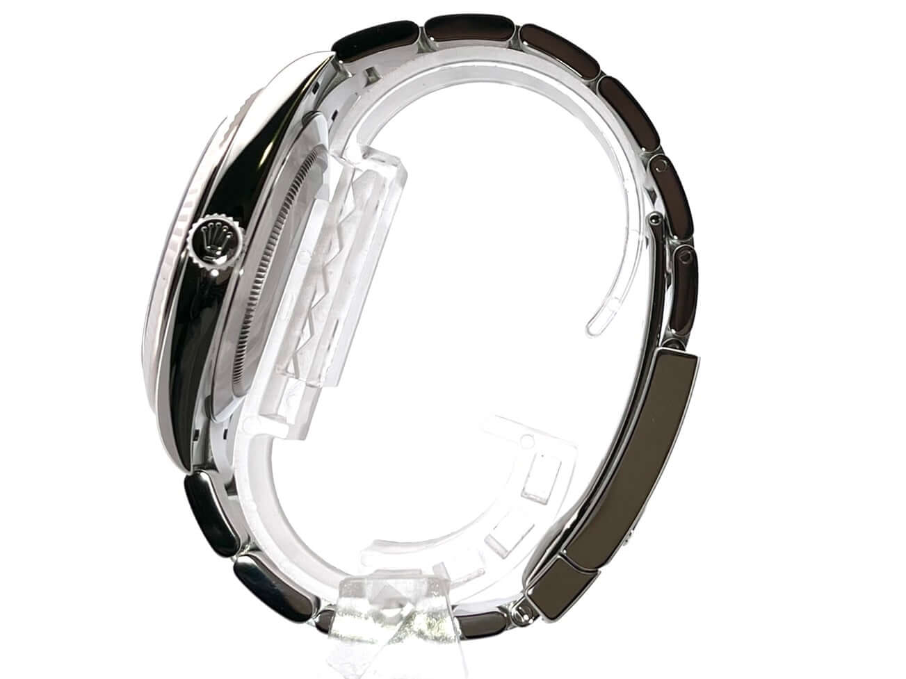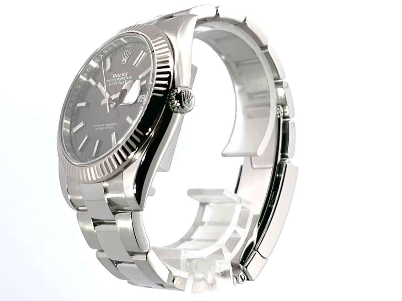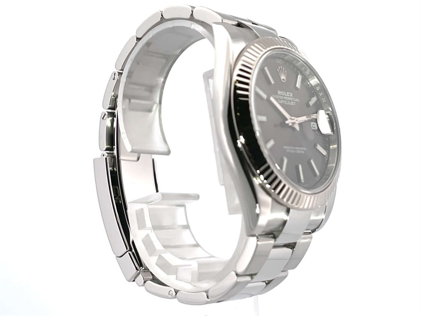 Gehäuse aus Edelstahl poliert und satiniert, Gehäusedurchmesser 41 mm, geriffelte 18 kt Weißgold Lünette, Oyster-Armband aus Edelstahl poliert und satiniert mit Faltschließe, rhodiumfarbenes Zifferblatt mit Leuchtindizes, Leuchtzeiger, Automatikwerk, Rolex Manufakturkaliber 3235, 70 Stunden Gangreserve, Datumsanzeige, Chronometer, kratzfestes Saphirglas, verschraubte Krone, Edelstahlboden verschraubt, Wasserdicht bis zu 10 bar.