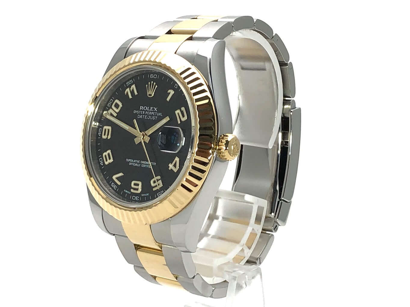 Gehäuse aus Edelstahl poliert und satiniert, Gehäusedurchmesser 41 mm, geriffelte 18 kt Gelbgold Lünette, Oyster Edelstahl / 18 kt Gelbgold Armband poliert und satiniert mit Faltschließe, schwarzes Zifferblatt mit goldenen arabischen Ziffern, Gelbgold Leuchtzeiger, Automatikwerk, Rolex Manufakturkaliber 3136 mit 31 Steinen, Datumsanzeige, Chronometer, kratzfestes Saphirglas, verschraubte Krone, Edelstahlboden verschraubt, Wasserdicht bis zu 10 bar.