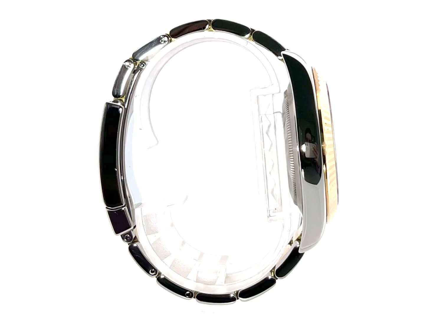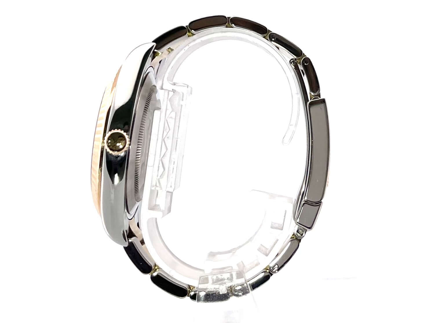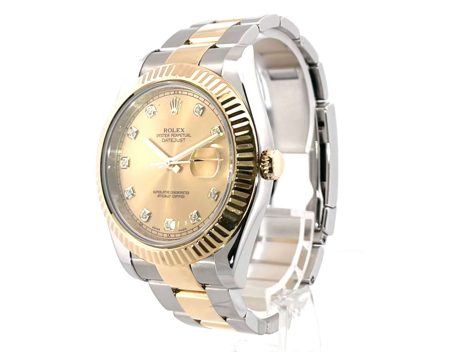 Gehäuse Edelstahl poliert und satiniert, Gehäusedurchmesser 41 mm, geriffelte 18 kt Gelbgold Lünette, Oyster Edelstahl / 18 kt Gelbgold Armband poliert und satiniert mit Faltschließe, champagnerfarbenes Zifferblatt mit 10 aufgesetzten Diamanten, Leuchtzeiger, Automatikwerk, Rolex Manufakturkaliber 3136 mit 31 Steinen, Datumsanzeige, Chronometer, kratzfestes Saphirglas, verschraubbare Krone, Edelstahlboden verschraubt, Wasserdicht bis zu 10 bar.