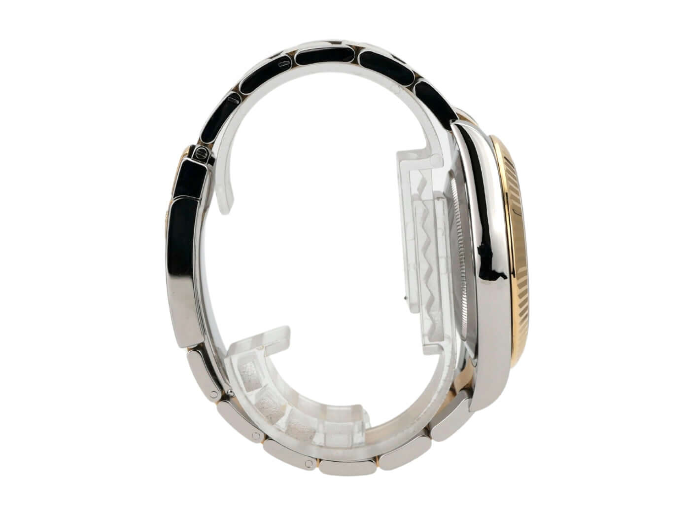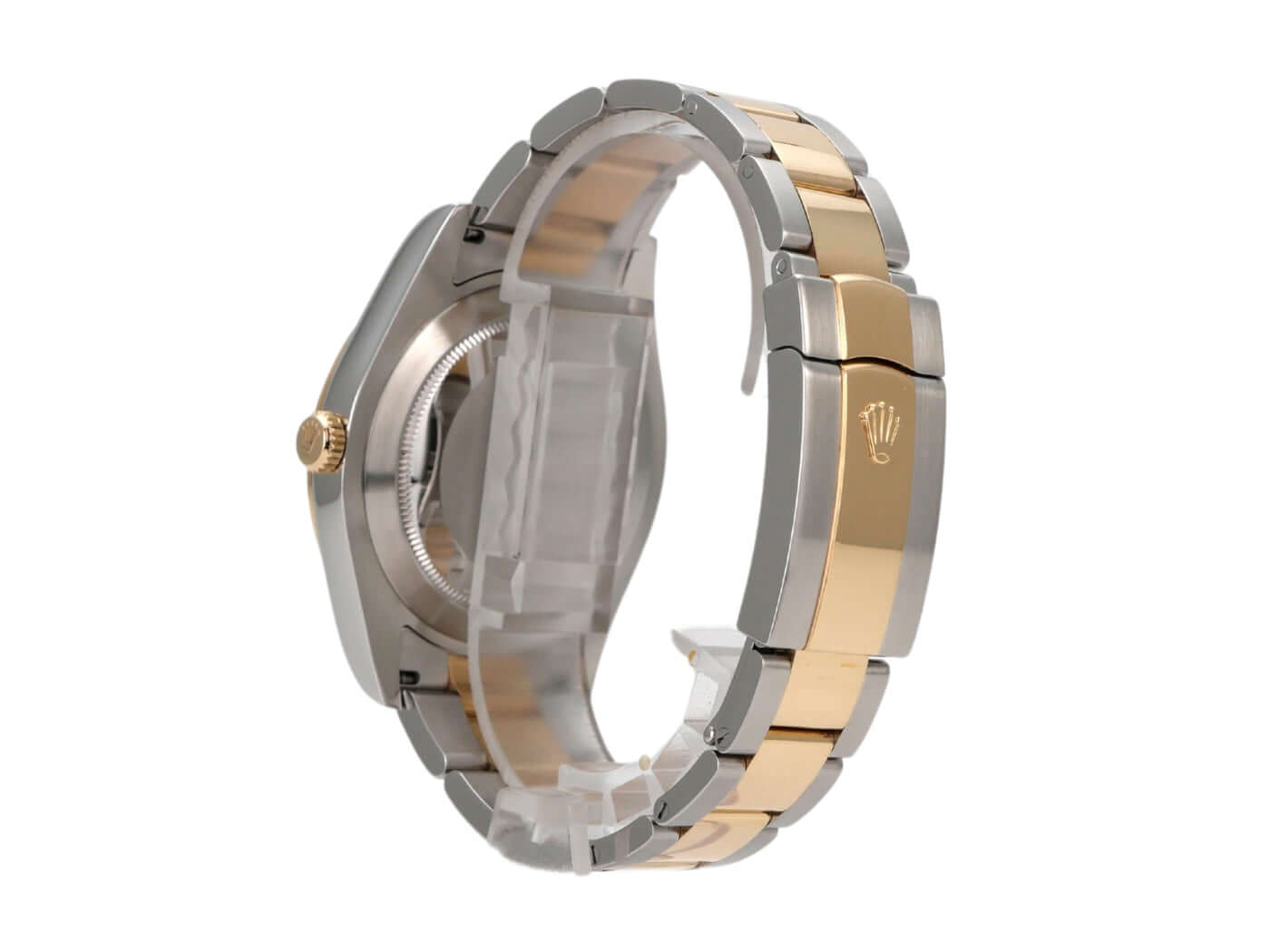 Gehäuse aus Edelstahl poliert und satiniert, Gehäusedurchmesser 41 mm, geriffelte 18 kt Gelbgold Lünette, Oyster Edelstahl / 18 kt Gelbgold Armband poliert und satiniert mit Faltschließe, graues Zifferblatt mit grün/goldenen römischen Ziffern, Leuchtzeiger, Automatikwerk, Rolex Manufakturkaliber 3136 mit 31 Steinen, Datumsanzeige, Chronometer, kratzfestes Saphirglas, verschraubte Krone, Edelstahlboden verschraubt, wasserdicht bis zu 10 bar.