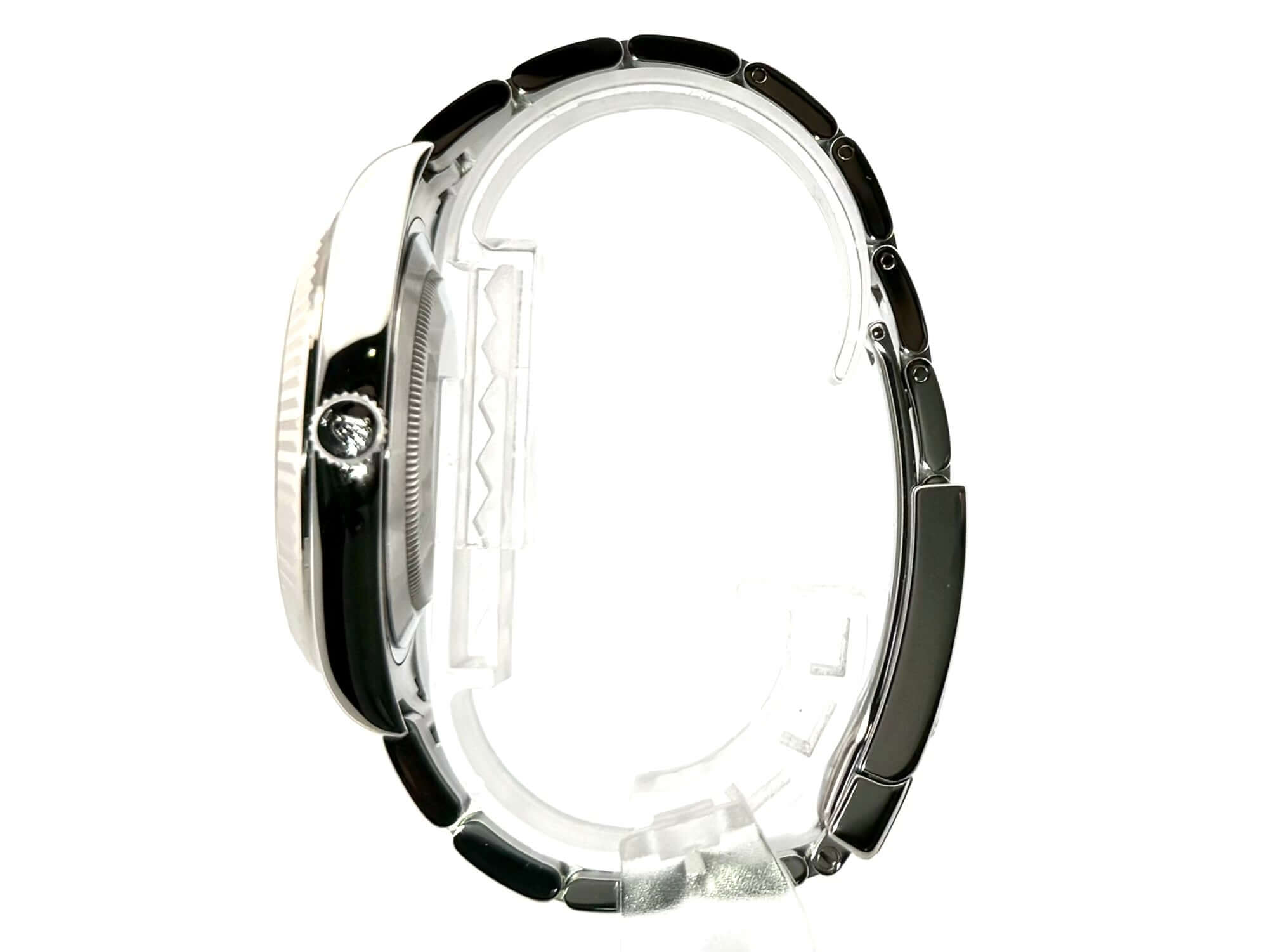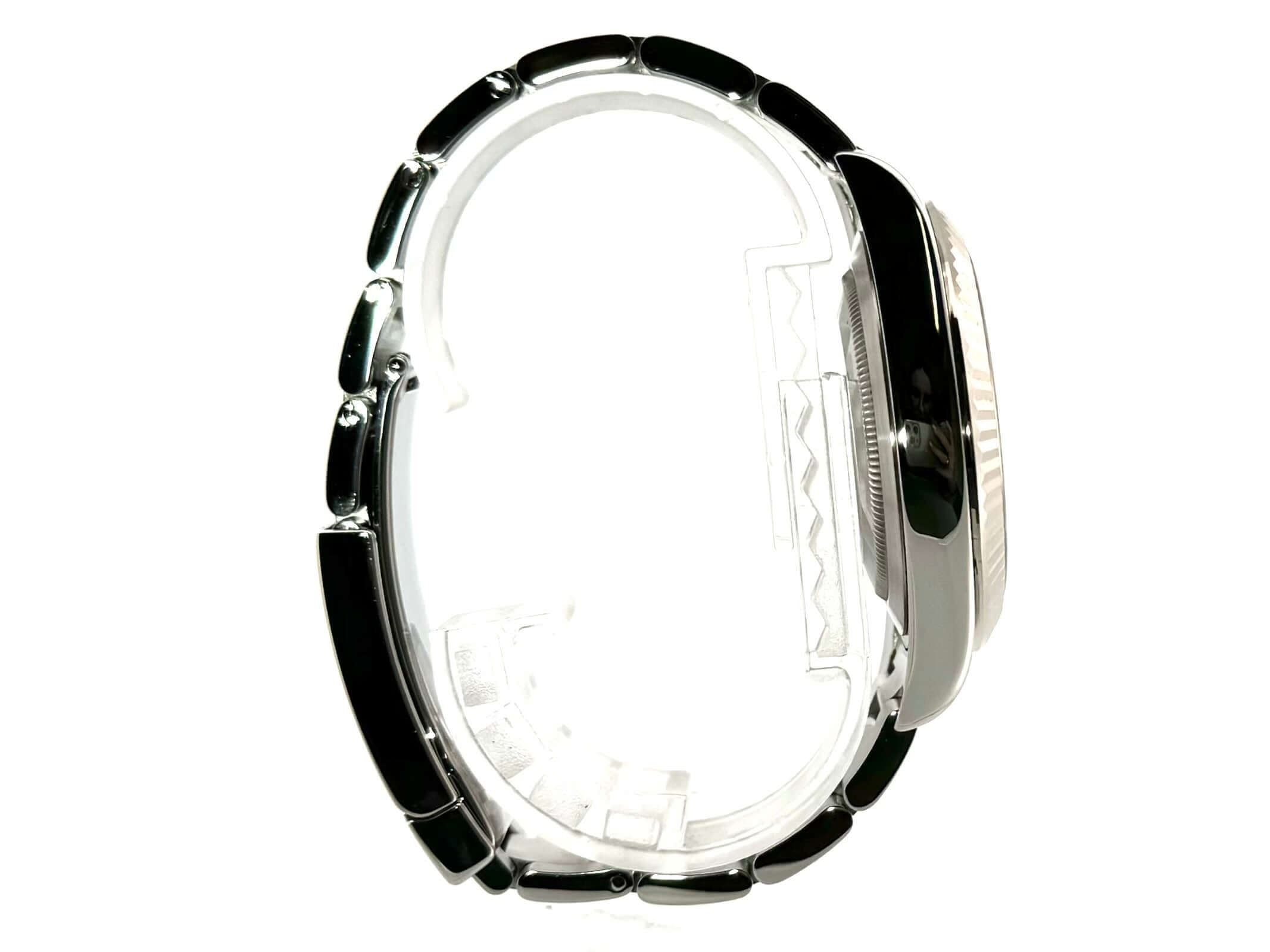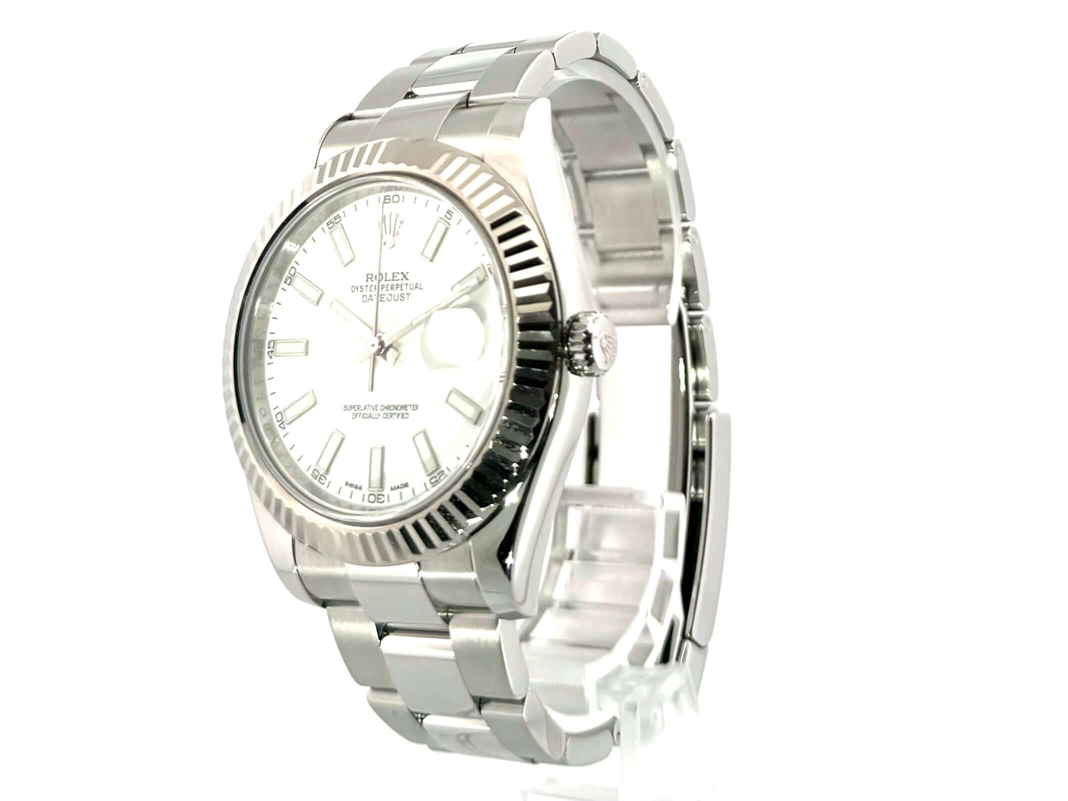 Gehäuse aus Edelstahl poliert und satiniert, Gehäusedurchmesser 41 mm, Gehäusehöhe 12 mm, 18 kt Weißgold Lünette geriffelt, Oyster Edelstahlband poliert und satiniert mit Faltschließe, weißes Zifferblatt mit aufgesetzten Leuchtindizes, Leuchtzeiger, Automatikwerk, Rolex Manufakturkaliber 3136 mit 31 Steine, Schwingung 28.800 A/h, Gangreserve für ca. 48 Stunden, Datumsanzeige mit Glaslupe bei 3 Uhr, Chronometer, kratzfestes Saphirglas, verschraubbare Krone, verschraubter Boden aus Edelstahl, Wasserdicht bis zu 10 bar.