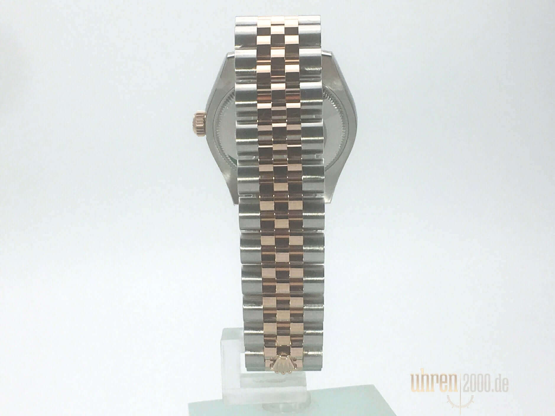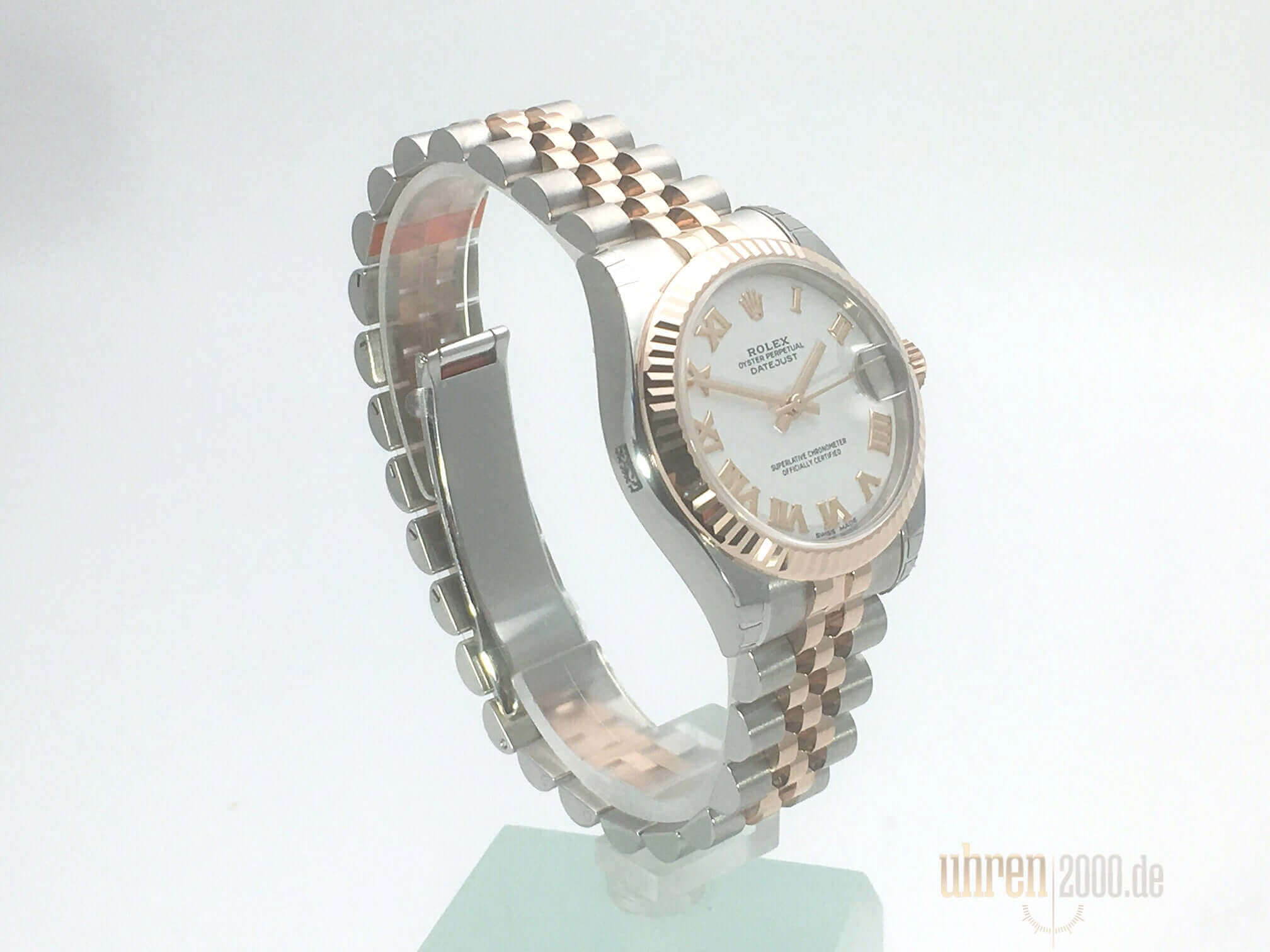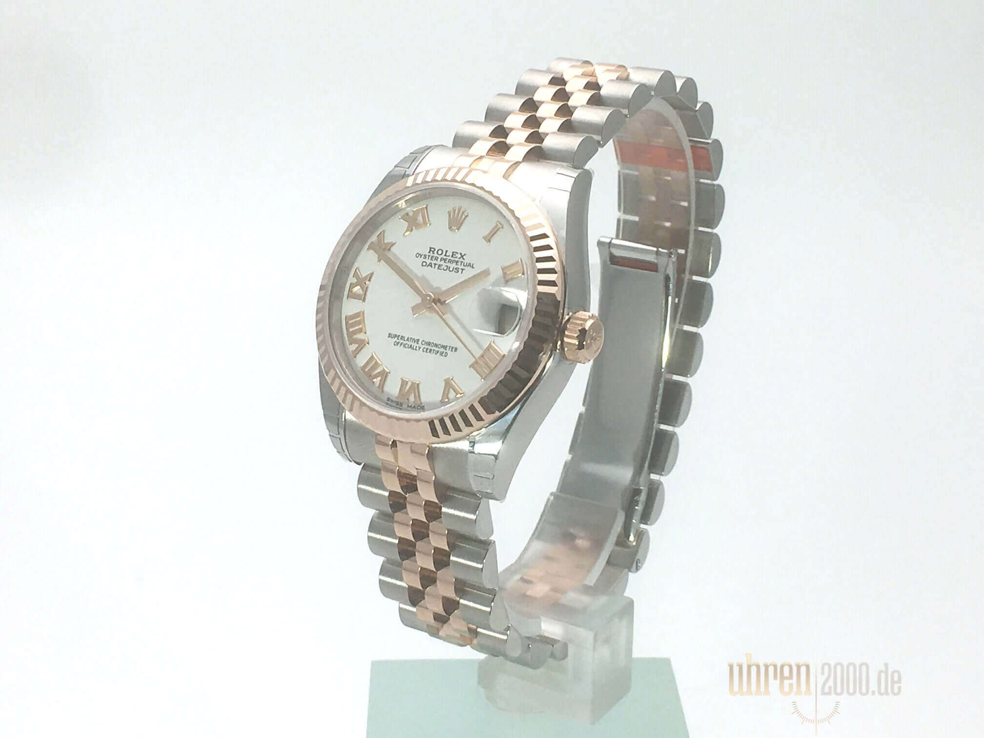 Gehäuse aus Edelstahl poliert und satiniert, Gehäusedurchmesser 31 mm, geriffelte Lünette aus 18 kt Roségold Everose, Jubilé Edelstahl / 18 kt Roségold Everose Armband poliert und satiniert mit Faltschließe, weißes Zifferblatt mit aufgesetzten roségoldenen römischen Ziffern, roségoldene Zeiger, Automatikwerk, Chronometer, Rolex Manufakturkaliber 2235 mit 31 Steine, 28.800 A/h, Datumsanzeige, kratzfestes Saphirglas, verschraubte Krone aus 18 kt Roségold Everose, Edelstahlboden verschraubt, Wasserdicht bis zu 10 bar.