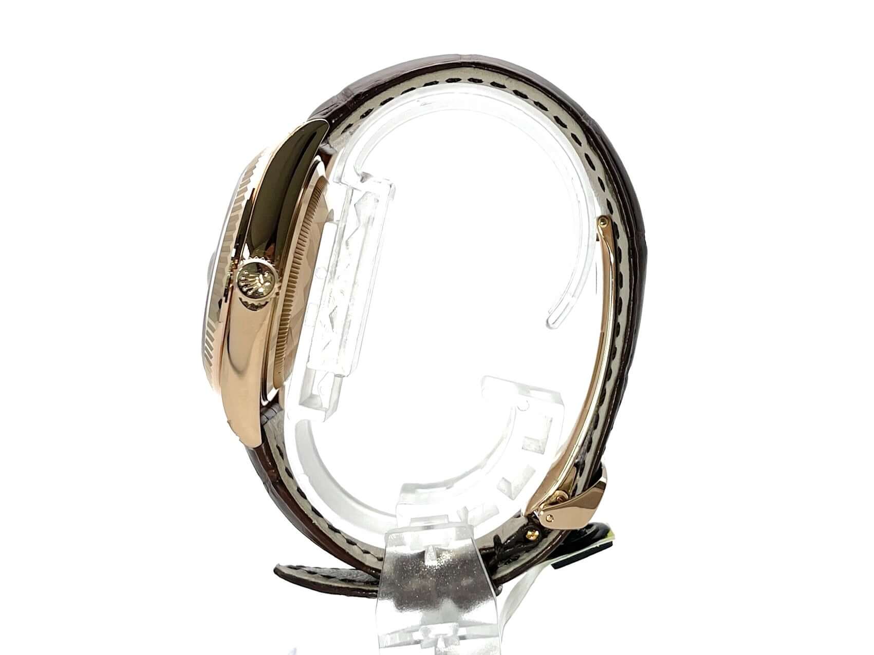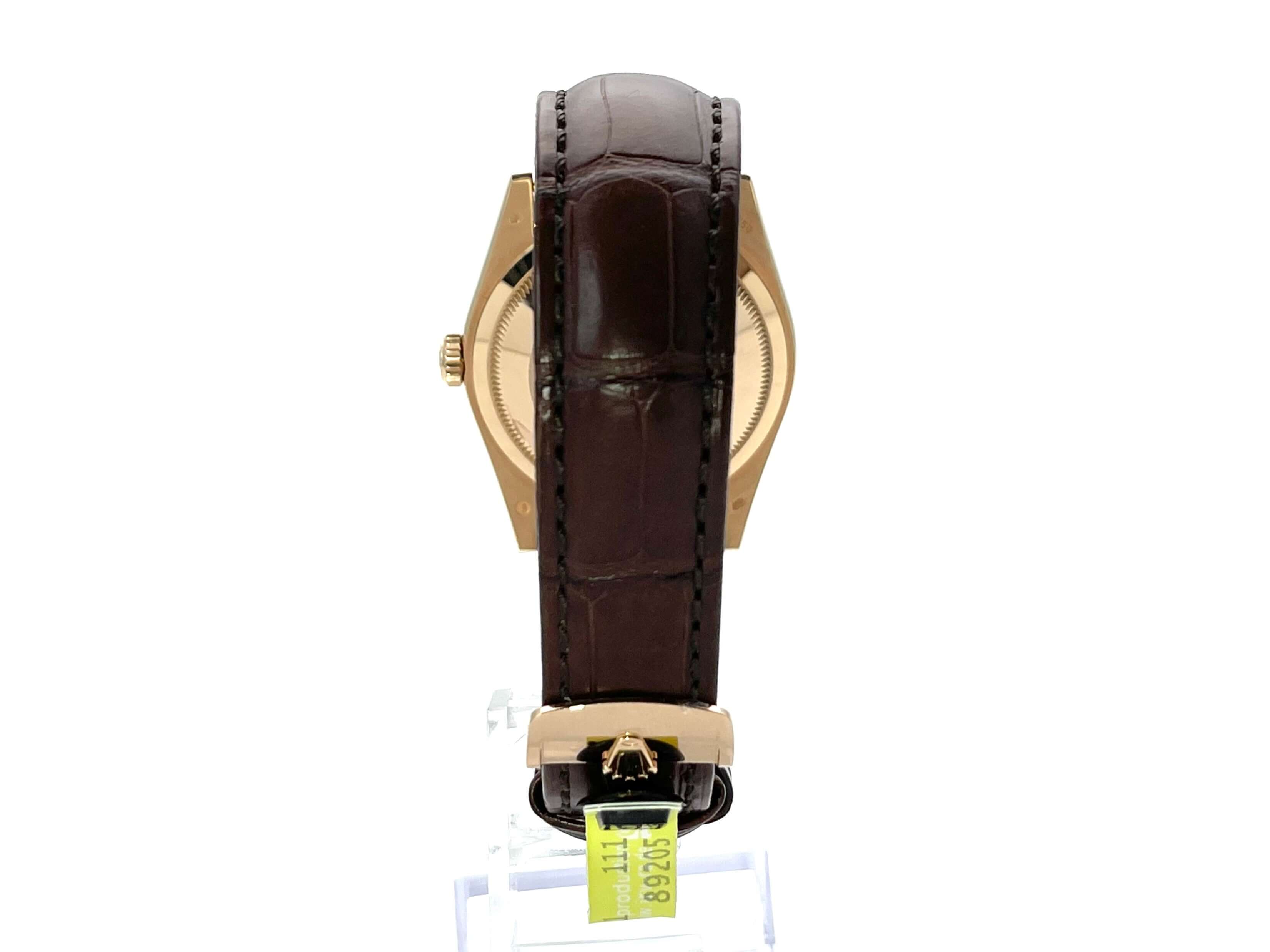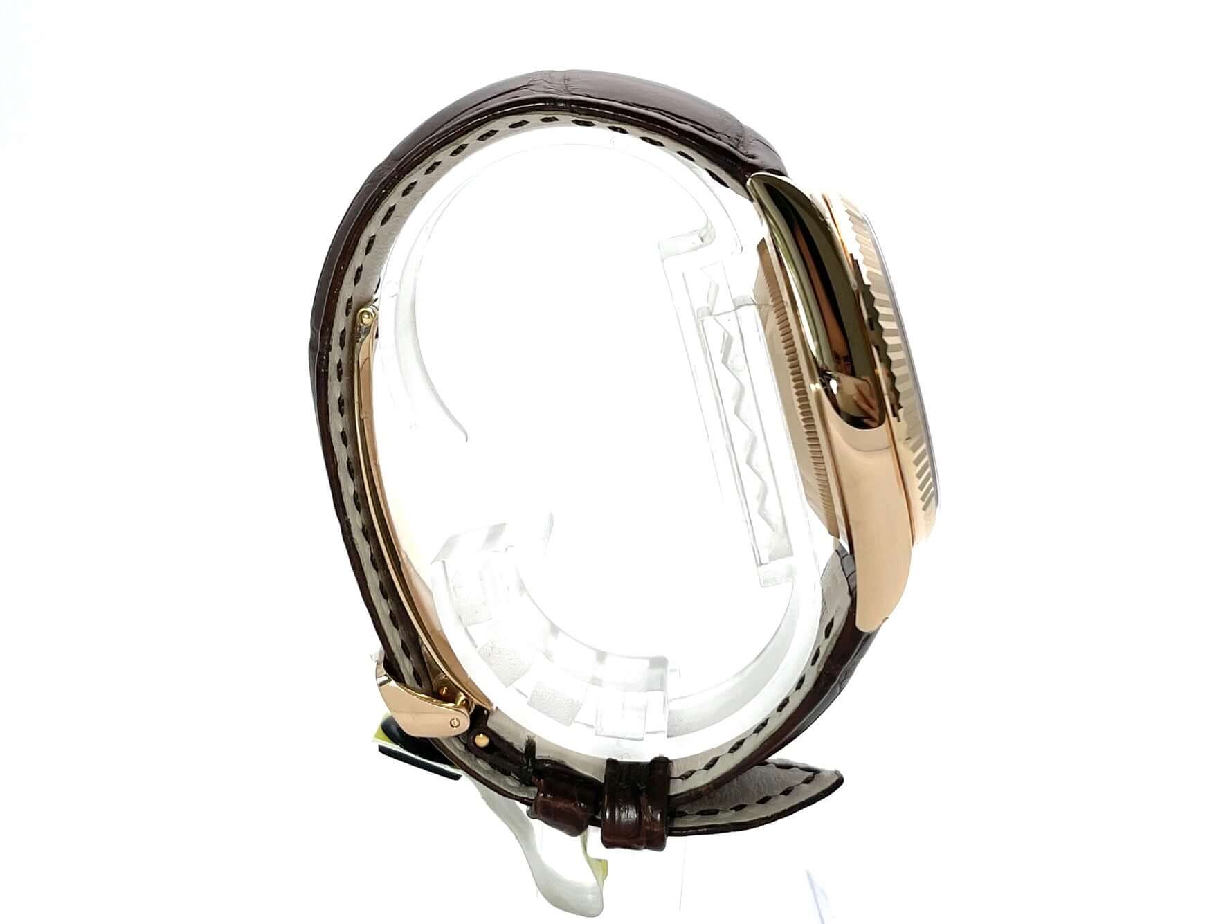 Gehäuse aus 18 kt Everose-Gold poliert und satiniert, Gehäusedurchmesser 36 mm, Lünette aus 18 kt Everose-Gold geriffelt, braunes Krokoleder Armband mit 18 kt Everose-Gold Faltschließe, Schokoladenfarbenes Diamantzifferblatt mit 2 Rubinen, Automatikwerk, Rolex Manufakturkaliber 3155 mit 31 Steine, Schwingung 28.800 A/h, Datumsanzeige mit Glaslupe bei 3 Uhr, Wochentagsanzeige bei 12 Uhr, Chronometer, kratzfestes Saphirglas, verschraubbare Krone, verschraubter Boden aus 18 kt Everose-Gold, Wasserdicht bis zu 10 bar.
