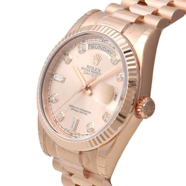 Gehäuse aus 18 kt Everose-Gold poliert und satiniert, Gehäusedurchmesser 36 mm, Lünette aus 18 kt Everose-Gold geriffelt, Präsident Armband aus 18 kt Everose-Gold poliert und satiniert mit Faltschließe, pinkfarbenes Diamantzifferblatt, Automatikwerk, Chronometer mit C.O.S.C. Zertifizierung, Rolex Manufakturkaliber 3155 mit 31 Steine, Schwingung 28.800 A/h, Anzeige von Stunden, Minuten und Sekunden aus der Mitte, Datumsanzeige mit Glaslupe bei 3 Uhr, Wochentagsanzeige bei 12 Uhr, kratzfestes Saphirglas, verschraubbare Krone, verschraubter Boden aus 18 kt Everose-Gold, Wasserdicht bis zu 10 bar.