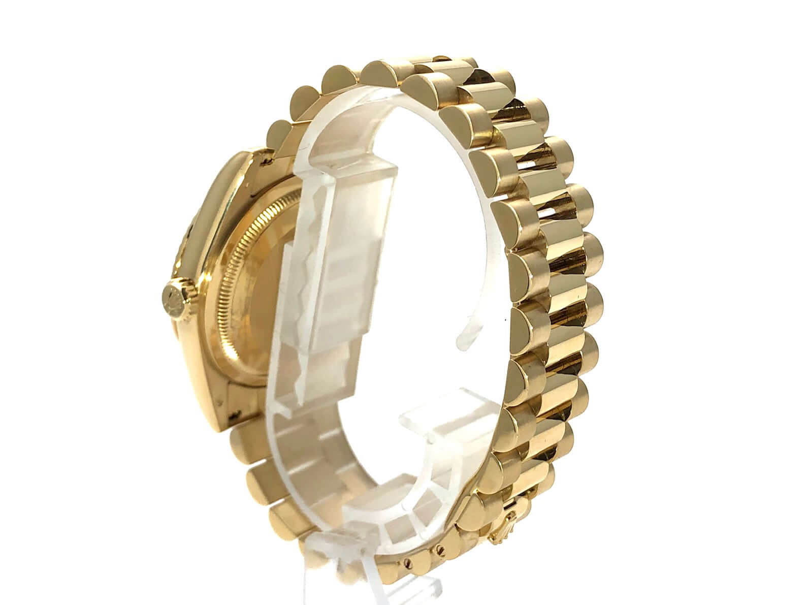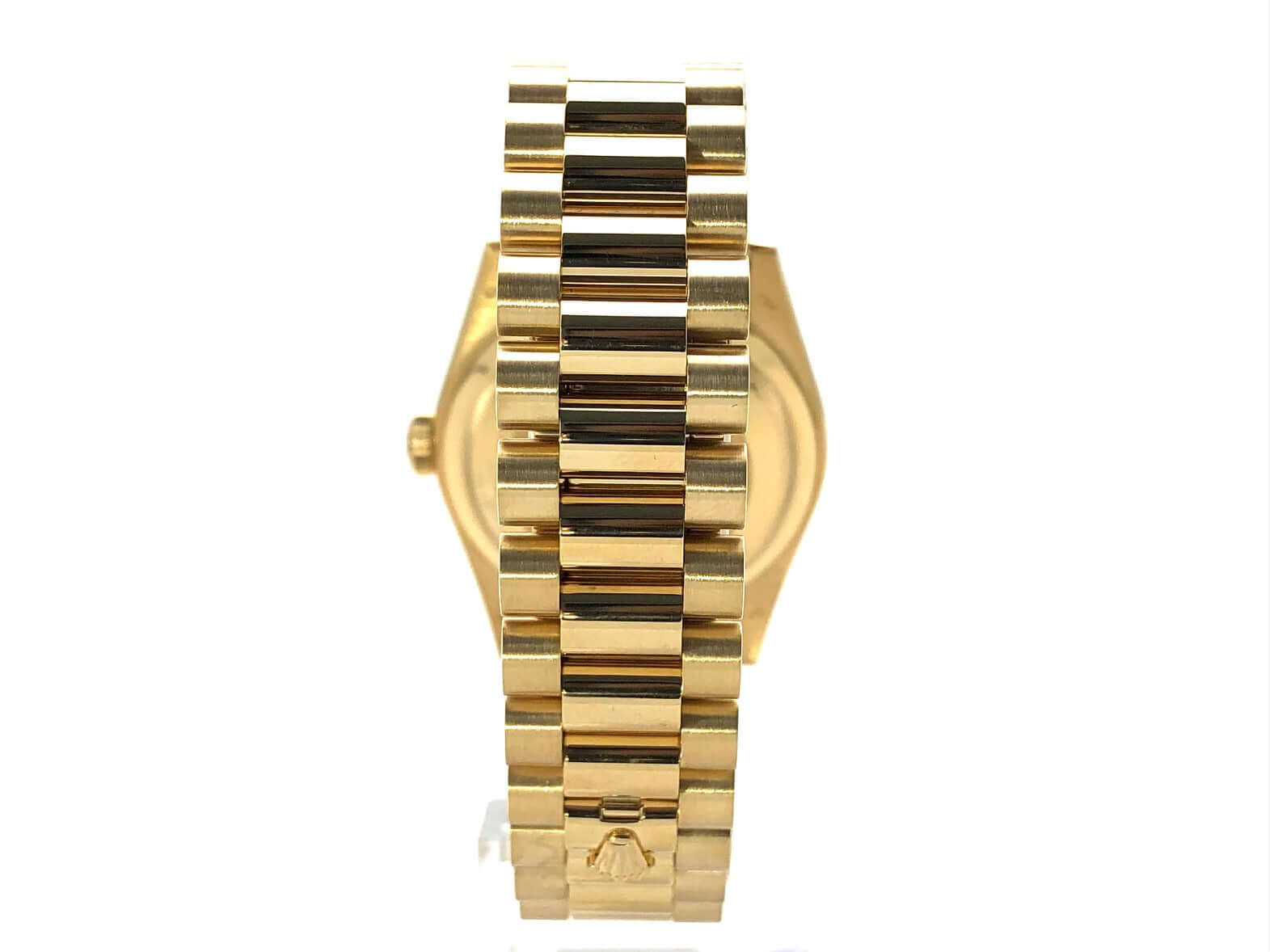 Gehäuse aus 18 kt Gelbgold poliert und satiniert, Gehäusedurchmesser 36 mm, Lünette aus 18 kt Gelbgold geriffelt, Präsident Armband aus 18 kt Gelbgold poliert und satiniert mit Faltschließe, grünes Zifferblatt mit Leuchtindizes, Automatikwerk, Rolex Manufakturkaliber 3155 mit 31 Steine, Schwingung 28.800 A/h, Datumsanzeige mit Glaslupe bei 3 Uhr, Wochentagsanzeige bei 12 Uhr, Chronometer, kratzfestes Saphirglas, verschraubbare Krone, verschraubter Boden aus 18 kt Gelbgold, Wasserdicht bis zu 10 bar.