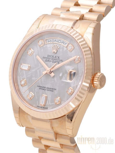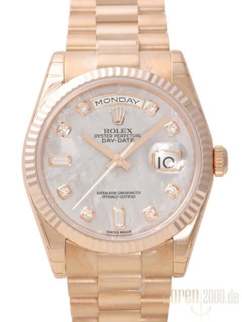 Gehäuse aus 18 kt Everose-Gold poliert und satiniert, Gehäusedurchmesser 36 mm, Lünette aus 18 kt Everose-Gold geriffelt, Präsident Armband aus 18 kt Everose-Gold poliert und satiniert mit Faltschließe, Meteorit Diamantzifferblatt, Automatikwerk, Rolex Manufakturkaliber 3155 mit 31 Steine, Schwingung 28.800 A/h, Chronometer, Datumsanzeige mit Glaslupe bei 3 Uhr, Wochentagsanzeige bei 12 Uhr, kratzfestes Saphirglas, verschraubte Krone, verschraubter Boden aus 18 kt Everose-Gold, Wasserdicht bis zu 10 bar.
