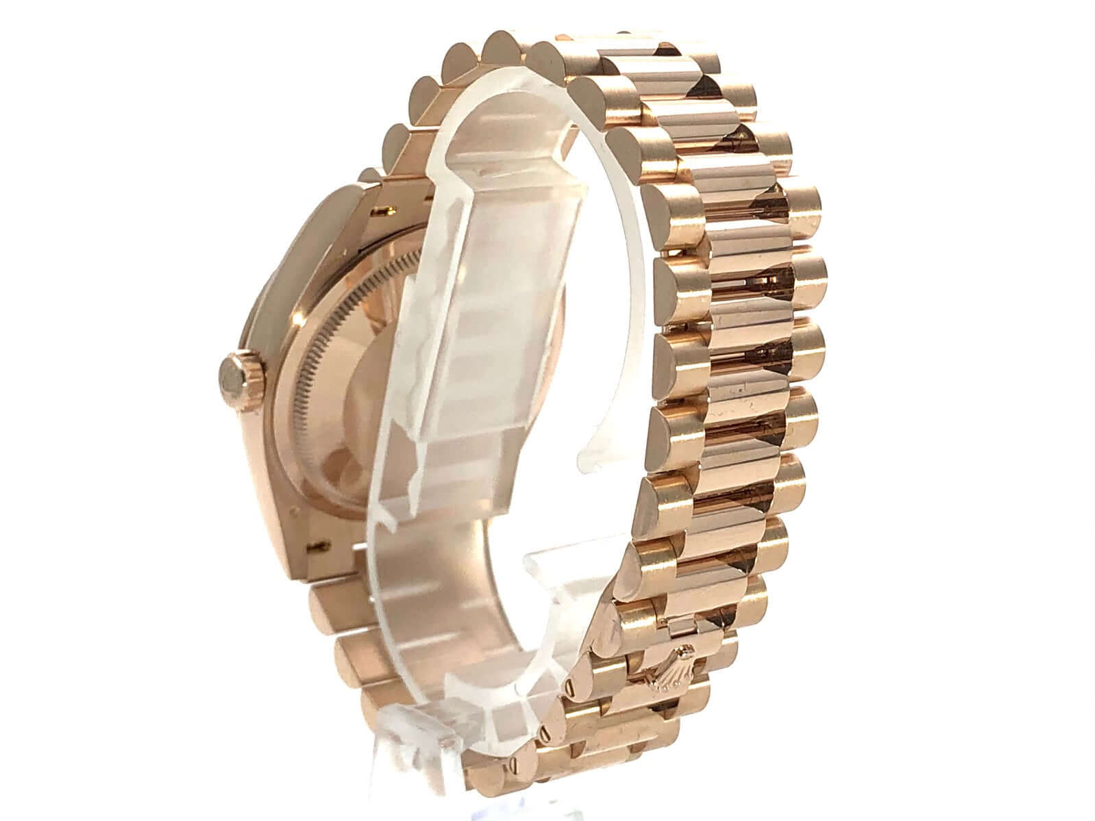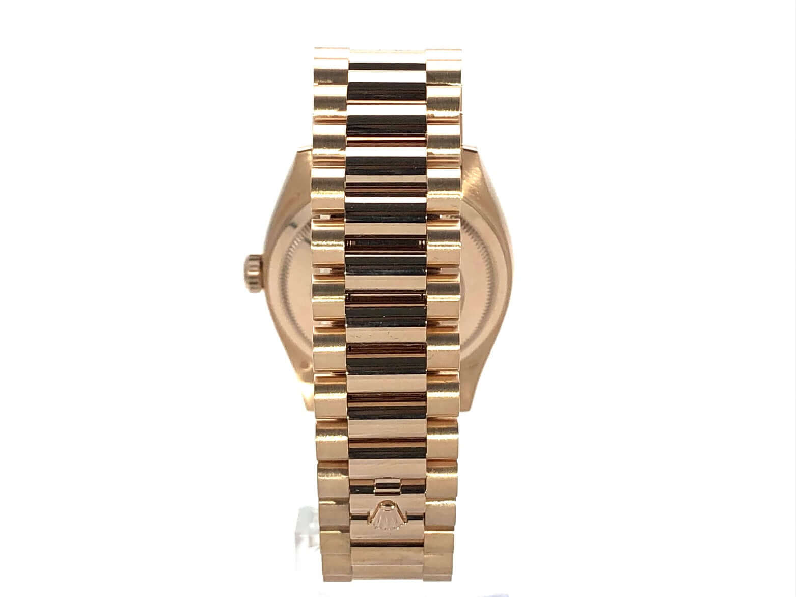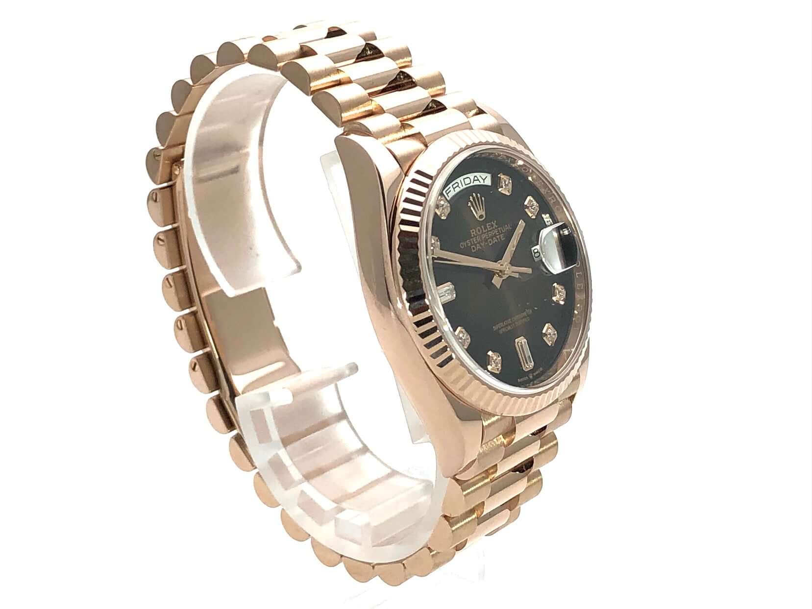 Gehäuse aus 18 kt Everose-Gold poliert und satiniert, Gehäusedurchmesser 36 mm, Lünette aus 18 kt Everose-Gold geriffelt, Präsident Armband aus 18 kt Everose-Gold poliert und satiniert mit Faltschließe, braunes Diamantzifferblatt, Automatikwerk, Rolex Manufakturkaliber 3255 mit 31 Steine, Schwingung 28.800 A/h, 70 Stunden Gangreserve, Datumsanzeige mit Glaslupe bei 3 Uhr, Wochentagsanzeige bei 12 Uhr, Chronometer, kratzfestes Saphirglas, verschraubbare Krone, verschraubter Boden aus 18 kt Everose-Gold, wasserdicht bis zu 10 bar.