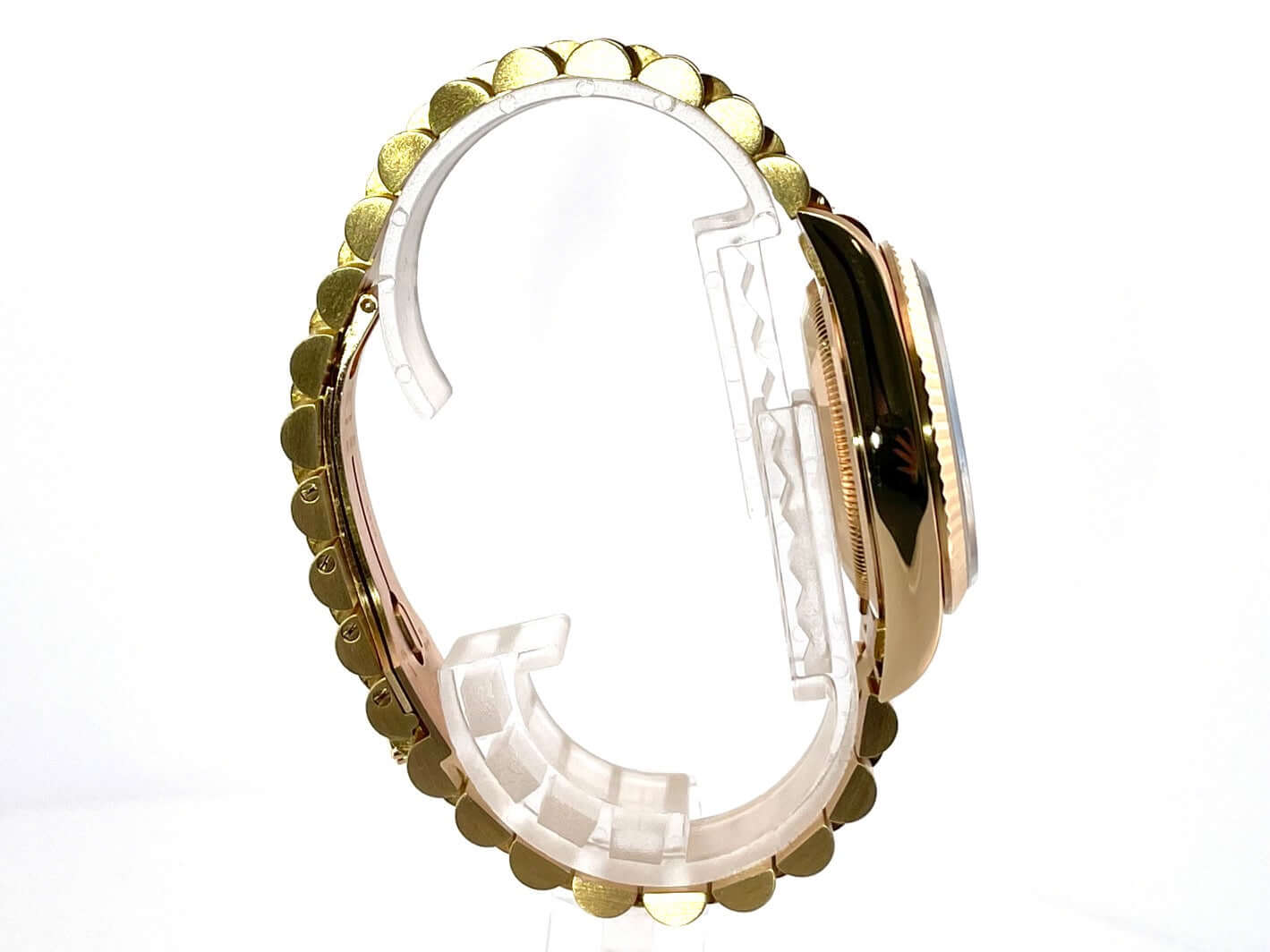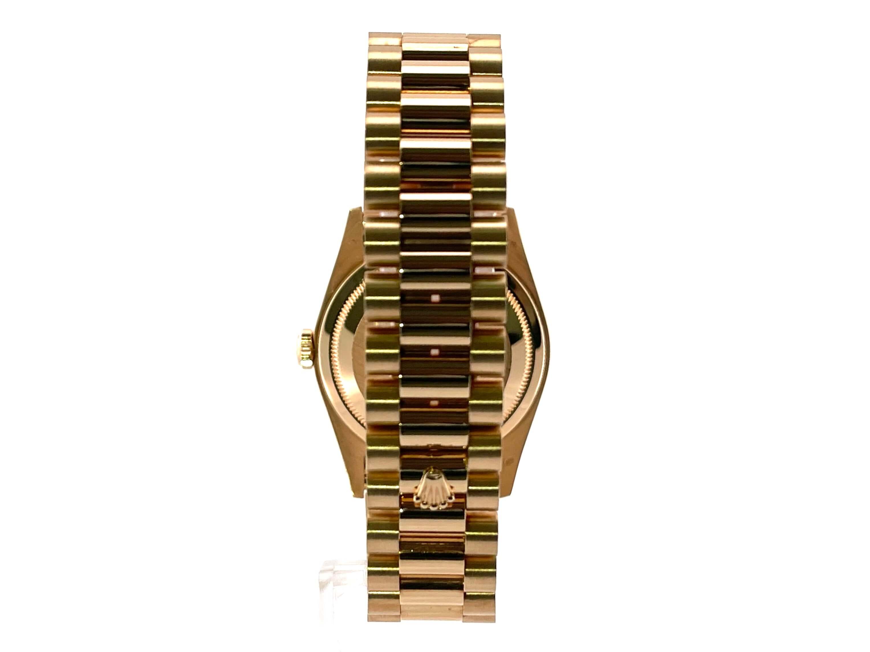 Gehäuse aus 18 kt Gelbgold poliert und satiniert, Gehäusedurchmesser 36 mm, Lünette aus 18 kt Gelbgold geriffelt, Präsident Armband aus 18 kt Gelbgold poliert und satiniert mit Faltschließe, champagnerfarbenes Zifferblatt, Automatikwerk, Rolex Manufakturkaliber 3155 mit 31 Steine, Schwingung 28.800 A/h, Datumsanzeige mit Glaslupe bei 3 Uhr, Wochentagsanzeige bei 12 Uhr, Chronometer, kratzfestes Saphirglas, verschraubbare Krone, verschraubter Boden aus 18 kt Gelbgold, Wasserdicht bis zu 10 bar.