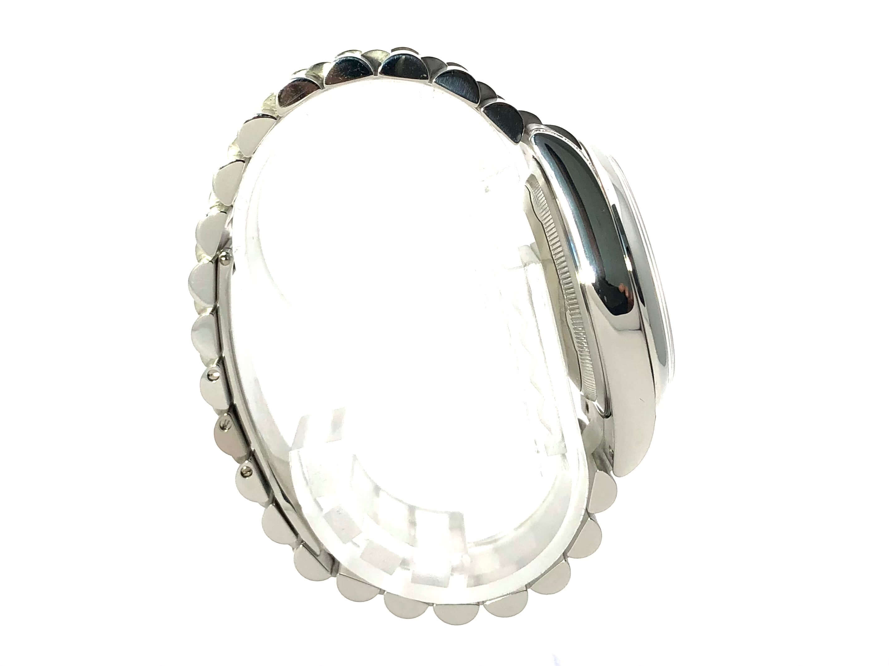 Gehäuse aus Platin poliert und satiniert, Gehäusedurchmesser 36 mm, Lünette aus Platin poliert, Hörner mit Diamanten besetzt, Präsident Armband aus Platin poliert und satiniert mit Faltschließe, Diamantzifferblatt Eisblau, Automatikwerk, Rolex Manufakturkaliber 3155 mit 31 Steine, Schwingung 28.800 A/h, Datumsanzeige mit Glaslupe bei 3 Uhr, Wochentagsanzeige bei 12 Uhr, Chronometer, kratzfestes Saphirglas, verschraubbare Krone, verschraubter Boden aus Platin, Wasserdicht bis zu 10 bar.