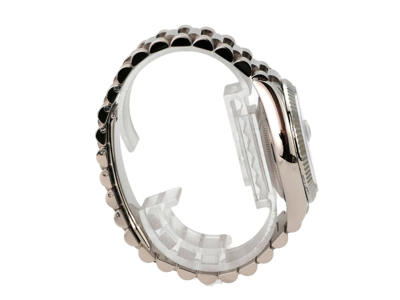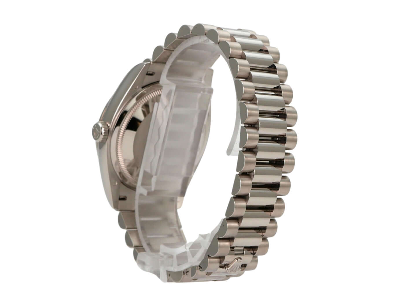 Gehäuse aus 18 kt Gelbgold poliert und satiniert, Gehäusedurchmesser 36 mm, Lünette aus 18 kt Weißgold geriffelt, Präsident Armband aus 18 kt Weißgold poliert und satiniert mit Faltschließe, weißes Zifferblatt mit römischen Ziffern, Leuchtzeiger, Automatikwerk, Rolex Manufakturkaliber 3255 mit 31 Steine, Schwingung 28.800 A/h, 70 Stunden Gangreserve, Datumsanzeige mit Glaslupe bei 3 Uhr, Wochentagsanzeige bei 12 Uhr, Chronometer, kratzfestes Saphirglas, verschraubbare Krone, verschraubter Boden aus 18 kt Weißgold, wasserdicht bis zu 10 bar.