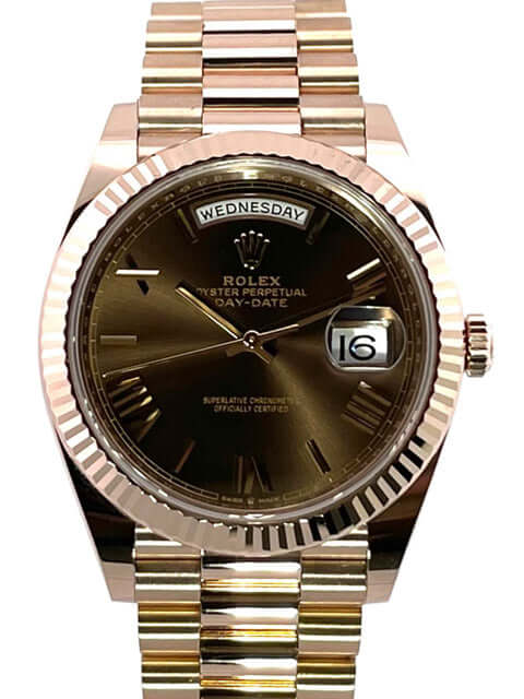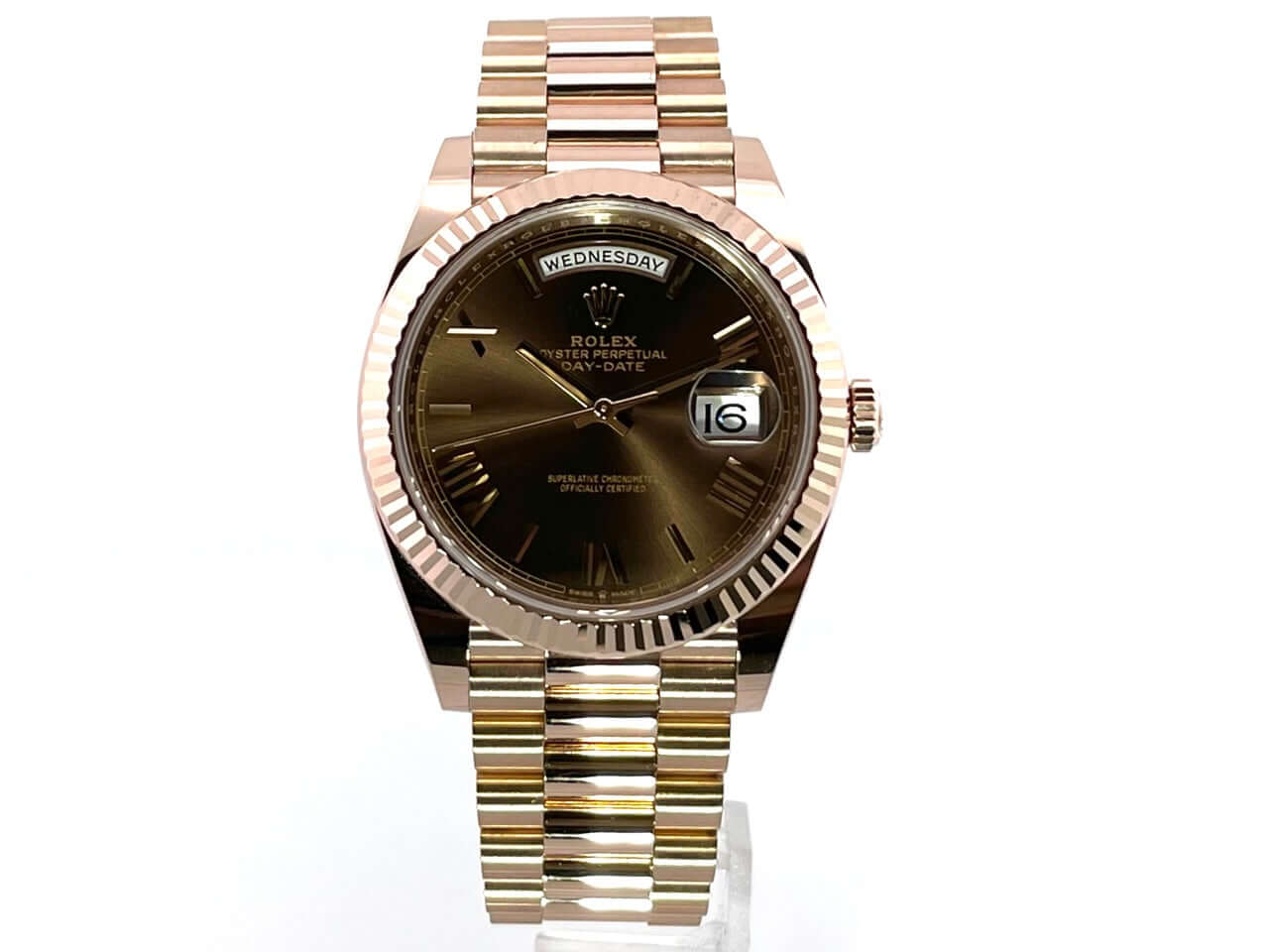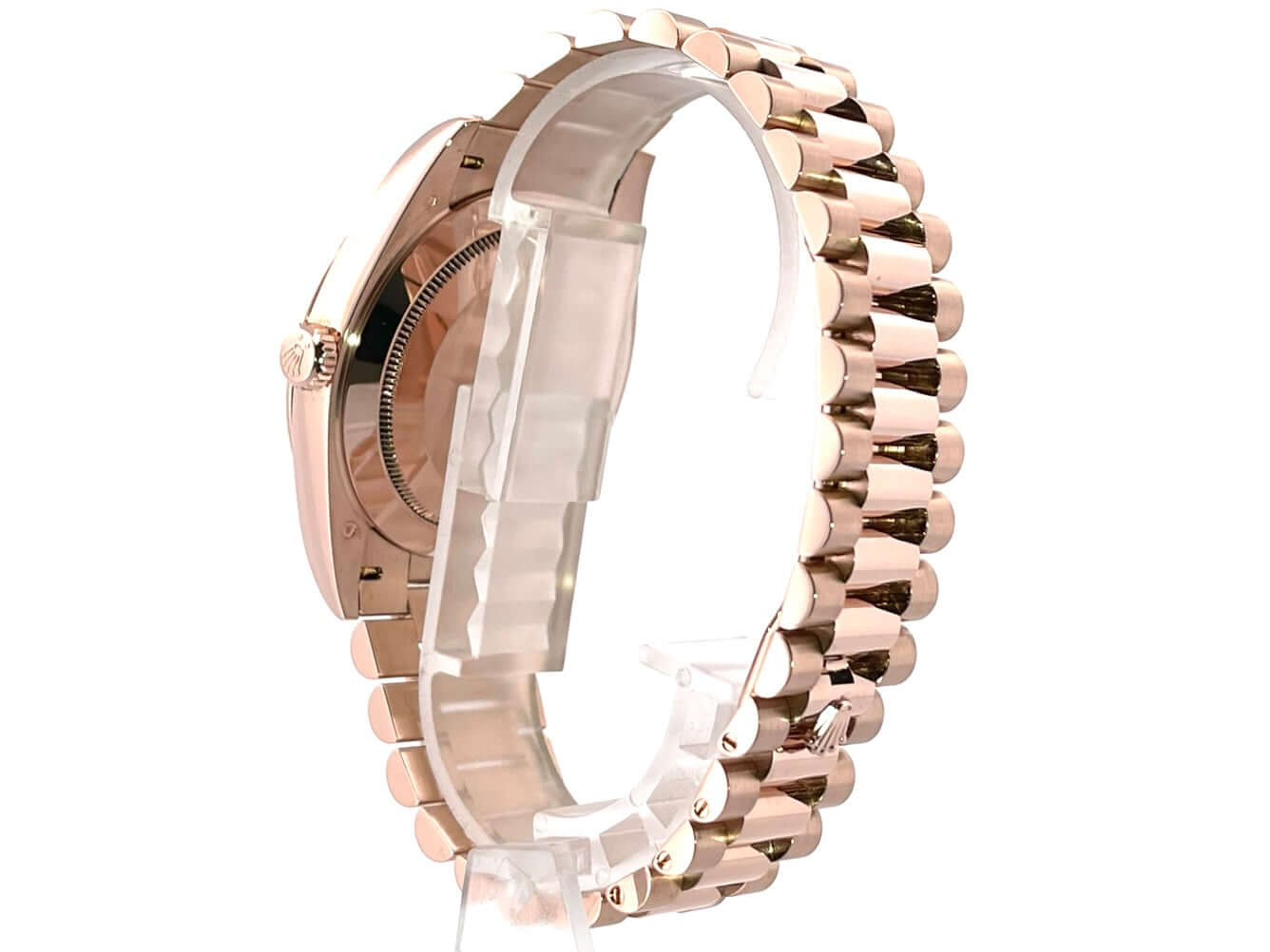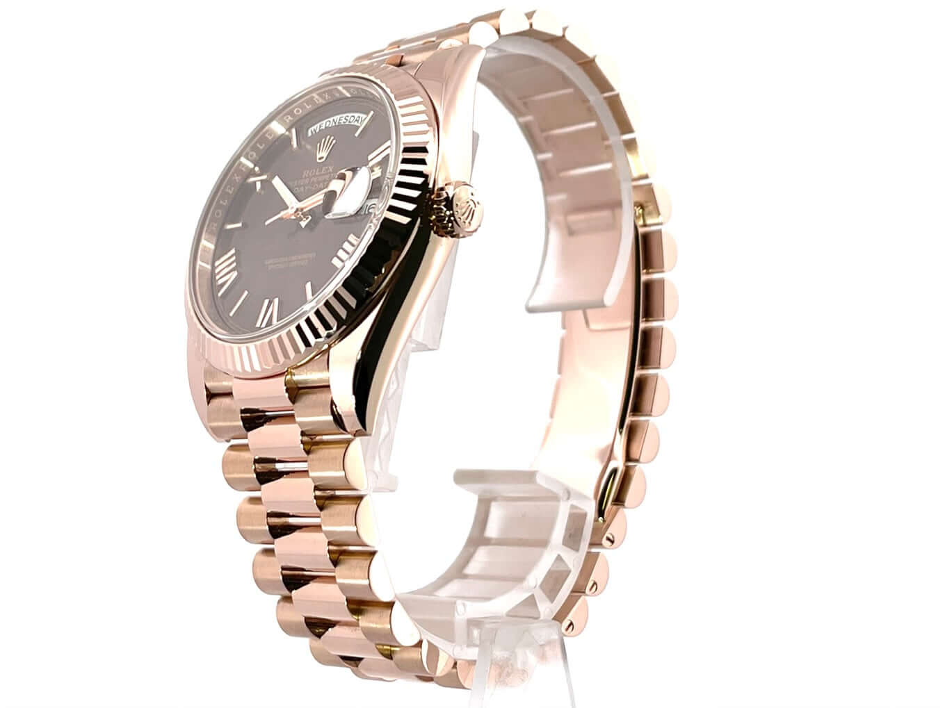 Gehäuse aus 18 kt Everose-Gold poliert, Gehäusedurchmesser 40 mm, Lünette aus 18 kt Everose-Gold geriffelt, Präsident Armband aus 18 kt Everose-Gold poliert und satiniert mit Faltschließe, schokofarbenes Zifferblatt mit römischen Ziffern, Automatikwerk, Chronometer, Rolex Manufakturkaliber 3255, Datum mit Glaslupe bei 3 Uhr, kratzfestes Saphirglas, verschraubter Boden aus 18 kt Everose-Gold, Wasserdicht bis zu 10 bar.