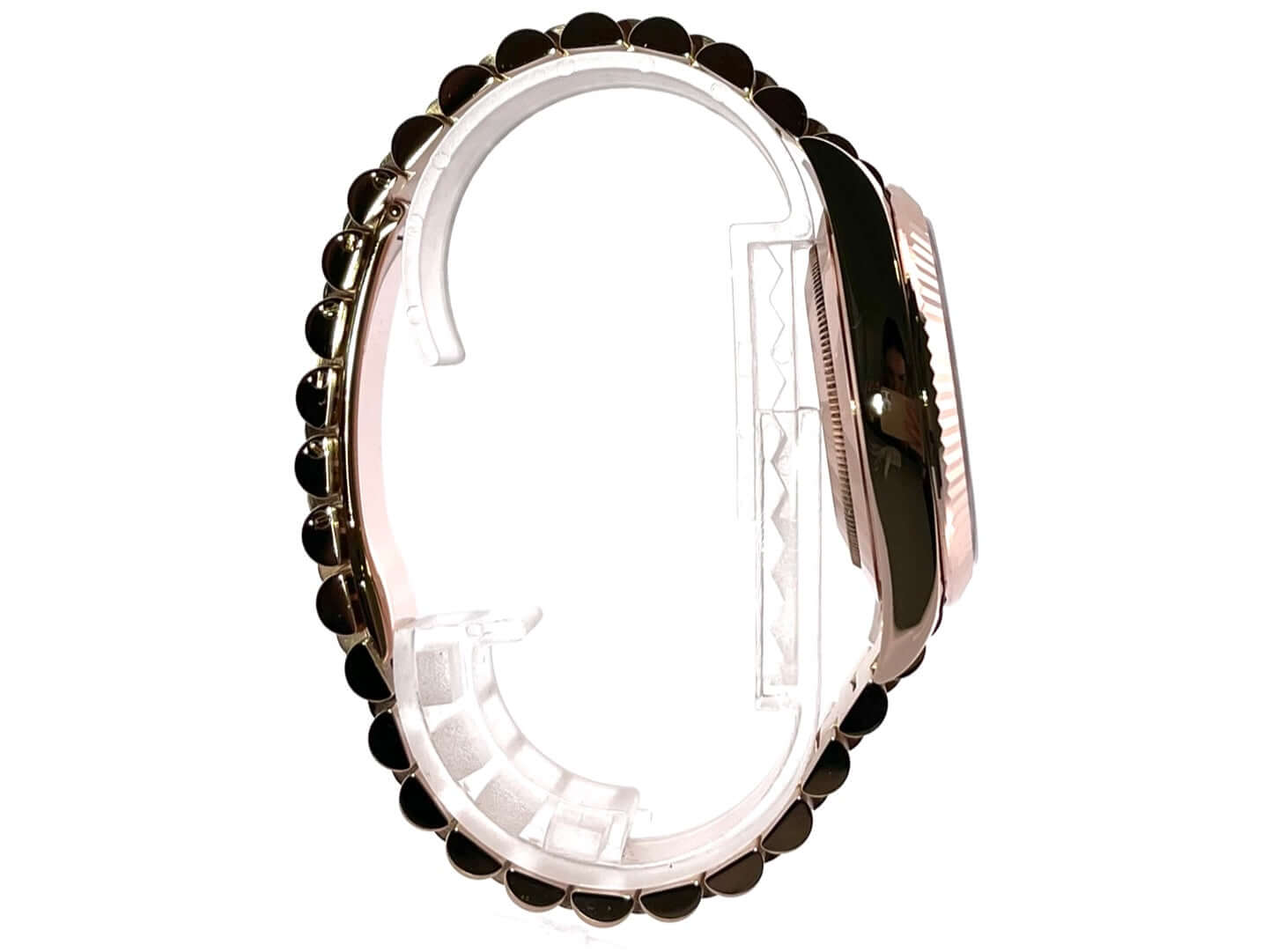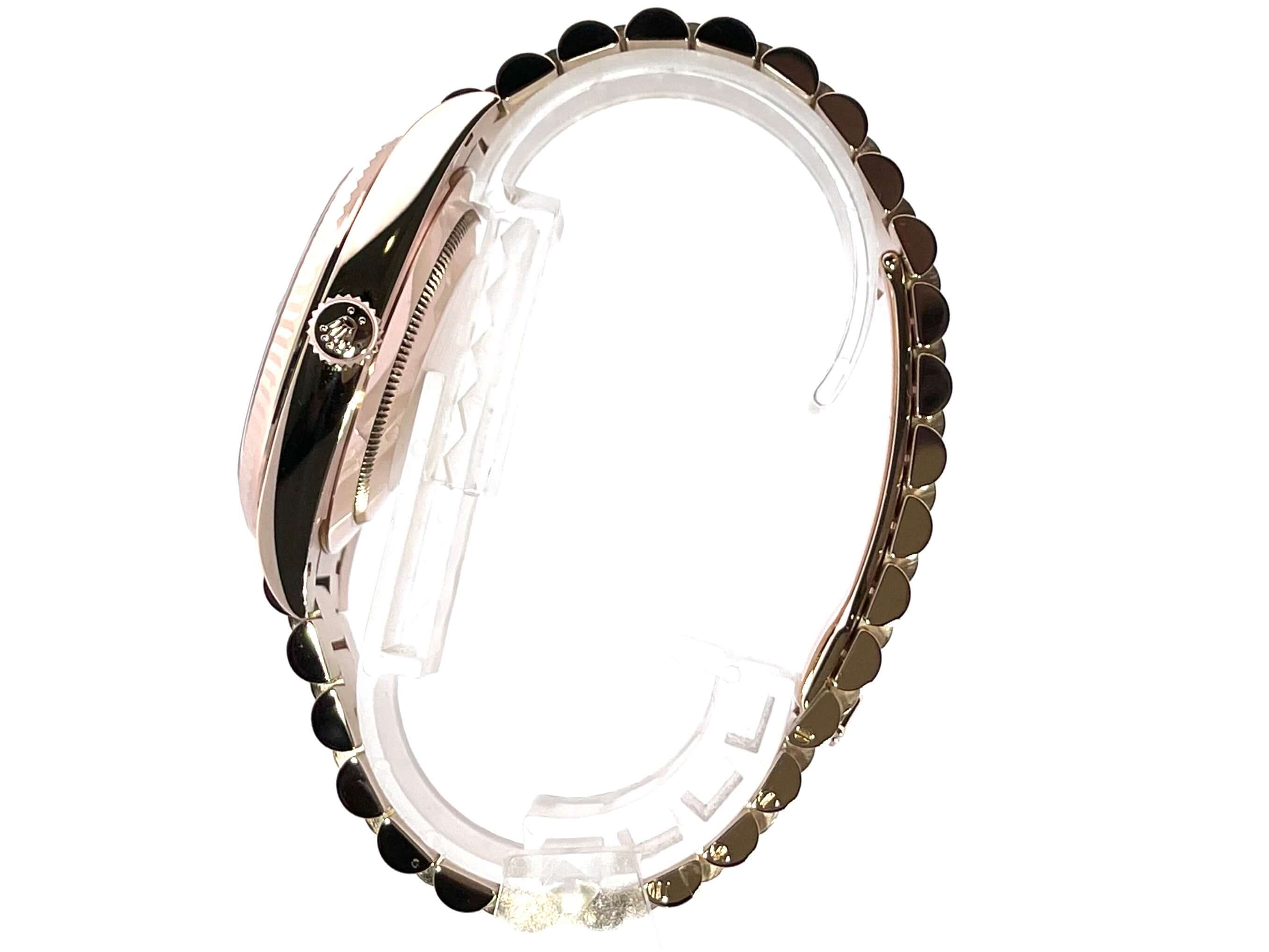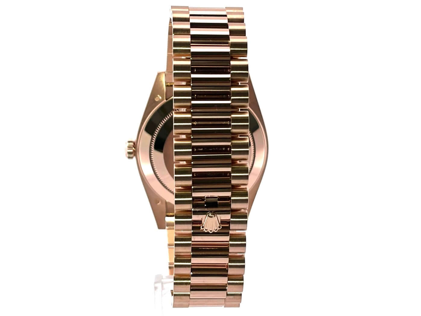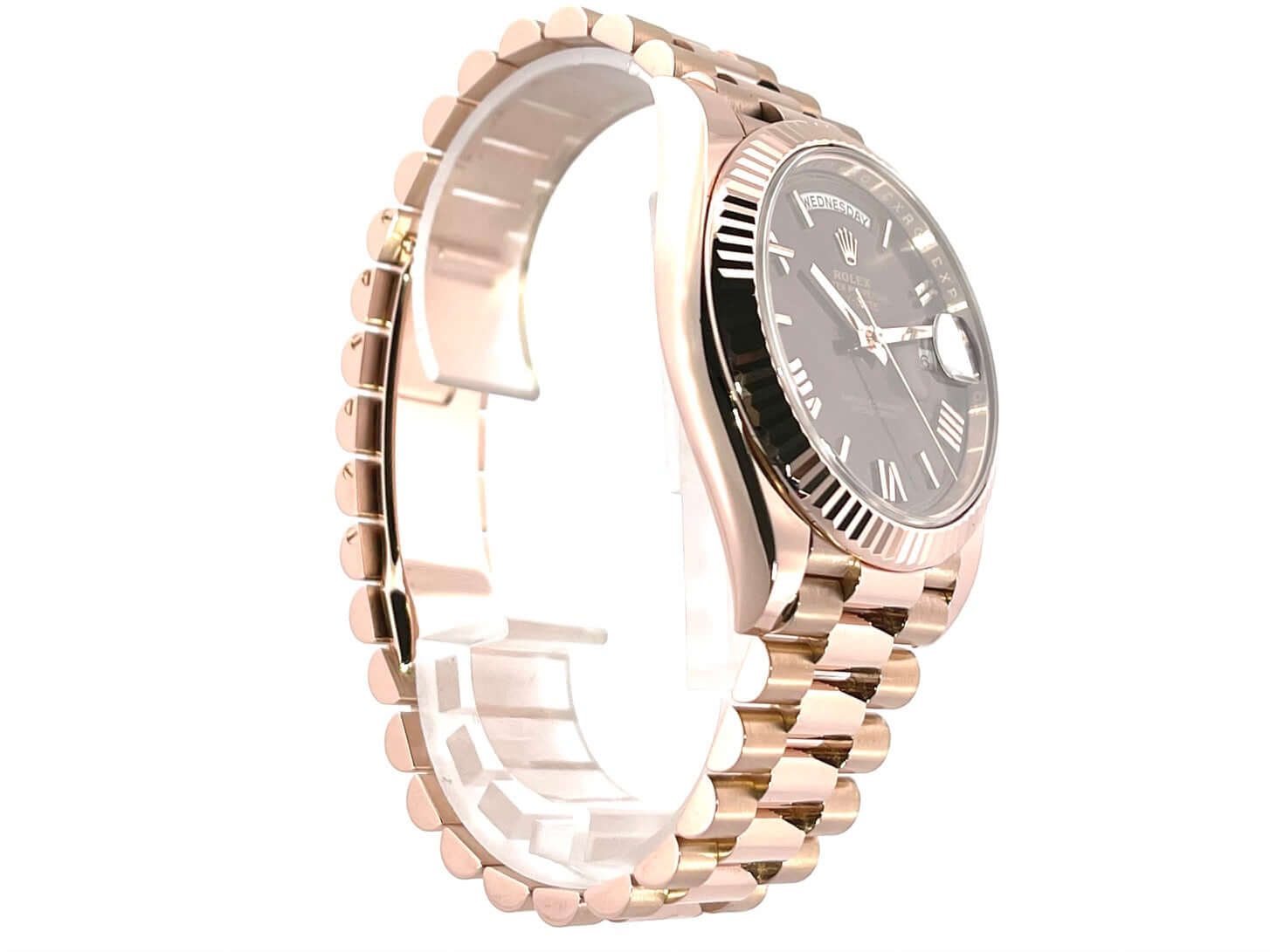 Gehäuse aus 18 kt Everose-Gold poliert, Gehäusedurchmesser 40 mm, Lünette aus 18 kt Everose-Gold geriffelt, Präsident Armband aus 18 kt Everose-Gold poliert und satiniert mit Faltschließe, schokofarbenes Zifferblatt mit römischen Ziffern, Automatikwerk, Chronometer, Rolex Manufakturkaliber 3255, Datum mit Glaslupe bei 3 Uhr, kratzfestes Saphirglas, verschraubter Boden aus 18 kt Everose-Gold, Wasserdicht bis zu 10 bar.