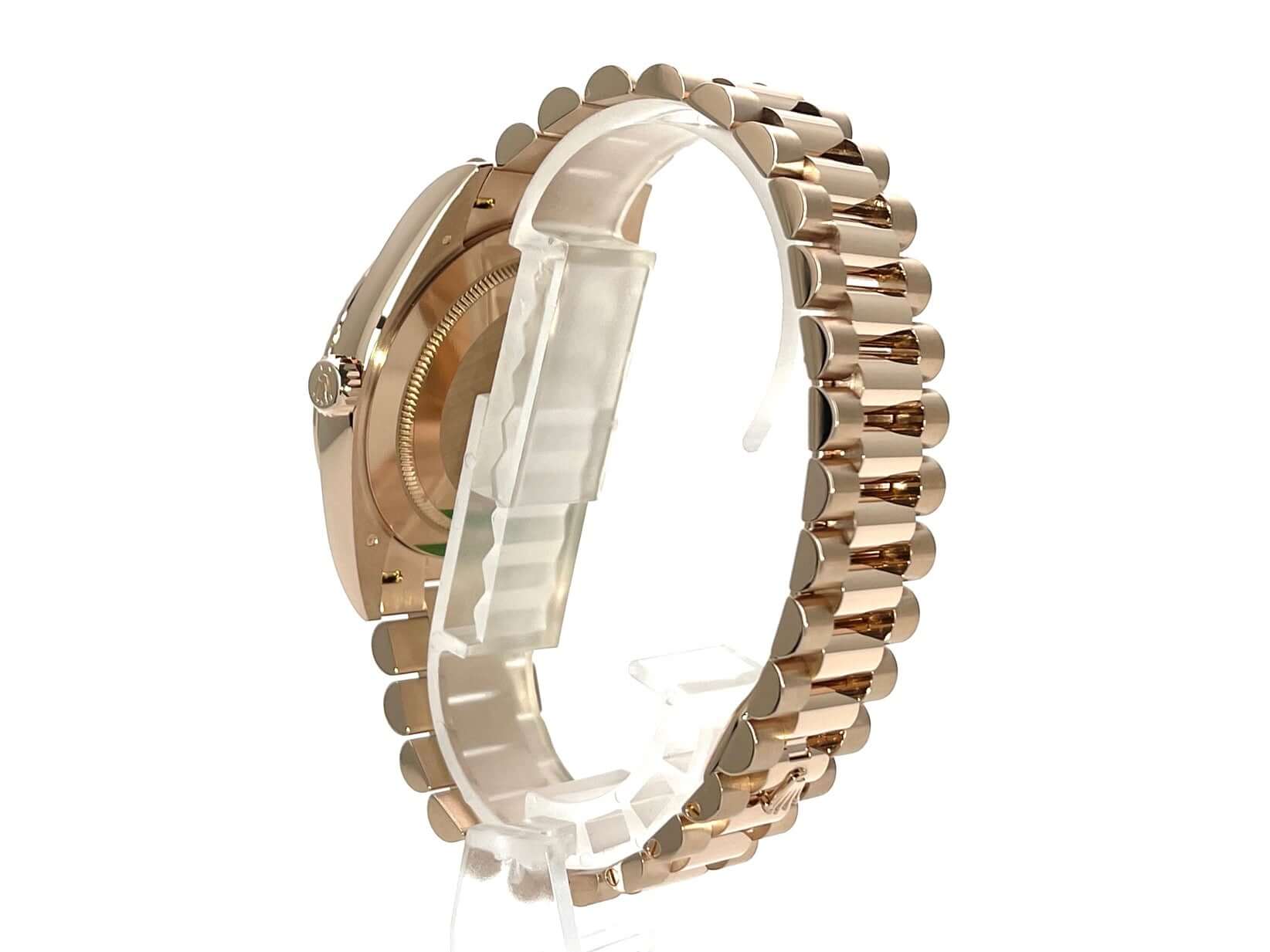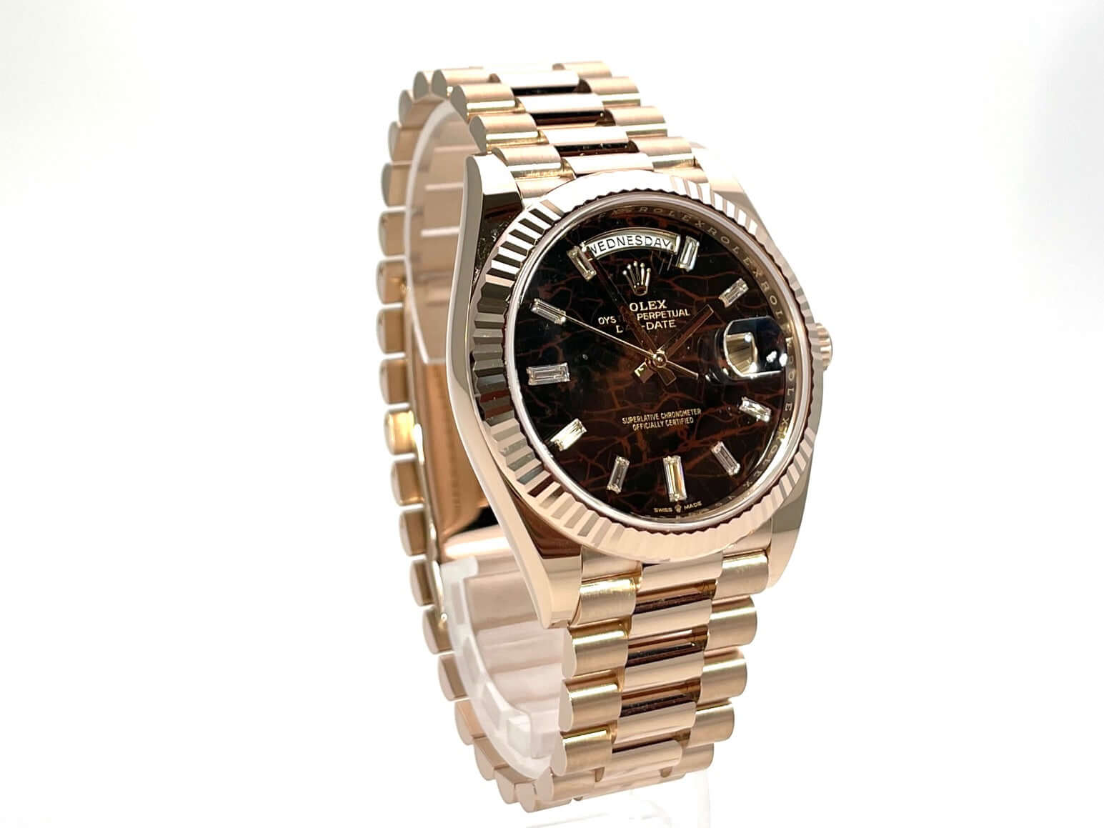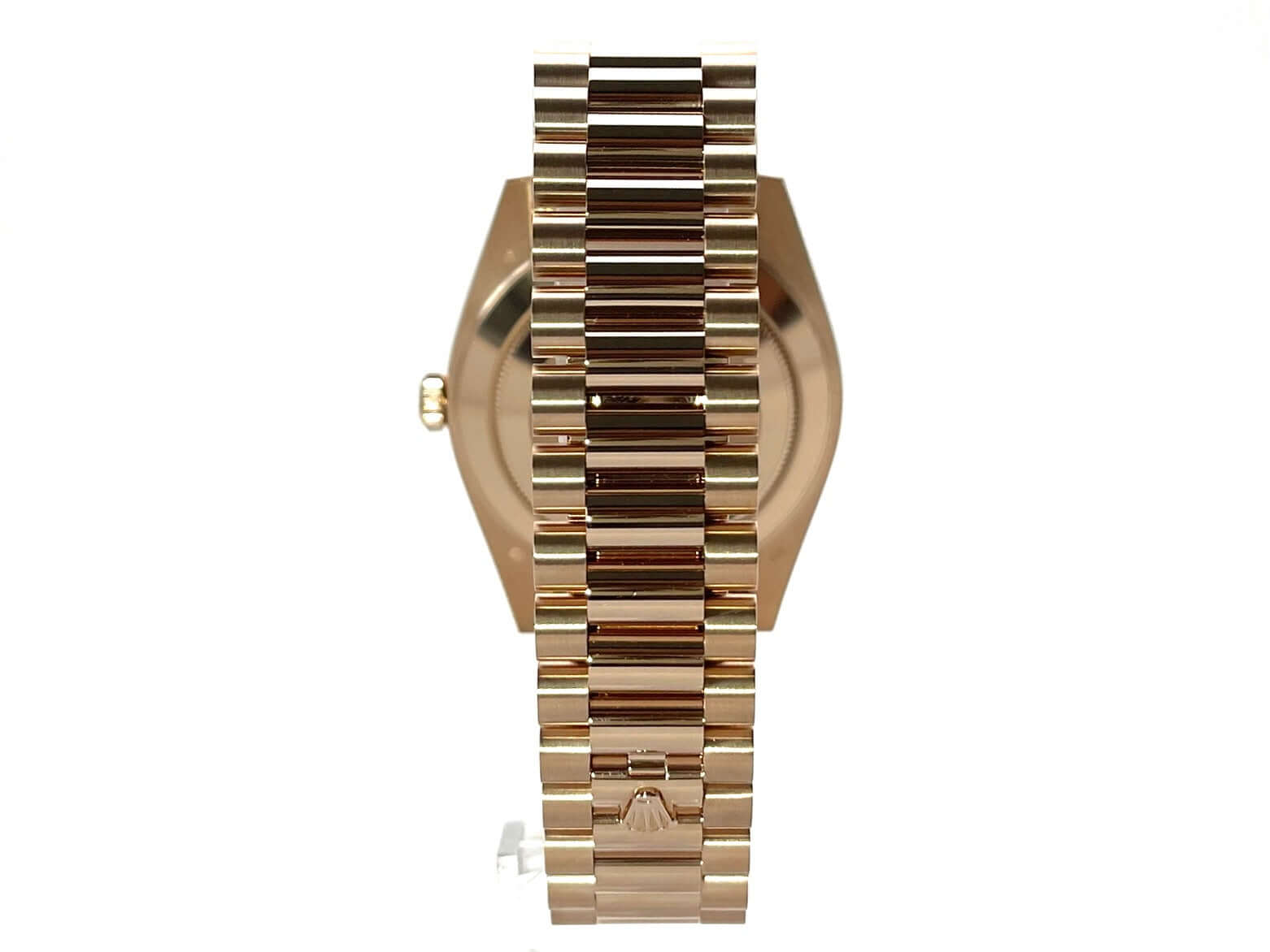 Gehäuse aus 18 kt Everose-Gold poliert, Gehäusedurchmesser 40 mm, Lünette aus 18 kt Everose-Gold geriffelt, Präsident Armband aus 18 kt Everose-Gold poliert und satiniert mit Faltschließe, Eisenkiesel Diamantzifferblatt, Automatikwerk, Rolex Manufakturkaliber 3255, Datum mit Glaslupe bei 3 Uhr, Wochentag, Chronometer, kratzfestes Saphirglas, verschraubter Boden aus 18 kt Everose-Gold, Wasserdicht bis zu 10 bar.
